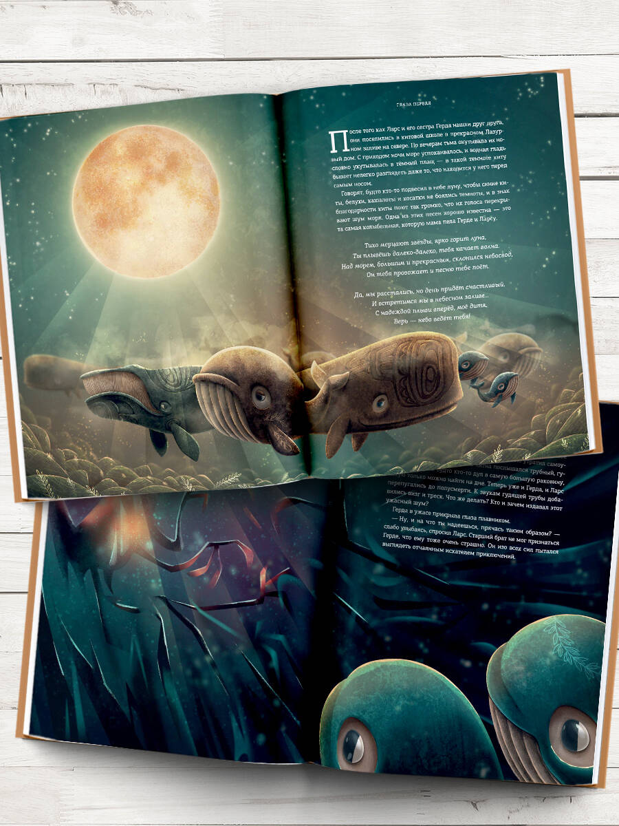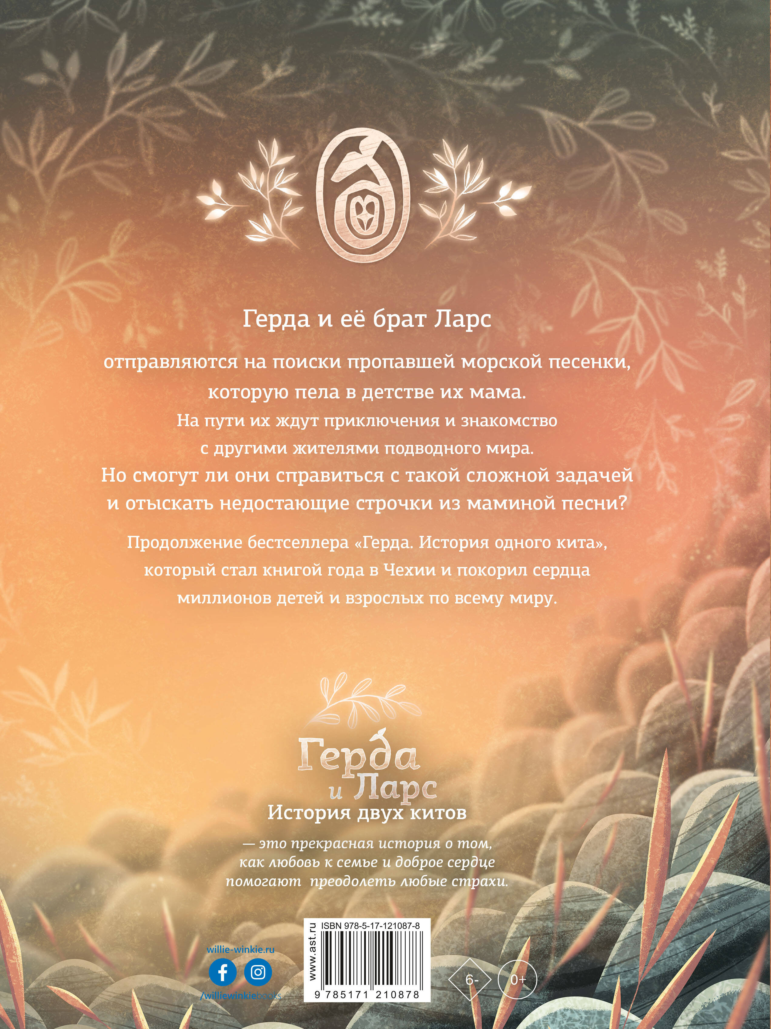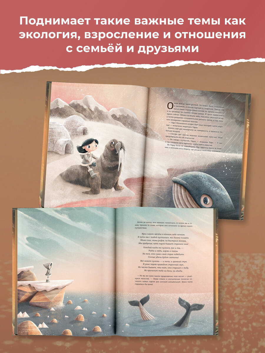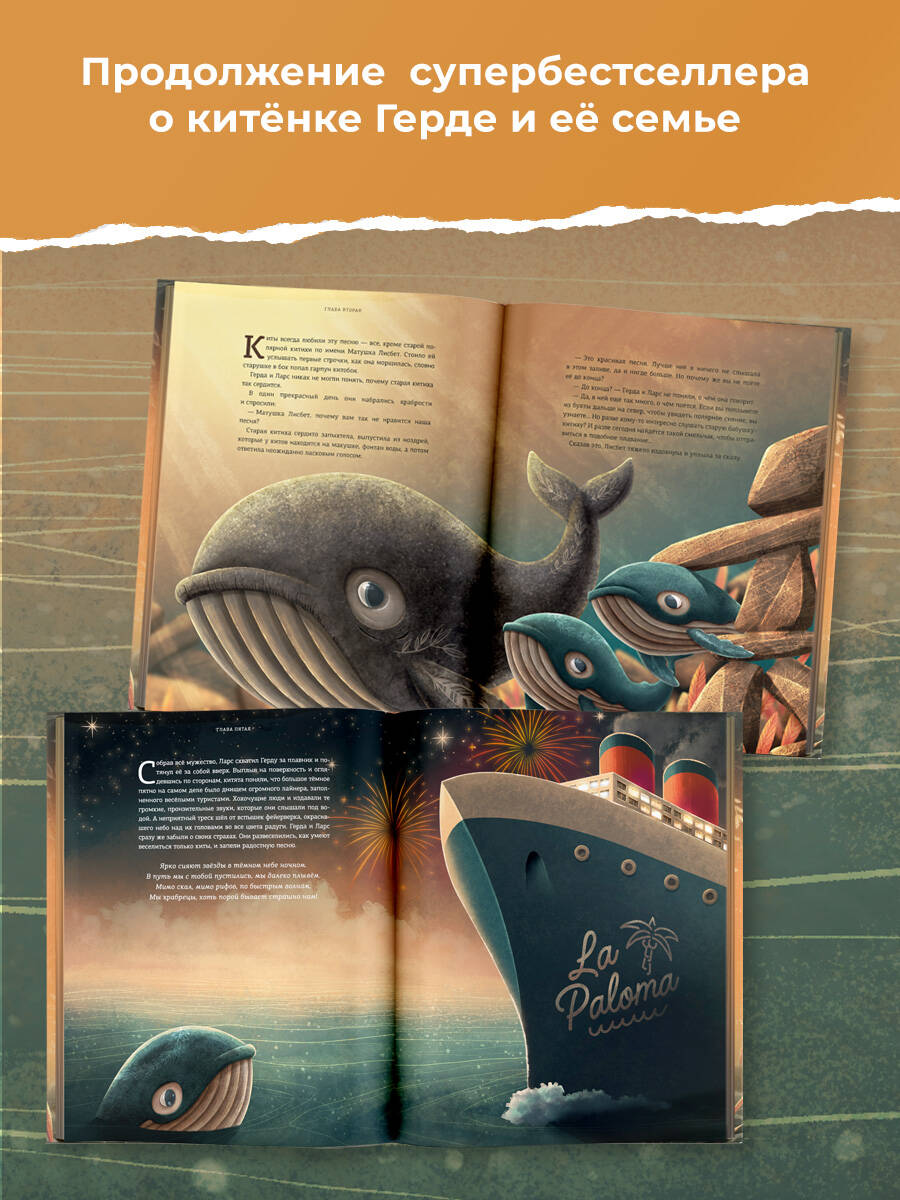 Продолжение супербестселлера, хита редакции «Вилли Винки» - истории о маленьком китёнке Герде! Китёнок Герда живет в уютном заливе вместе с братом Ларсом. Все время они напевают песенку, которая в детстве пела им мама… Но однажды старая китиха Лисбет рассказывает им, что колыбельная не закончена. Брат и сестра решают отправиться в невероятное путешествие туда, где рождается северное сияние - ведь только там можно обрести утраченные строки из песни… По пути они встретят разных обитателей моря - хмурых угрей, беззаботных дельфинов, загадочных медуз, попадут в шторм и поймут, как много ещё неизвестного приготовил большой мир для двух маленьких китят. Какие открытия ждут Герду и Ларса? Найдут ли они забытую колыбельную своей матери? И что поможет им победить любые страхи? Это невероятно красивая сказка об удивительном мире вокруг нас, где все живые существа - части одного целого.| Издательство | ИЗДАТЕЛЬСТВО "АСТ" |