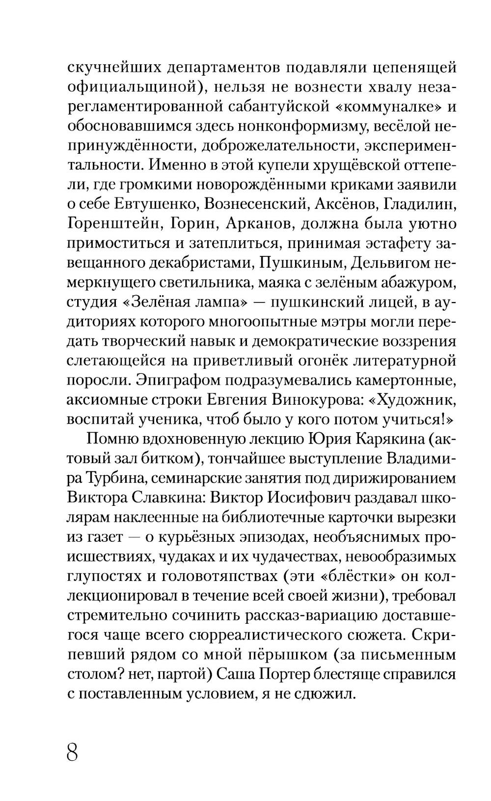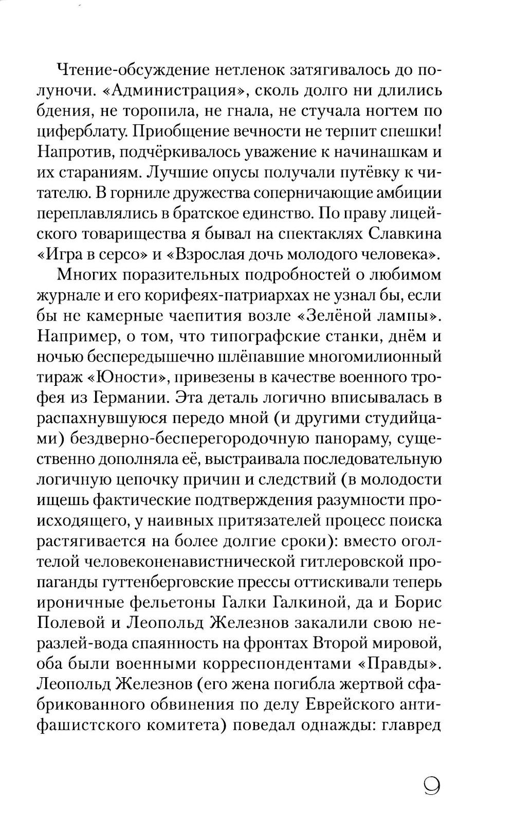 В 2026 году исполняется 50 лет «Зелёной лампе» - литературной студии при журнале «Юность», пронизанной пушкинской нотой. 50 лет тому назад в Москве, в здании на улице Горького, над рестораном «София», однажды прекрасным вечером (так начинаются романы, так пишется биография) Виктор Шкловский буквально «зажёг» в редакции «Юности» зелёную лампу... Многие, в том числе её первые студийцы, считают, что такой студии по уровню интеллекта и учеников больше не будет. Здесь, в этой небольшой, но достаточно просторной комнате говорила эпоха: Левитанский, Битов, Чухонцев, Окуджава, Евтушенко, Славкин. В то славное и незабвенное время напечататься в «Юности» (с её 5 миллионами тиража!) - вместе с Ахмадулиной, Вознесенским - было как слетать в космос. Частичка этого космоса, звёзды по имени «Зелёная лампа» и той «Юности», которая не повторится, - перед вами. В фотографиях, коротеньких биографических заметках и очерках очевидцев нашей юности. «Зелёная лампа» была создана при «Юности» и Московской писательской организации. В студии было 5 семинаров: прозы, поэзии, сатиры и юмора, публицистики и критики. Многие снимки печатаются впервые. Все герои книги публиковались в «Юности», а кто-то и занимался в «Зелёной лампе».| Издательство | ИПО "У Никитских ворот" |