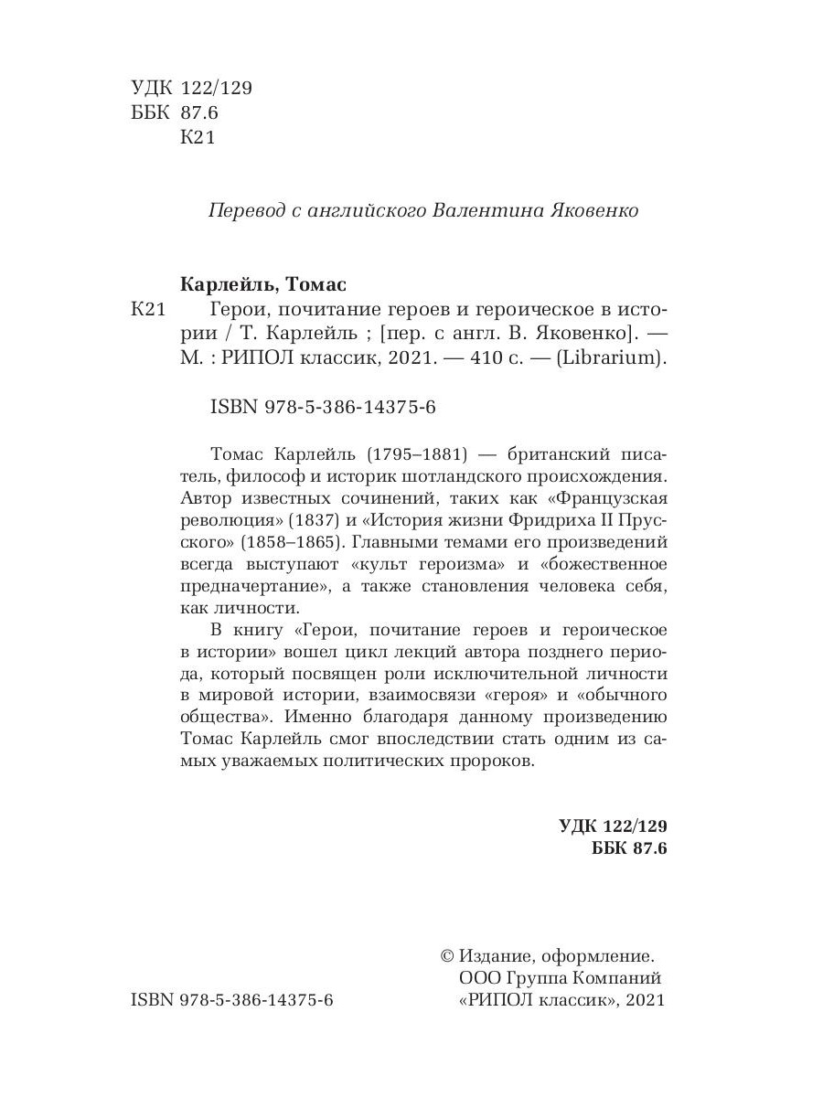 В книгу «Герои, почитание героев и героическое в истории» вошел цикл лекций автора позднего периода, который посвящен роли исключительной личности в мировой истории, взаимосвязи «героя» и «обычного общества». Именно благодаря данному произведению Томас Карлейль смог впоследствии стать одним из самых уважаемых политических пророков.