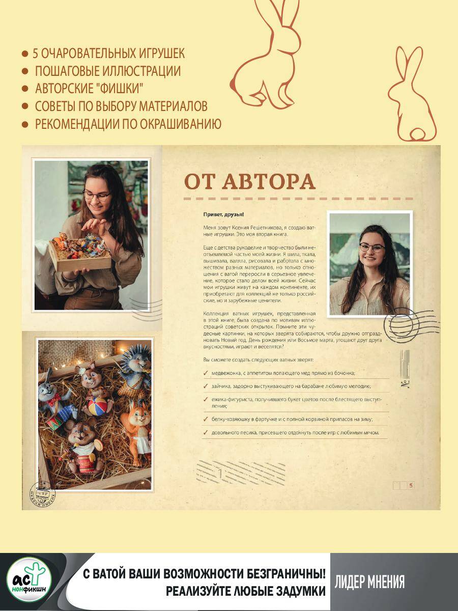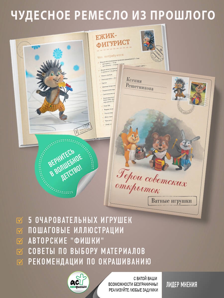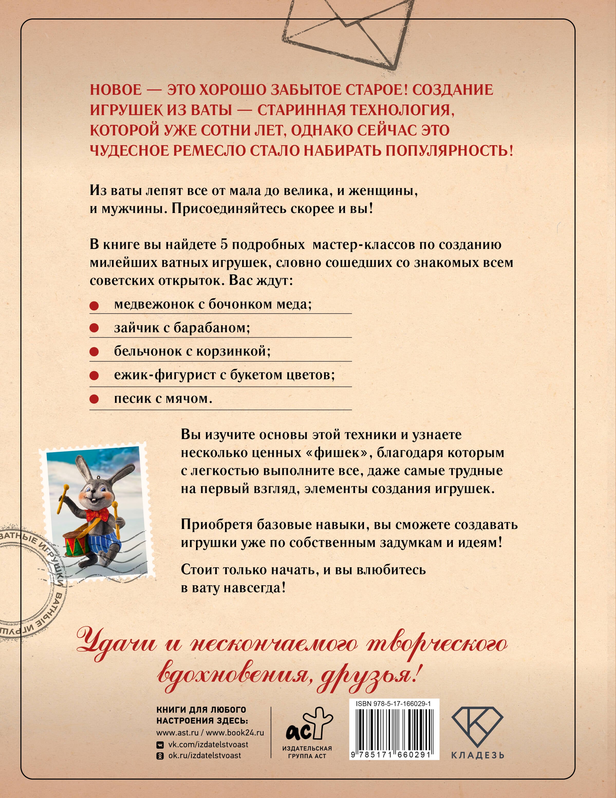 В этой книге собрано 5 мастер-классов по созданию веселых и добрых зверят, словно только что сошедших с советских открыток. На ее страницах вас ждут медвежонок с бочонком меда, зайчик с барабаном, бельчонок с корзинкой, ежик-фигурист с букетом цветов и песик с мячом. Все мастер-классы сопровождаются подробными описаниями и фотографиями. Вы узнаете, какие вата и нитки подходят для работы; как варить клейстер; как делать каркас; как обматывать и окрашивать заготовку и многое другое. Каждая из этих игрушек может стать красивым елочным украшением, оригинальным подарком для близких и стильным предметом интерьера.| Издательство | Издательство "АСТ" |