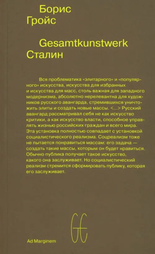 Gesamtkunstwerk Сталин (1988) - одно из самых известных исследований Гройса, лаконично и убедительно характеризующее сложную историческую преемственность русского авангарда, социалистического реализма и позднесоветского постмодернистского искусства.