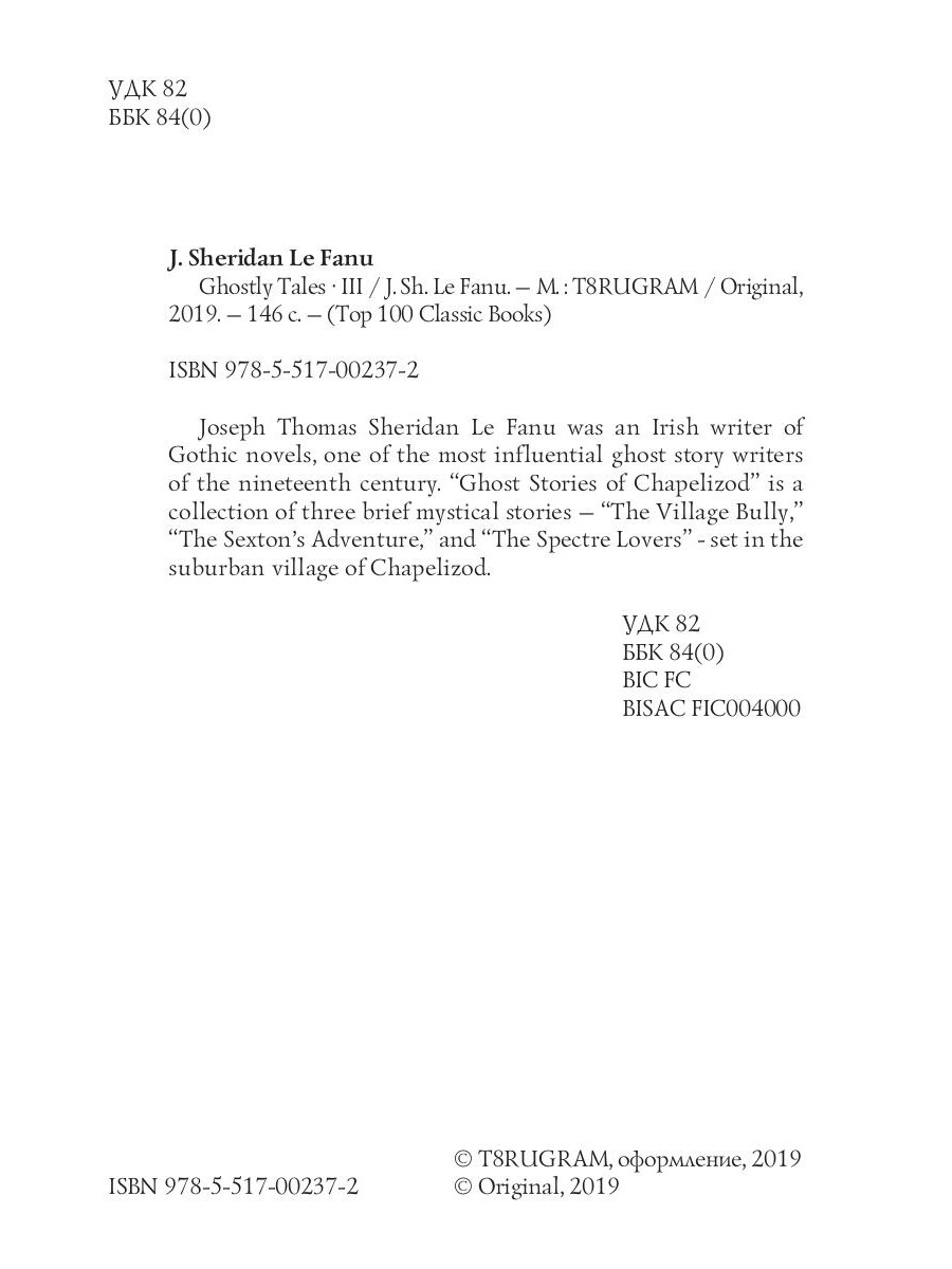 Joseph Thomas Sheridan Le Fanu was an Irish writer of Gothic novels, one of the most influential ghost story writers of the nineteenth century. "Ghost Stories of Chapelizod" is a collection of three brief mystical stories - "The Village Bully," "The Sexton's Adventure," and "The Spectre Lovers" - set in the suburban village of Chapelizod.| Издательство | Т8 RUGRAM |