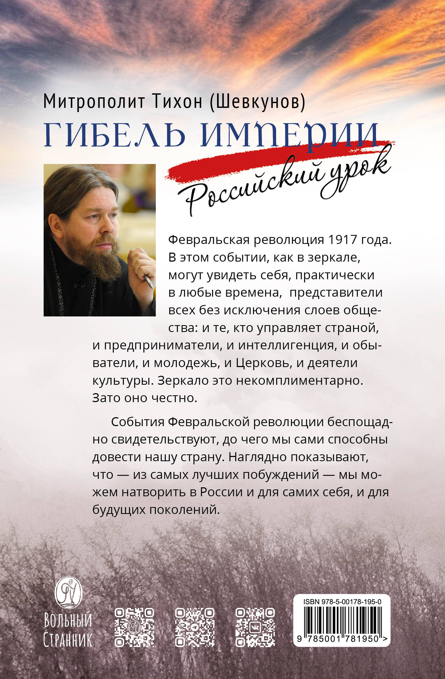 Новая книга митрополита Тихона (Шевкунова), автора бестселлера «Несвятые святые». Гибель могущественной Российской империи, построенной за многие века поколениями наших предков и сгинувшей за считаные дни - трагический и в то же время бесценный урок для наших соотечественников на все времена. В новой книге митрополит Тихон (Шевкунов) исследует события Февральской революции 1917 года и то, как в целом создают катаклизмы в России. Опираясь на научные источники, он приводит неизвестные ошеломляющие факты, предлагает материал для плодотворных размышлений и показывает, до чего мы сами способны довести нашу страну, что из самых лучших побуждений можем натворить в России и для самих себя, и для будущих поколений.| Издательство | ООО "Издательство "Эксмо" |