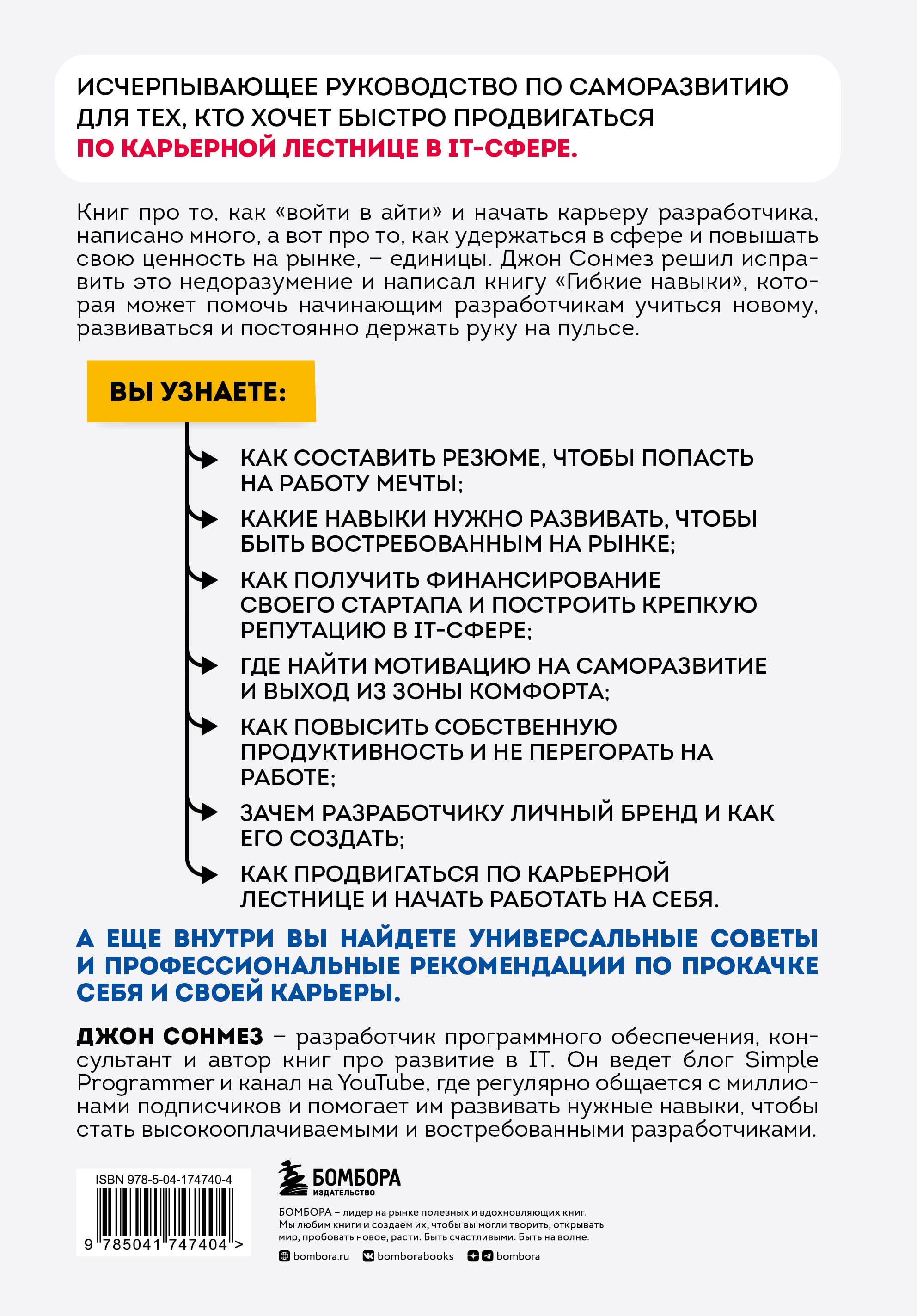 Исчерпывающее руководство по саморазвитию для тех, кто хочет быстро продвигаться по карьерной лестнице в IT-сфере. Книг про то, как «войти в айти» и начать карьеру разработчика, написано много, а вот про то, как удержаться в сфере и повышать свою ценность на рынке - единицы. Джон Сонмез решил исправить это недоразумение и написал книгу «Гибкие навыки», которая может помочь начинающим разработчикам учиться новому, развиваться и постоянно держать руку на пульсе. Вы узнаете: • как составить резюме, чтобы попасть на работу мечты; • какие навыки нужно развивать, чтобы быть востребованным на рынке; • как получить финансирование своего стартапа и построить крепкую репутацию в IT-сфере; • где найти мотивацию на саморазвитие и выход из зоны комфорта; • как повысить собственную продуктивность и не перегорать на работе; • зачем разработчику личный бренд и как его создать; • как продвигаться по карьерной лестнице и начать работать на себя. А еще внутри вы найдете универсальные советы и профессиональные рекомендации по прокачке себя и своей карьеры. Джон Сонмез - разработчик программного обеспечения, консультант и автор книг про развитие в IT. Он ведет блог Simple Programmer и канал на YouTube, где регулярно общается с миллионами подписчиков и помогает им развивать нужные навыки, чтобы стать высокооплачиваемыми и востребованными разработчиками.| Издательство | ООО "Издательство "Эксмо" |