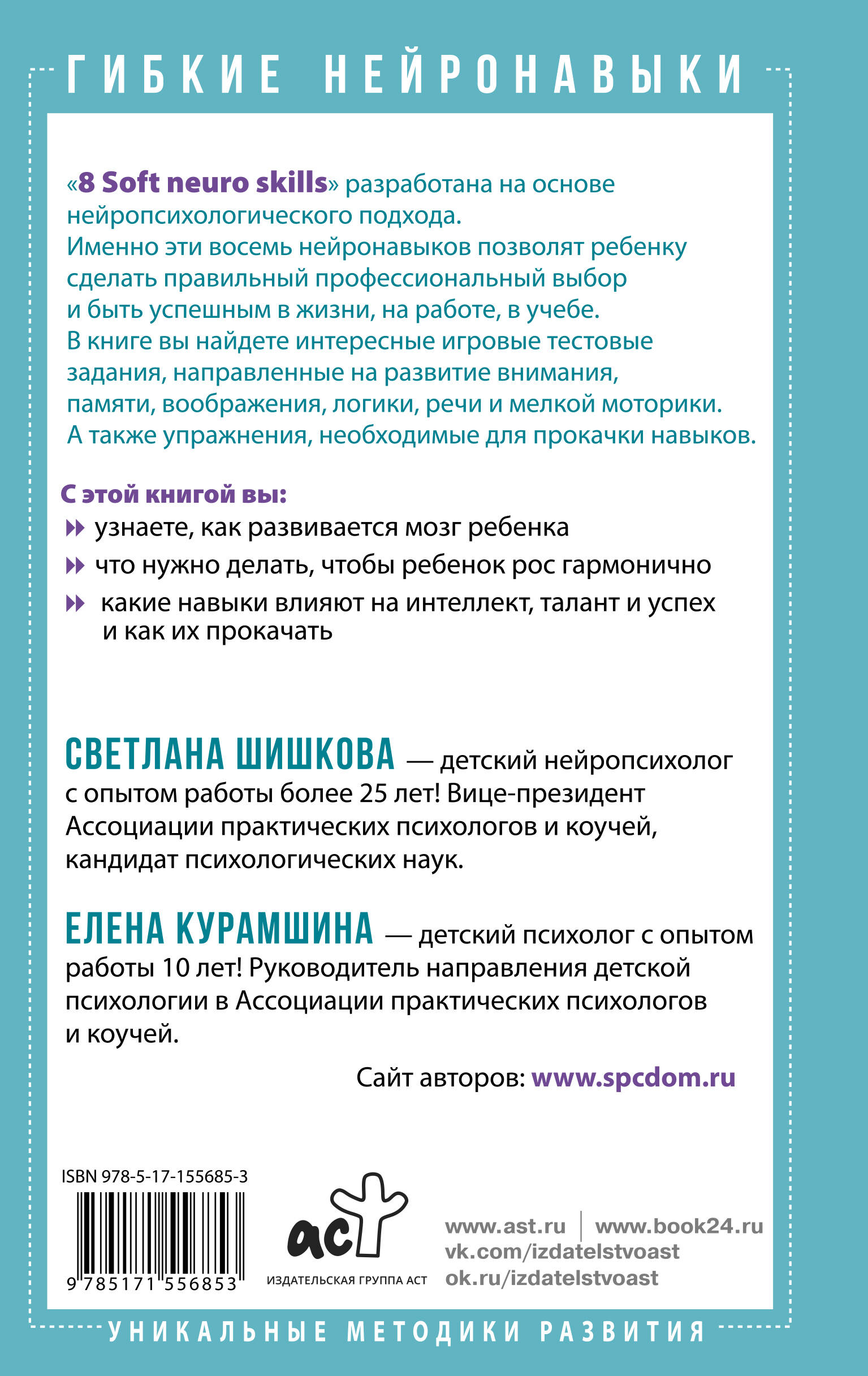 Садик, школа, вуз, работа - ступеньки, по которым предстоит подняться ребенку. Что нужно делать, чтобы он рос гармонично, пришел к успешному будущему и крепко стоял на ногах, а вам в процессе не пришлось пить валерьянку? "8 Soft neuro skills" - система развития восьми ключевых нейронавыков у ребенка. Это те самые первые кирпичики, которые закладывают основу благополучного будущего детей как в школе, так и во взрослой жизни! Так считают опытный нейропсихолог Светлана Шишкова и детский психолог Елена Курамшина. С этой книгой вы: узнаете, как развивается мозг ребенка; что нужно делать, чтобы ребенок рос гармонично; какие навыки влияют на интеллект, талант и успех и как их прокачать. В книге вы найдете интересные игровые тестовые задания, направленные на развитие внимания, памяти, воображения, логики, речи и мелкой моторики. А также упражнения, необходимые для прокачки навыков. Все задания разработаны так, чтобы они были увлекательными и для детей, и для вас! Светлана Шишкова - детский нейропсихолог с опытом работы более 25 лет! Вице-президент Ассоциации практических психологов и коучей, кандидат психологических наук. Елена Курамшина - детский психолог с опытом работы 10 лет! Руководитель направления детской психологии в Ассоциации практических психологов и коучей. Кому будет полезна книга? Родителям, которые поймут, как развиваются мышление, интеллект и таланты ребенка, и научатся корректировать эти процессы, чтобы он рос гармонично. Педагогам, воспитателям и логопедам, которые найдут комплекс интересных заданий на развитие или коррекцию определенных навыков и способностей детей. Детским психологам, нейропсихологам, семейным терапевтам, которые смогут применять в работе четкую, структурированную систему теории и практики и помогать родителям решать вопросы развития ребенка и развивать его навыки и таланты.| Издательство | ИЗДАТЕЛЬСТВО "АСТ" |