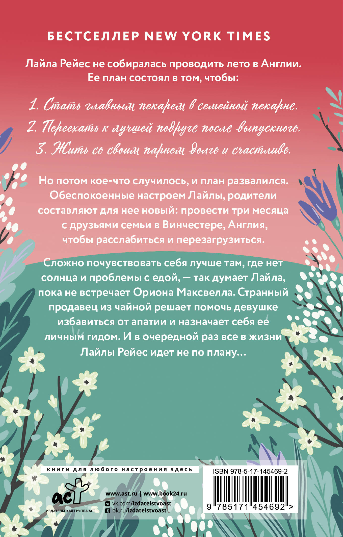 Лайла Рейес не собиралась проводить лето в Англии. Ее план состоял в том, чтобы: 1) Стать главным пекарем в семейной пекарне. 2) Переехать к лучшей подруге после выпускного. 3) Жить со своим парнем долго и счастливо. Но потом кое-что случилось, и план развалился. Обеспокоенные настроем Лайлы, родители составляют для нее новый: провести три месяца с друзьями семьи в Винчестере, Англия, чтобы расслабиться и перезагрузиться. Сложно почувствовать себя лучше там, где нет солнца и проблемы с едой, - так думает Лайла, пока не встречает Ориона Максвелла. Странный продавец из чайной решает помочь девушке избавиться от апатии, назначая себя ее личным гидом. И в очередной раз все в жизни Лайлы Рейес идет не по плану…| Издательство | АСТ |