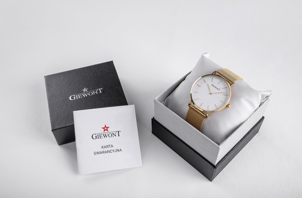 Гевонт Вы цените классику, но в то же время хотите дополнить свой стиль элементами, придающими ему еще больше характера? Выбирайте кварцевые часы от Giewont. Принимайте решение, выбирайте качественные материалы и проверенный дизайн, который будет сопровождать вас каждый день, наполненный активностью, уверенностью в себе. женские часы Giewont GW1970-1 Бренд: Giewont МЕХАНИЗМ: : Кварцевый Циферблат: Аналоговый Корпус: Нержавеющая сталь КРИСТАЛЛ: Минерал с повышенной устойчивостью к царапинам и случайным ударам Браслет: Нержавеющая сталь, тип Mesh - регулируемый с возможностью предварительного расстегивания ВОДОНЕПРОНИЦАЕМОСТЬ: 3 бар Гипоаллергенный: без никеля - безопасен для аллергиков Корпус: 40 Циферблат: 36 Толщина: 7.6 Ширина браслета: 20 Окружность браслета: макс. 235 Цветовая гамма: Корпус: золото Циферблат: белые часовые метки: золото Стрелки: золото Браслет: женские золотые часы Giewont GW1970-1 оснащены часовой и минутной стрелками, и эта простота добавляет женским рукам элегантности и стиля. - оригинальная сумка с логотипом бренда Giewont - и поддержка гарантийным талоном