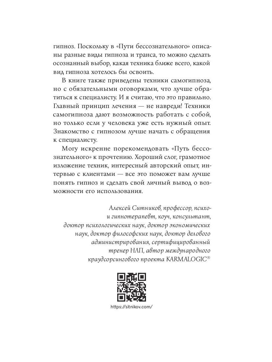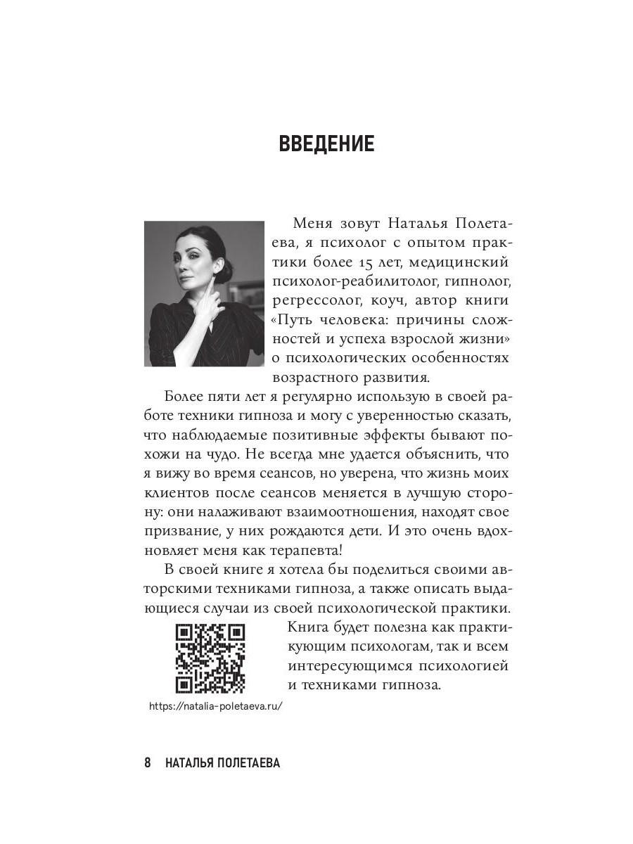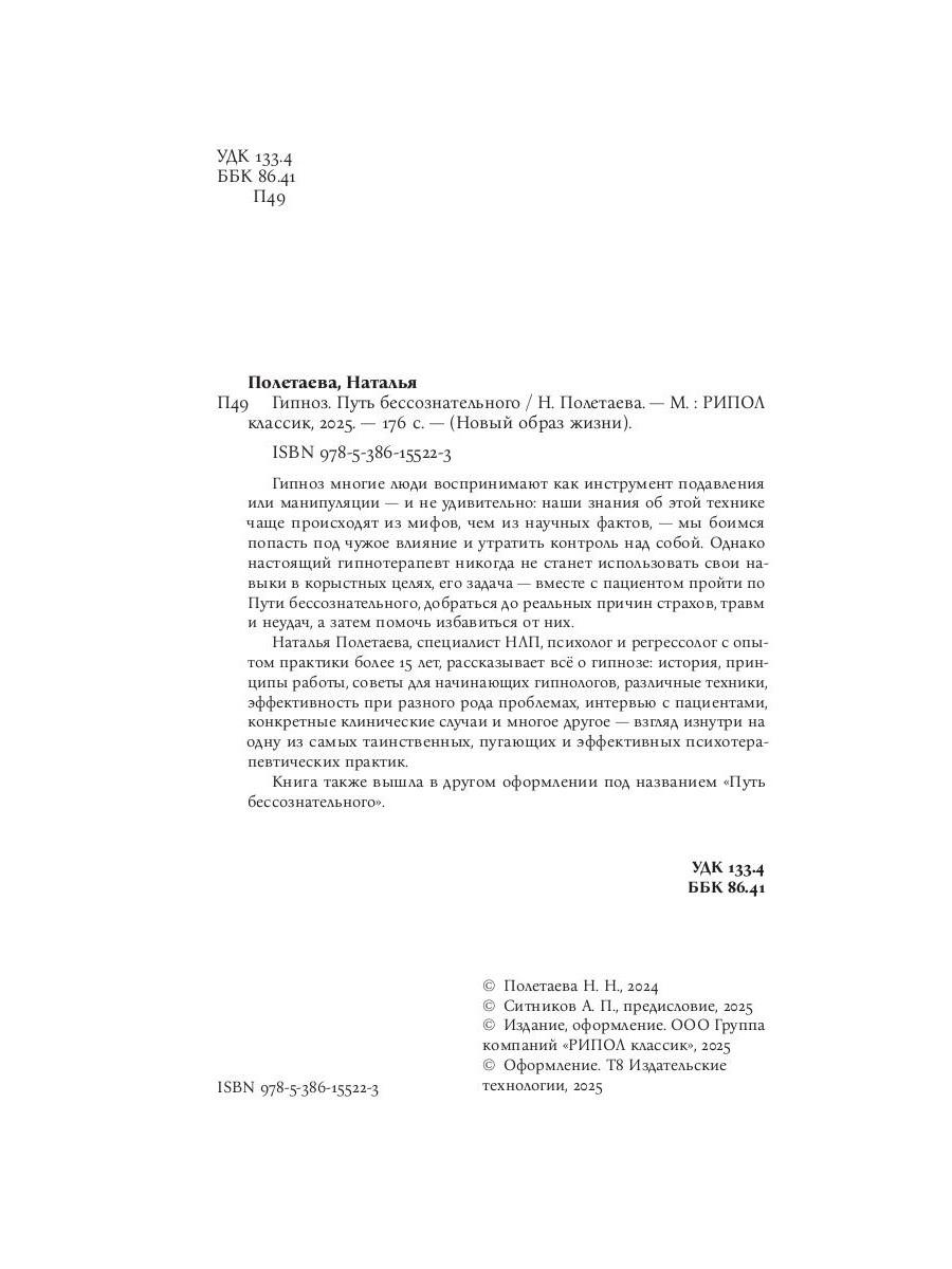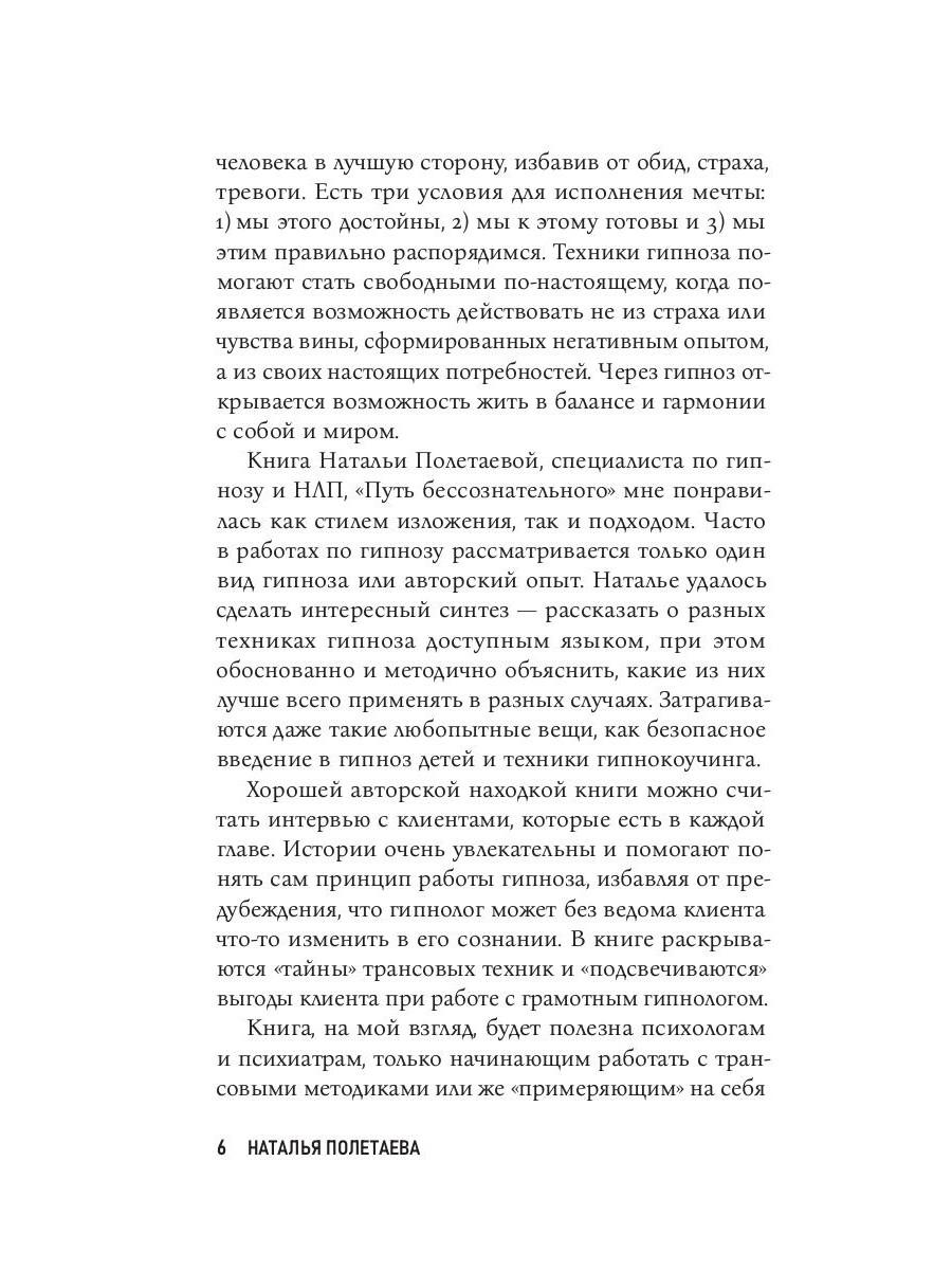 Гипноз многие люди воспринимают как инструмент подавления или манипуляции - и не удивительно: наши знания об этой технике чаще происходят из мифов, чем из научных фактов, - мы боимся попасть под чужое влияние и утратить контроль над собой. Однако настоящий гипнотерапевт никогда не станет использовать свои навыки в корыстных целях, его задача - вместе с пациентом пройти по Пути бессознательного, добраться до реальных причин страхов, травм и неудач, а затем помочь избавиться от них. Наталья Полетаева, специалист НЛП, психолог и регрессолог с опытом практики более 15 лет, рассказывает всё о гипнозе: история, принципы работы, советы для начинающих гипнологов, различные техники, эффективность при разного рода проблемах, интервью с пациентами, конкретные клинические случаи и многое другое - взгляд изнутри на одну из самых таинственных, пугающих и эффективных психотерапевтических практик. Книга также вышла в другом оформлении под названием «Путь бессознательного».| Издательство | Рипол Классик |