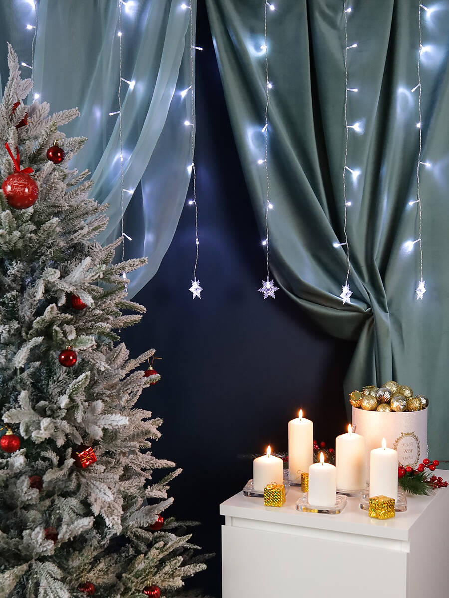 Аннотация: Гирлянда Бахрома со снежинками 5х0,8м, прозр. нить, 216 белые лампы, 8 реж. Для исп. в доме НУ-3638