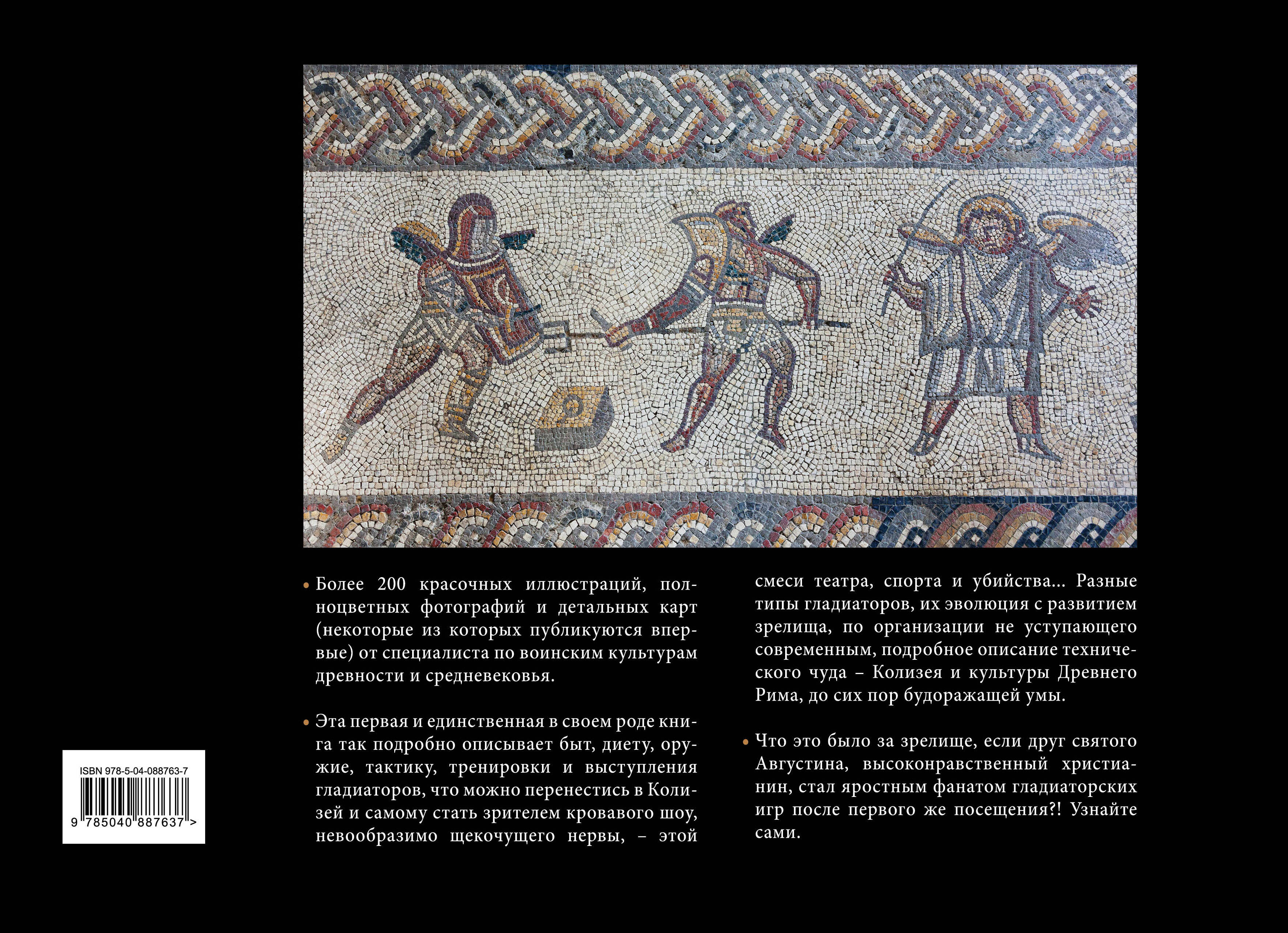 Как на самом деле выглядели гладиаторские бои и почему они до сих пор будоражат воображение любителей истории по всему миру? Что это было за зрелище, если друг святого Августина, высоконравственный христианин, стал яростным фанатом гладиаторских игр после первого же посещения? «Гладиаторы. Битва за жизнь, славу и свободу» от специалиста по воинским культурам древности и Средневековья Бена Хаббарда - первая и единственная в своем роде книга, подробно рассказывающая историю зарождения и развития гладиаторской культуры в Древнем Риме. Как устраивались игры и как они изменялись при каждом новом правителе, как были устроены гладиаторские школы... Разные типы гладиаторов, их эволюция с развитием зрелища, по организации не уступающему современным, быт, диета, оружие, тактика, тренировки и многое другое - в красочном иллюстрированном издании, снабженном цитатами из исторических документов и интересным описанием культуры Древнего Рима, до сих пор будоражащей умы. Книга содержит 200 красочных иллюстраций, полноцветных фотографий и детальных карт, некоторые из которых публикуются впервые.| Издательство | ООО "Издательство "Эксмо" |
