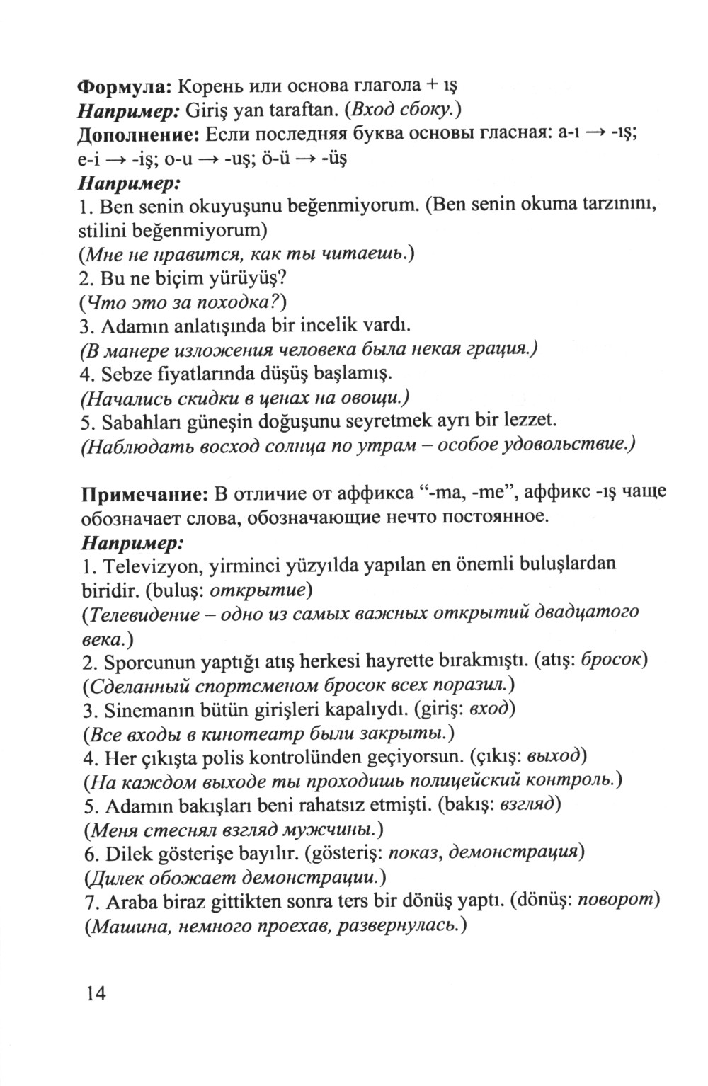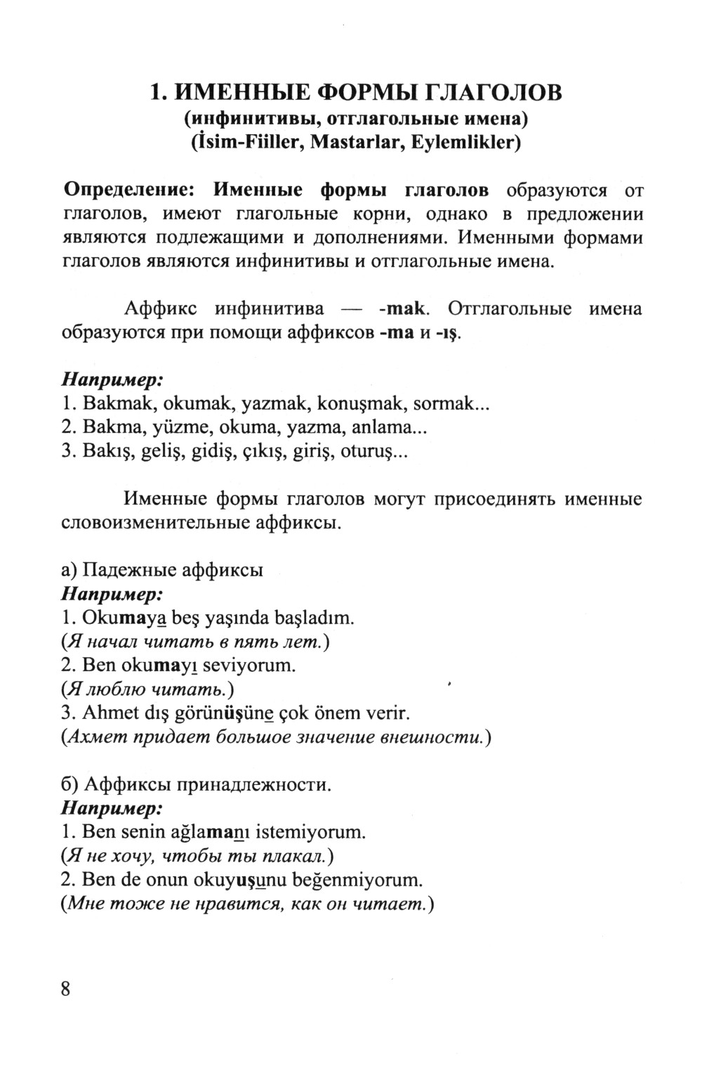 В настоящей книге дается подробное изложение одной из наиболее важных при изучении турецкого языка тем - образование и употребление глагольных форм ("FIILIMSI": причастия, деепричастия, отглагольные имена, инфинитивы), а также союзы, послелоги, частицы, составные глаголы, «нереальные» наклонения глаголов. Использование каждой конструкции поясняется примерами. Коммента рии позволяют понять нюансы употребления синонимичных форм. Книга будет, несомненно, полезна всем, кто совершенствует свой турецкий язык, а также может быть использована как самоучитель и как справочное пособие, систематизирующее знания по грамматике турецкого языка.| Издательство | ЛЕНАНД |