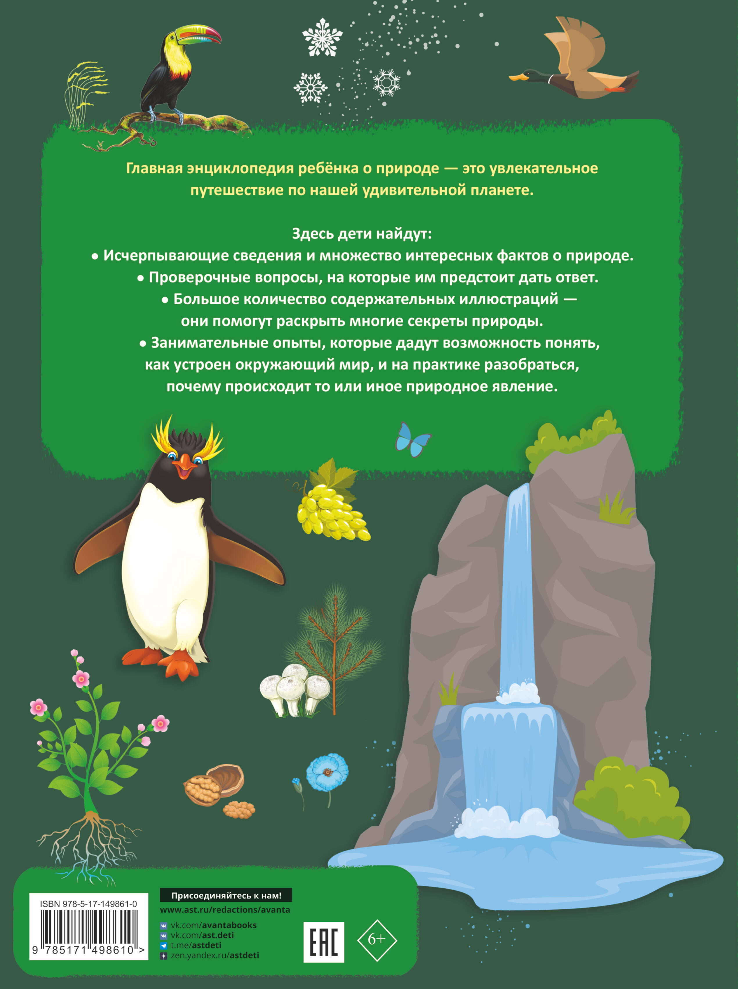 Почему Арктика так называется? Бывают ли одинаковые снежинки? У какого урагана есть хобот? Почему у песца маленькие уши, а у фенека - большие? Где летом день длится несколько месяцев? Отчего возникает полярное сияние? Почему листья осенью опадают, а весной появляются вновь? Чем питаются растения? Когда образуется роса, а когда иней? Чем отличается гололёд от гололедицы? На страницах этой познавательной энциклопедии дети найдут ответы на все свои вопросы, а множество зрелищных иллюстраций помогут им раскрыть самые разные секреты природы. Кроме того, здесь есть занимательные опыты, которые не только познакомят ребят с окружающим миром, но и помогут на практике разобраться, почему происходит то или иное природное явление. Материал в издании хоть и систематизирован, но подан так, чтобы информация была понятна, а главное интересна юному читателю. Эта книга - увлекательное путешествие по нашей живой планете, она может стать главной энциклопедией для вашего ребёнка. Для младшего школьного возраста.| Издательство | ИЗДАТЕЛЬСТВО "АСТ" |