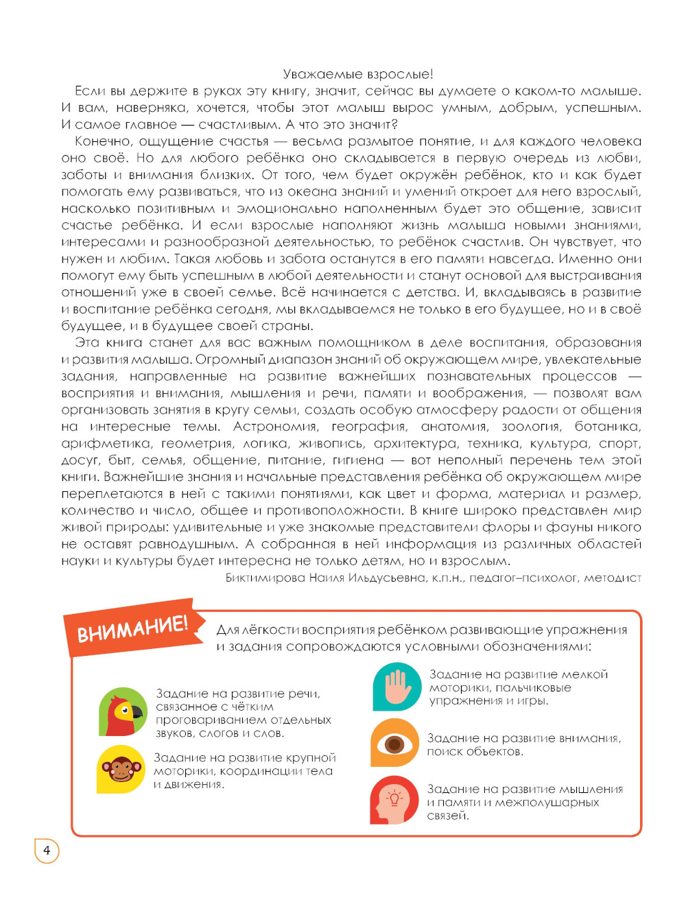 Эта книга не оставит равнодушными ни детей, ни взрослых - она очень красочная и познавательная! Фотообъекты чётко структурированы, начиная с игрушек малыша и заканчивая Солнечной системой. Также мы включили в издание такие интересные главы, как «Йога - подражание животным», «Рекордсмены мира фауны», «Животные в очках», и большие разворотные иллюстрации. Занимательные задания к разделам разовьют внимание и мышление вашего дошкольника. Книга рассчитана на длительное использование, а благодаря богатому наполнению она не зря называется главной!| Издательство | ООО "Издательство "Эксмо" |