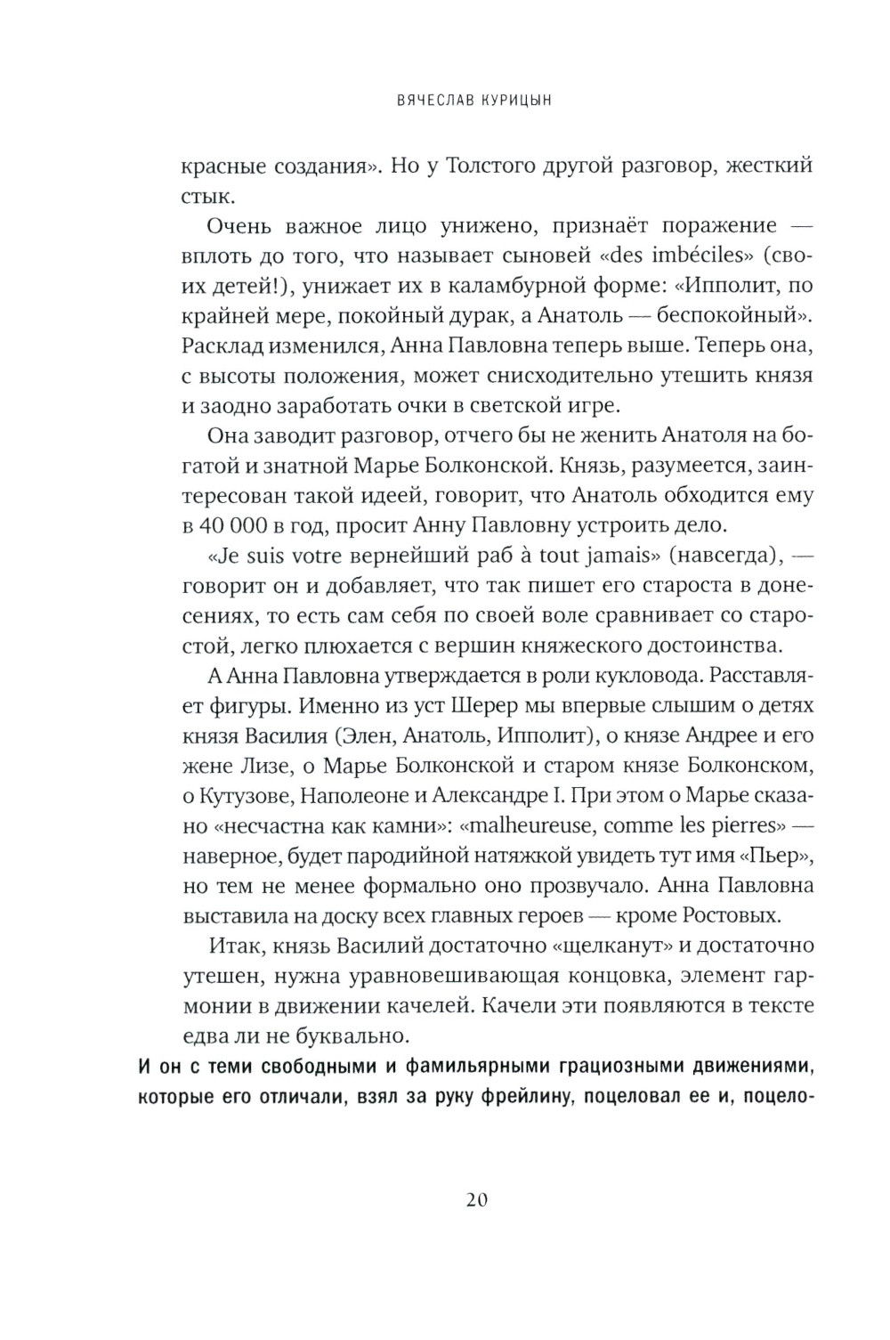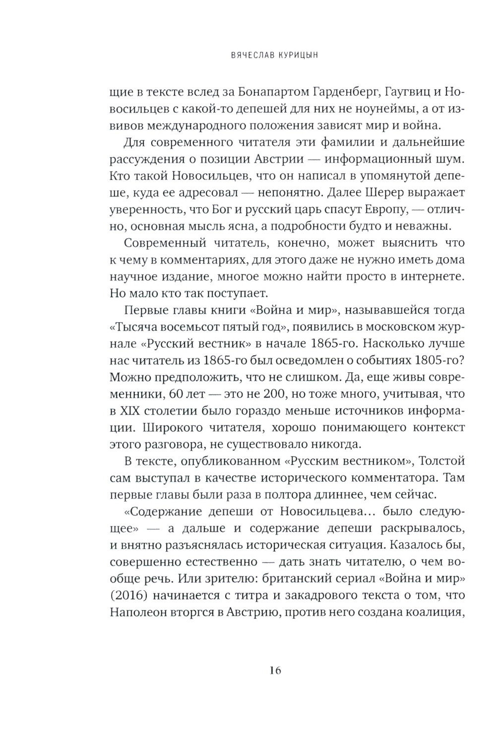 Новая книга Вячеслава Курицына - попытка отнестись к «Войне и миру» как к литературному аттракциону. Автор описывает удивительную структуру эпопеи Толстого (невероятное количество точек зрения и ракурсов, парадоксальный ритмический рисунок, обилие внутренних рифм, нарушения хронологии, закадровые голоса, «набоковские» узоры на другой стороне текста) и постепенно приходит к выводу, что все эти эффекты содержательны. В последней части книги высказываются предположения, какие черты российской цивилизации и факты биографии Толстого породили именно такую форму «Войны и мира».| Издательство | Время |