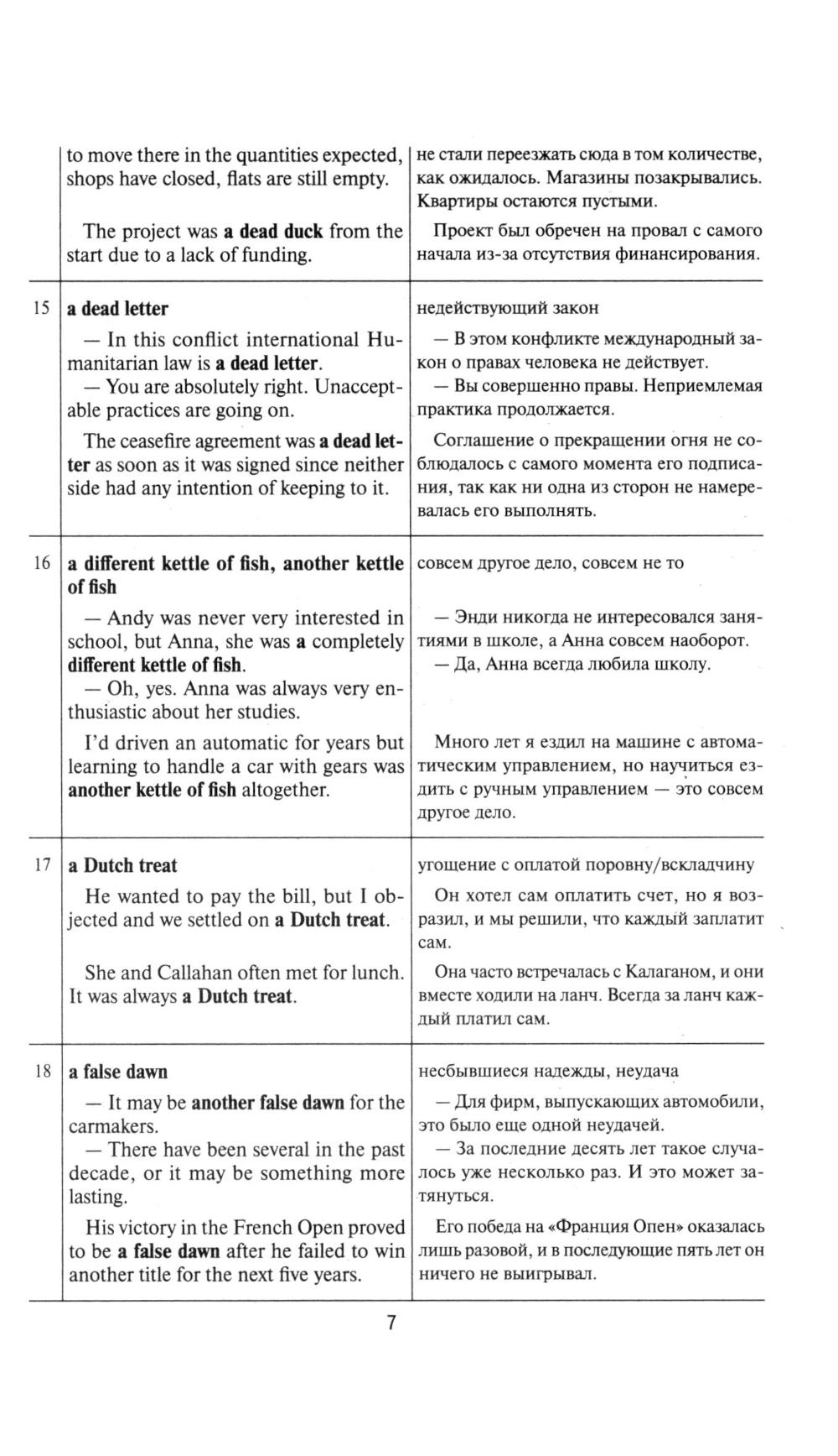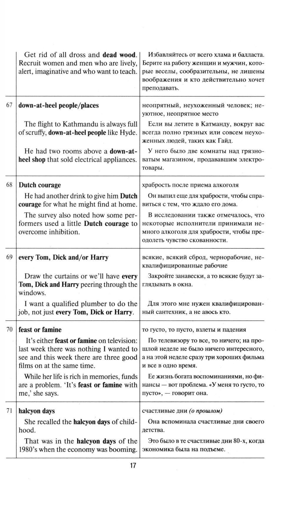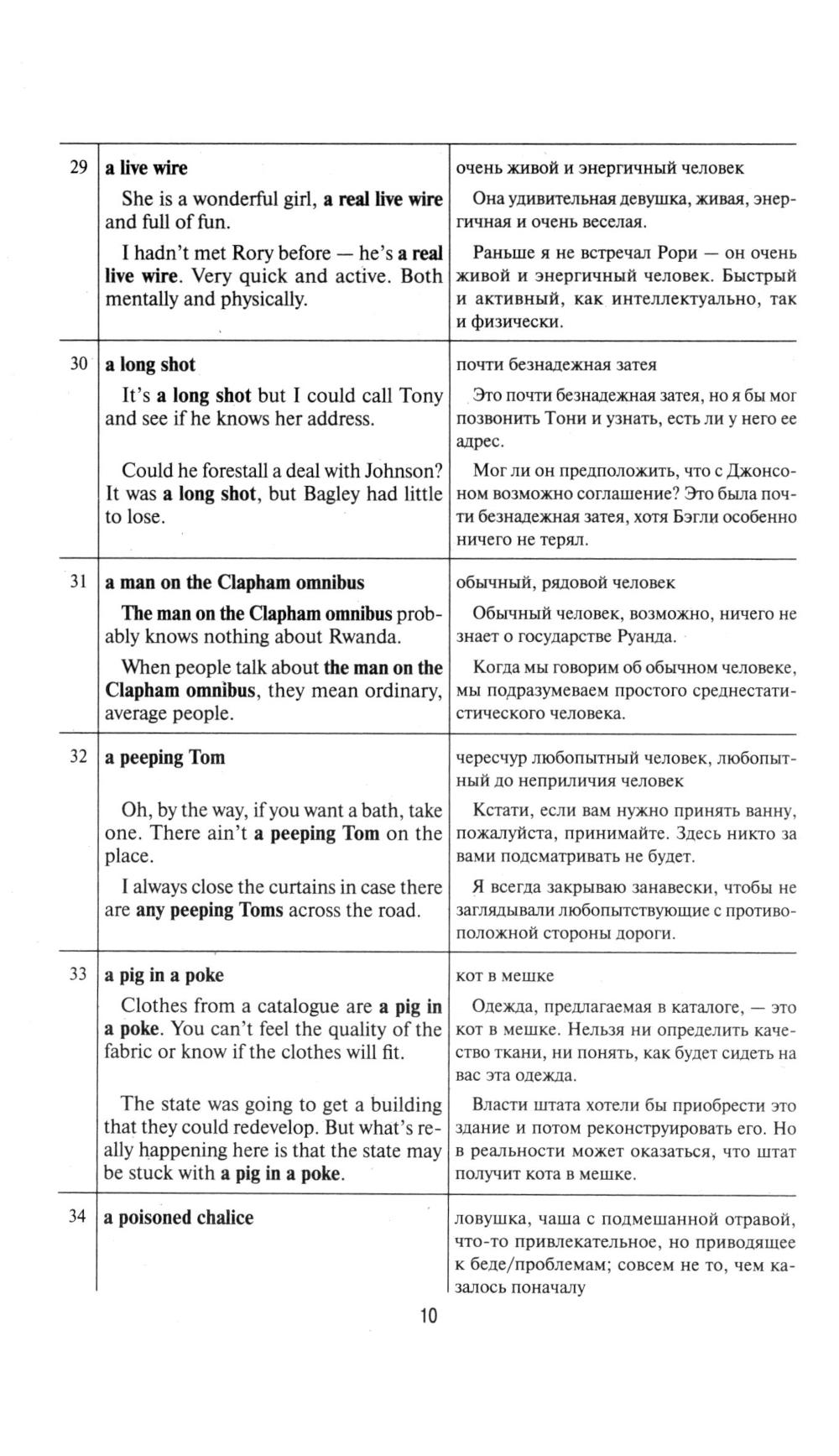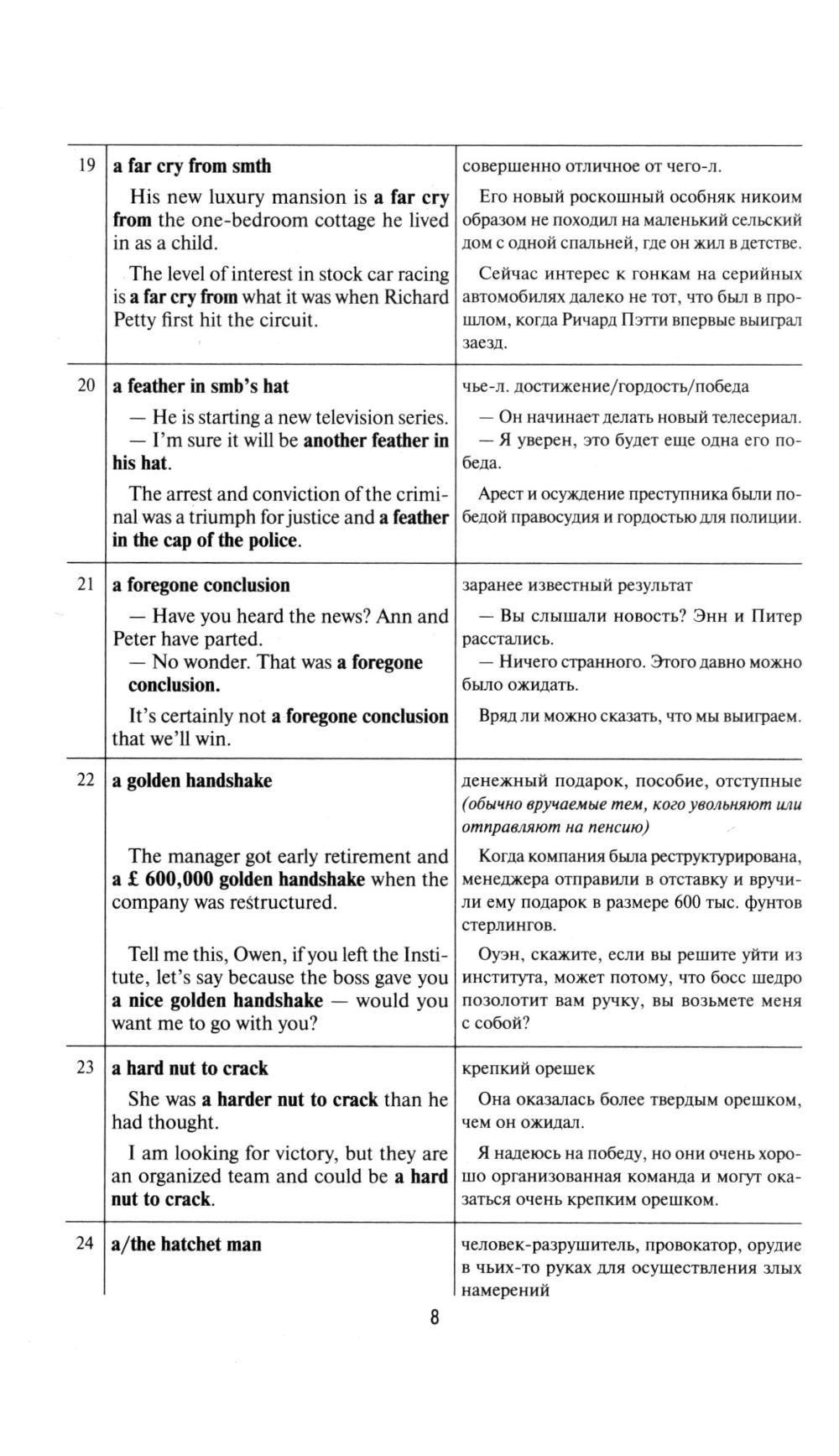 Данный словарь-справочник включает несколько сотен идиом, наиболее часто употребляющихся в современном английском языке. При отборе автор руководствовался популярностью тех или иных идиом, их ролью в языке. Данные устойчивые выражения являются органической частью языка любого носителя, они необходимы для беглой, грамотной, выразительной речи. Отобранные идиомы систематизированы по структурному принципу. Первая часть пособия содержит идиомы-словосочетания существительных, вторая - идиомы-глагольные словосочетания. Для удобства читателя идиомы даются в алфавитном порядке.| Издательство | Проспект |