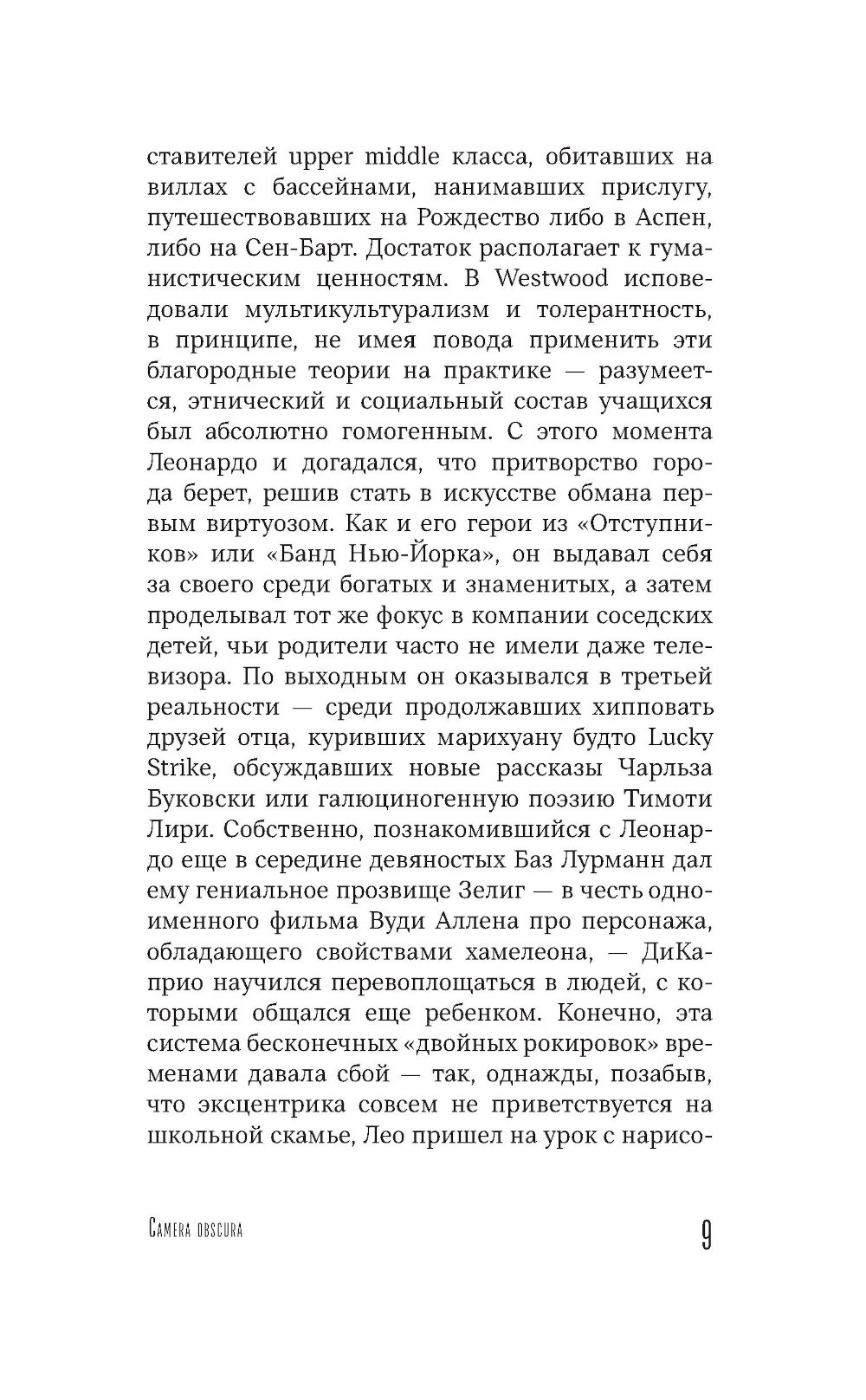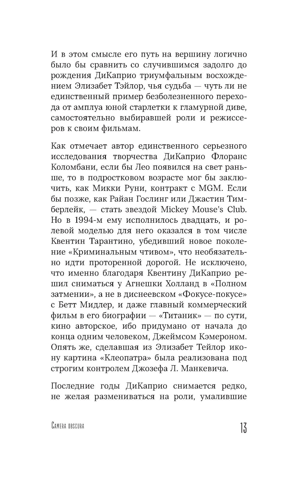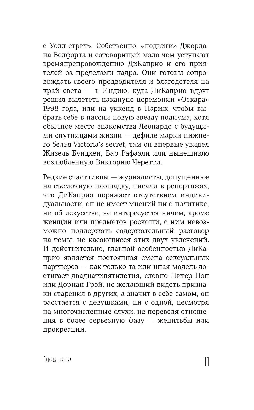Леонардо ДиКаприо сопровождает нас из года в год, он - неотъемлемая часть медиапейзажа, он дарит нам волшебные мгновения в той самой темной комнате, он - практически часть семьи, но вместе с тем недостижим и загадочен, словно Мона Лиза, написанная гением, в честь которого пятьдесят лет назад он и был назван. В книге, что вы держите в руках, речь пойдет исключительно о киноискусстве, автор решил отнестись с уважением к жизненному кредо своего героя - оставить его там, где ему комфортнее всего, внутри camera obscura, настоящего ДиКаприо можно разглядеть только в сумраке кинозала.| Издательство | Эксмо |