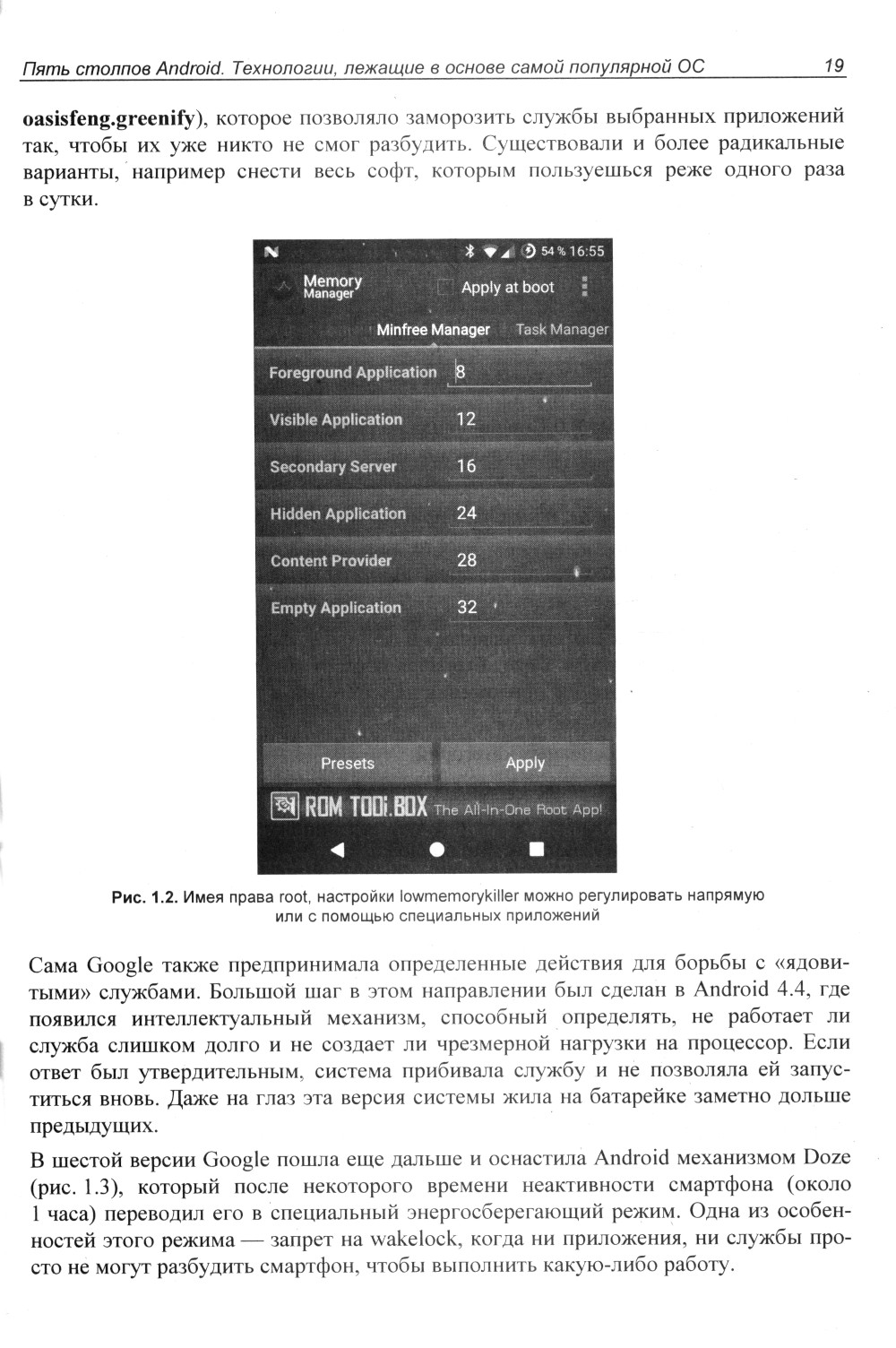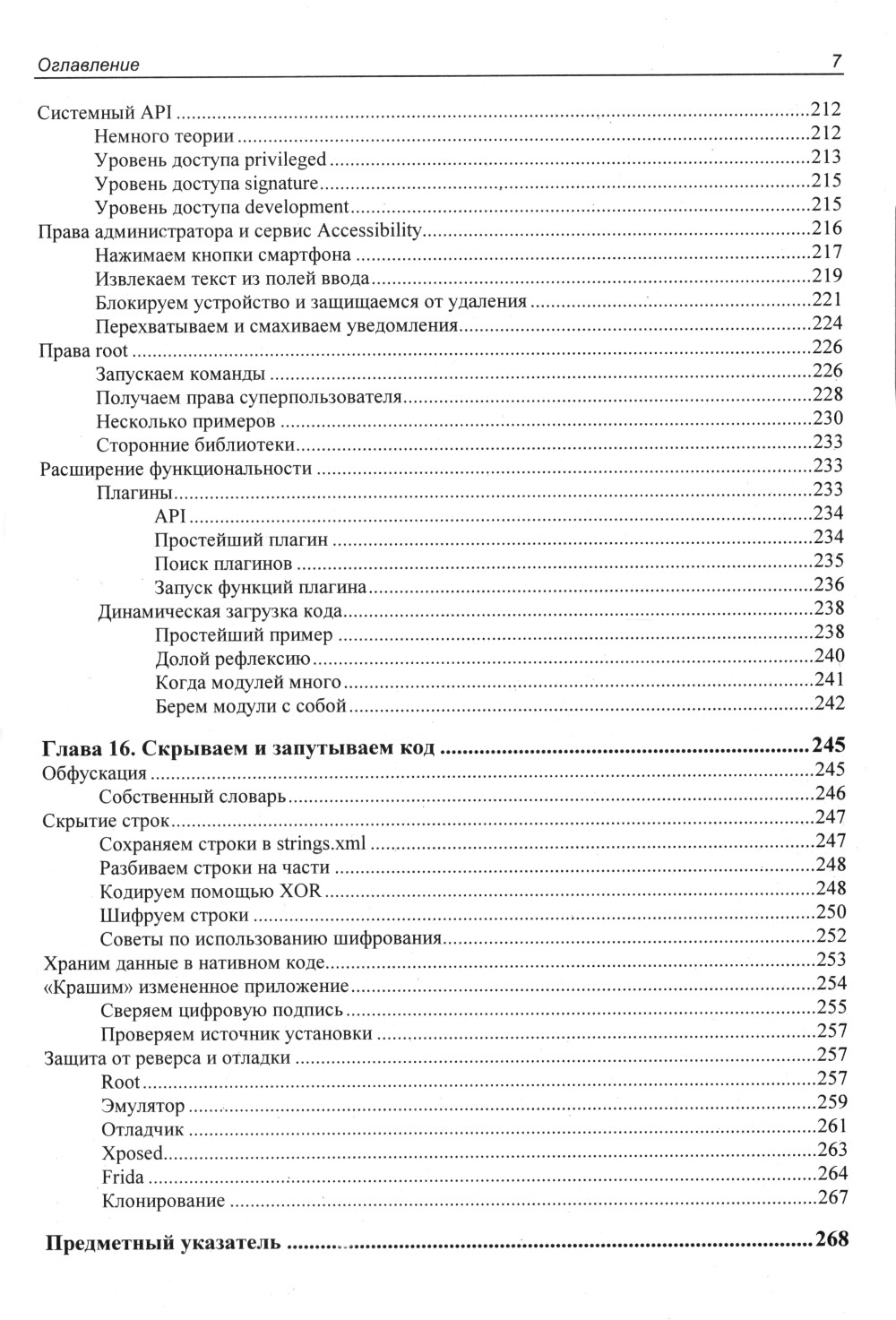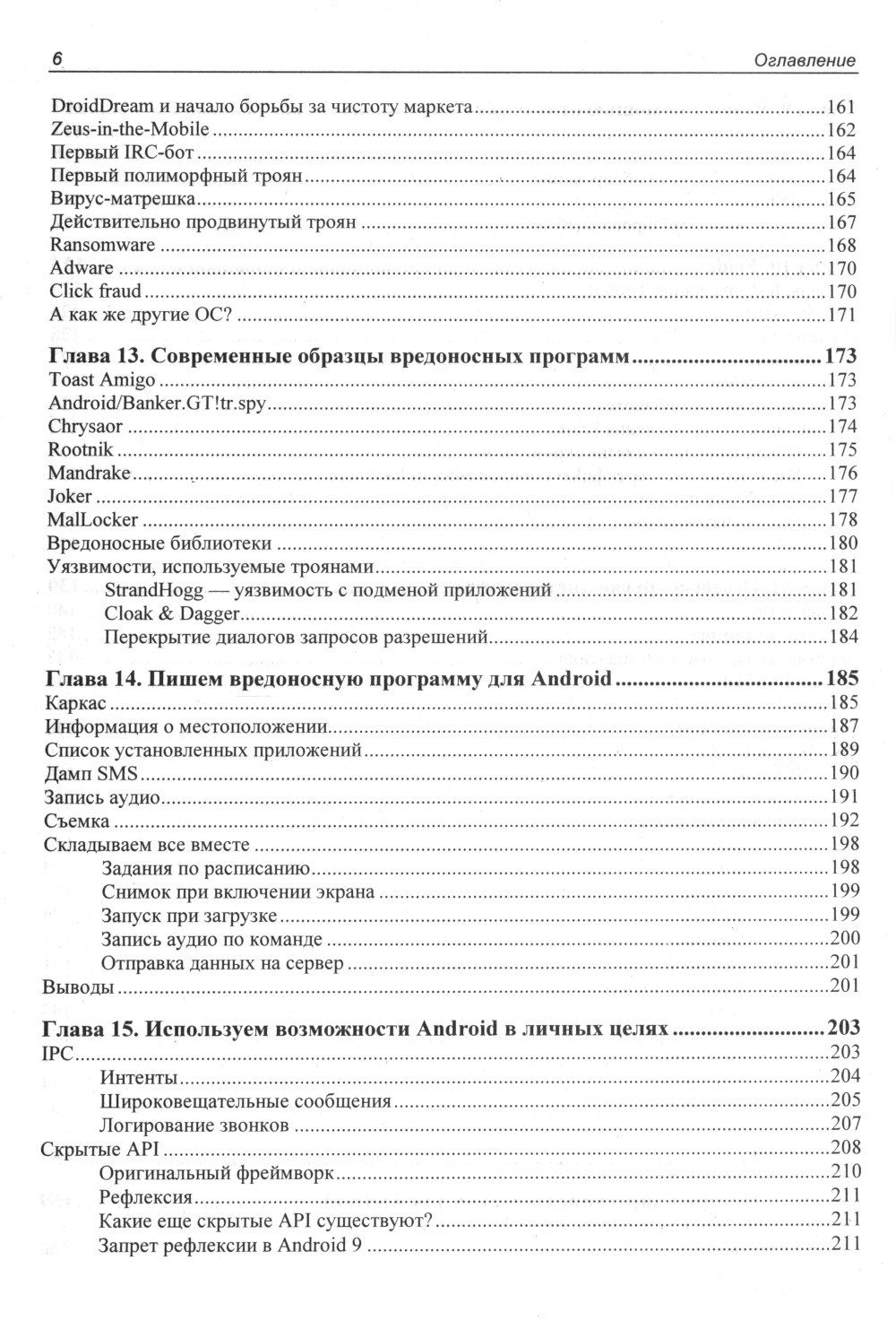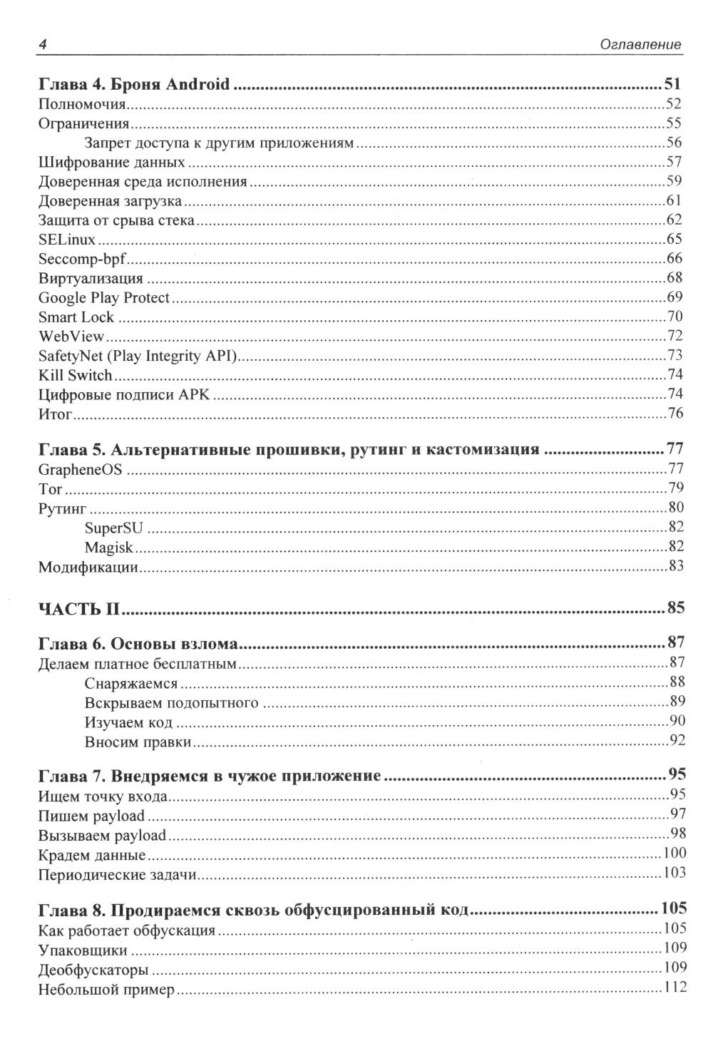 Рассмотрена внутренняя архитектура ОС Android, используемые ею разделы и файловые системы, принцип работы механизмов обновления и внутренних инструментов безопасности. Рассказано о разграничении доступа в ОС Android, о привилегиях, методах получения прав root, кастомизации и установке нестандартных прошивок. Описаны инструменты для дизассемблирования, отладки и анализа кода мобильных приложений, приведены примеры модификации кода с целью изменения функций ПО и внедрения в приложение сторонних модулей. Даны подробные рекомендации по деобфускации кода и обходу антиотладки, а также практические советы по защите собственных приложений от декомпиляции и исследования. Приводятся сведения о вредоносных программах для платформы Android, используемых ими уязвимостях, даны примеры кода таких программ. Рассказывается об использовании стандартных функций Android в нестандартных целях и способах противодействия вредоносному ПО. Во втором издании приводятся сведения об изменениях и нововведениях в Android 14.