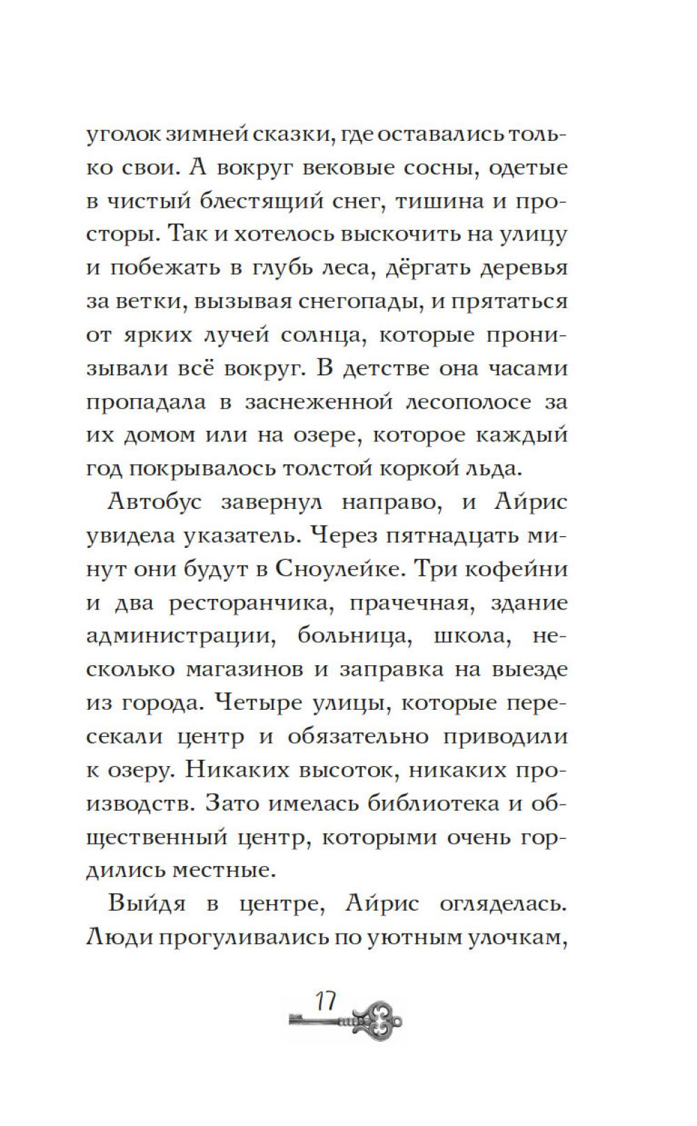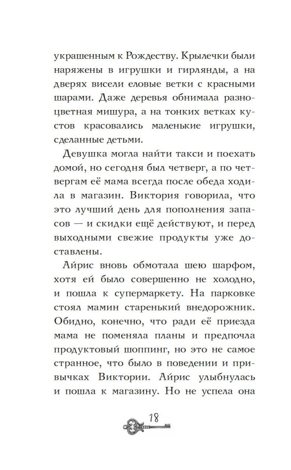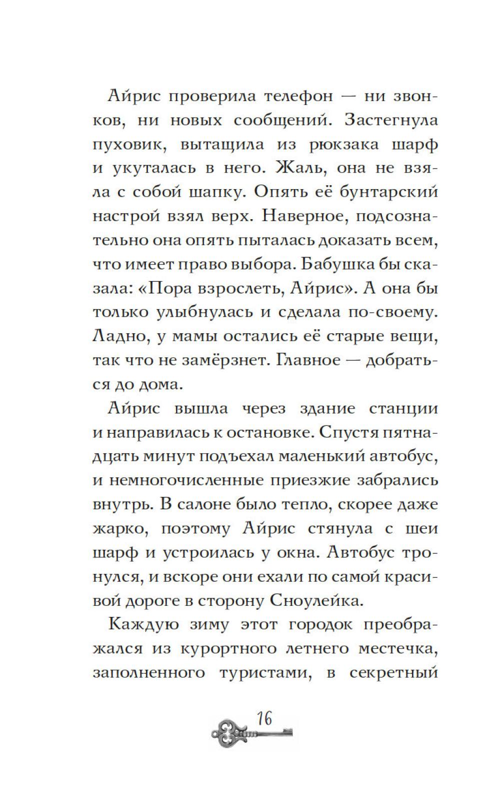 Айрис семнадцать, она мечтает стать писателем и… быть как все. Однако этому мешает необычный семейный дар: Айрис видит призраков - и она этому совсем не рада. На каникулы она отправляется домой в заснеженный городок у озера. Но на вокзале её никто не встречает, и мама ведёт себя очень странно. Дом впервые совсем не украшен к празднику… Что происходит? Проснувшись ночью от странного стука, Айрис видит в соседнем окне миссис Бруни. Соседка зовет её к себе из темноты чердака. Айрис спешит к ней, но проникнув в дом, находит только призрачного кота по имени Дух. Оказывается, Карлотта Бруни пропала ещё месяц назад при таинственных обстоятельствах… Что же случилось? Расследование приведёт Айрис к открытию, сбивающему с ног, - и эта тайна касается её самой…| Издательство | Махаон |