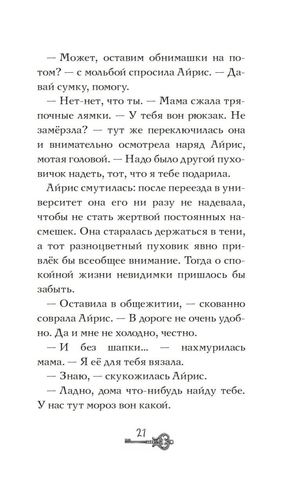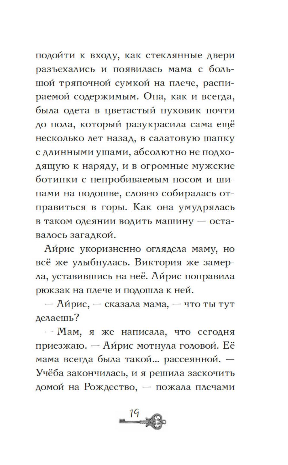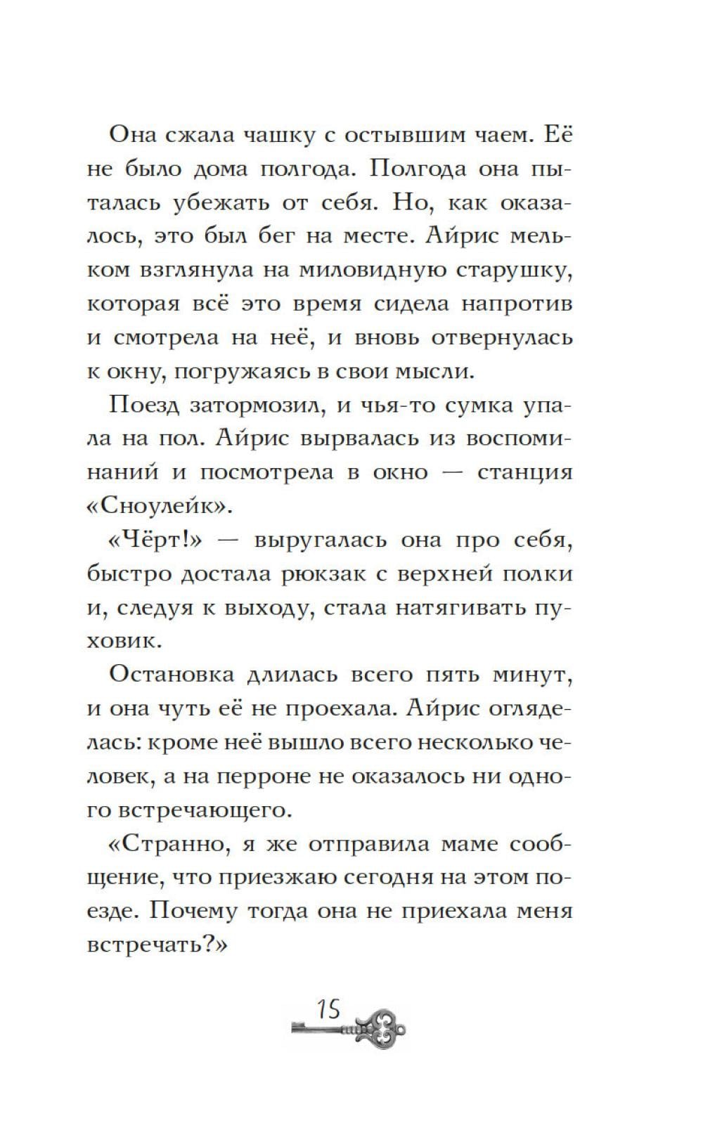 Айрис семнадцать, она мечтает стать писателем и… быть как все. Однако этому мешает необычный семейный дар: Айрис видит призраков - и она этому совсем не рада. На каникулы она отправляется домой в заснеженный городок у озера. Но на вокзале её никто не встречает, и мама ведёт себя очень странно. Дом впервые совсем не украшен к празднику… Что происходит? Проснувшись ночью от странного стука, Айрис видит в соседнем окне миссис Бруни. Соседка зовет её к себе из темноты чердака. Айрис спешит к ней, но проникнув в дом, находит только призрачного кота по имени Дух. Оказывается, Карлотта Бруни пропала ещё месяц назад при таинственных обстоятельствах… Что же случилось? Расследование приведёт Айрис к открытию, сбивающему с ног, - и эта тайна касается её самой…| Издательство | Махаон |