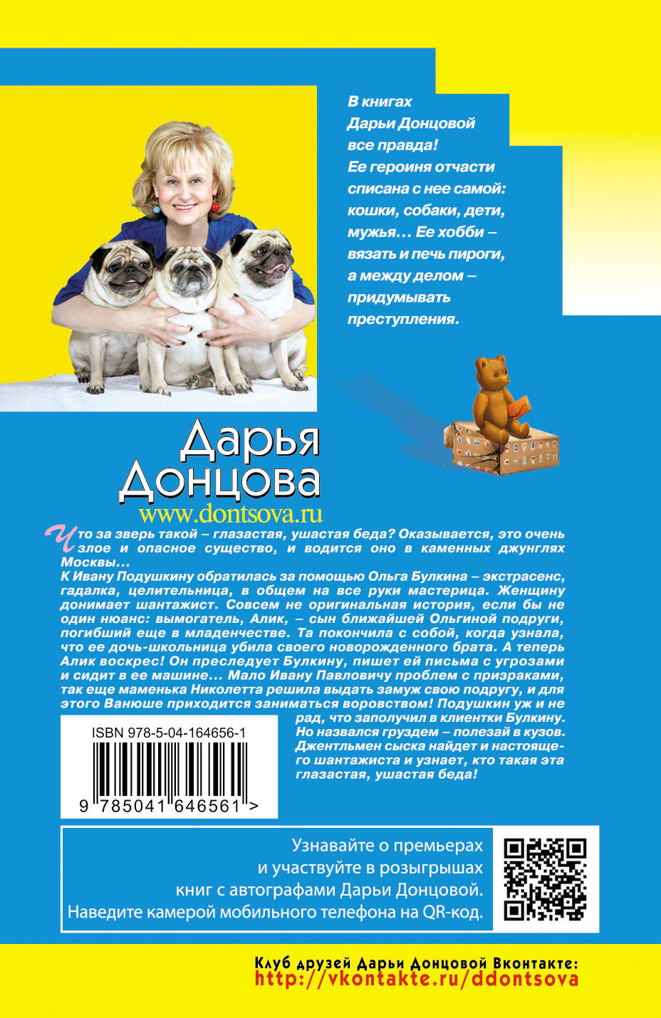 Что за зверь такой - глазастая, ушастая беда? Оказывается, это очень злое и опасное существо, и водится оно в каменных джунглях Москвы… К Ивану Подушкину обратилась за помощью Ольга Булкина - экстрасенс, гадалка, целительница, в общем, на все руки мастерица. Женщину донимает шантажист. Совсем не оригинальная история, если бы не один нюанс: вымогатель - Алик - сын ближайшей Ольгиной подруги, погибший еще в младенчестве. Та покончила с собой, когда узнала, что ее дочь-школьница убила своего новорожденного брата. А теперь Алик воскрес! Он преследует Булкину, пишет ей письма с угрозами и сидит в ее машине… Мало Ивану Павловичу проблем с призраками, так еще маменька Николетта решила выдать замуж свою подругу, и для этого Ванюше приходится заниматься воровством! Подушкин уж и не рад, что заполучил в клиентки Булкину. Но назвался груздем - полезай в кузов. Джентльмен сыска найдет и настоящего шантажиста, и узнает, кто такая эта глазастая, ушастая беда! Дарья Донцова - самый популярный и востребованный автор в нашей стране, любимица миллионов читателей. В России продано более 200 миллионов экземпляров ее книг. Детективы Дарьи Донцовой написаны в особой манере: помимо интереснейшего сюжета, в них всегда присутствует тонкий юмор, здравый оптимизм и безусловная вера в торжество добра над злом. Это всё, что нужно для отдыха, релаксации и душевного успокоения. Прочтите книги Дарьи, и ваши сердца и души наполнятся светом, оптимизмом, радостью, уверенностью в завтрашнем дне! Они заразят вас желанием жить, радоваться каждому дню и верить в лучшее. «Донцова невероятная работяга! Я не знаю ни одного другого писателя, который столько работал бы. Я отношусь к ней с уважением, как к образцу писательского трудолюбия. Женщины нуждаются в психологической поддержке и получают ее от Донцовой. Я и сама в свое время прочла несколько романов Донцовой. Ее читают очень разные люди. И очень занятые бизнес-леди, чтобы на время выключить голову, и домохозяйки, у которых есть перерыв 15-20 минут между отвести-забрать детей». - Галина Юзефович, литературный критик «У Дарьи вся детективная закваска всего лишь фон для раскрытия характеров, взаимоотношений между людьми. Всегда есть интрига, и до последнего эпизода непонятно, что, как и почему. В этом смысле условия жанра абсолютно выполняются. Дарья Донцова, конечно, одна из лучших». - Дмитрий Харатьян «Давно начала читать, и так втянулась! И сейчас читаю романы Дарьи. Я отдыхаю за ними. Сама Донцова интеллигентная женщина, у неё мягкий юмор и нестрашный сюжет, всё с позитивом и надеждой на хороший конец. Это прекрасно». - Лариса Удовиченко| Издательство | Эксмо |