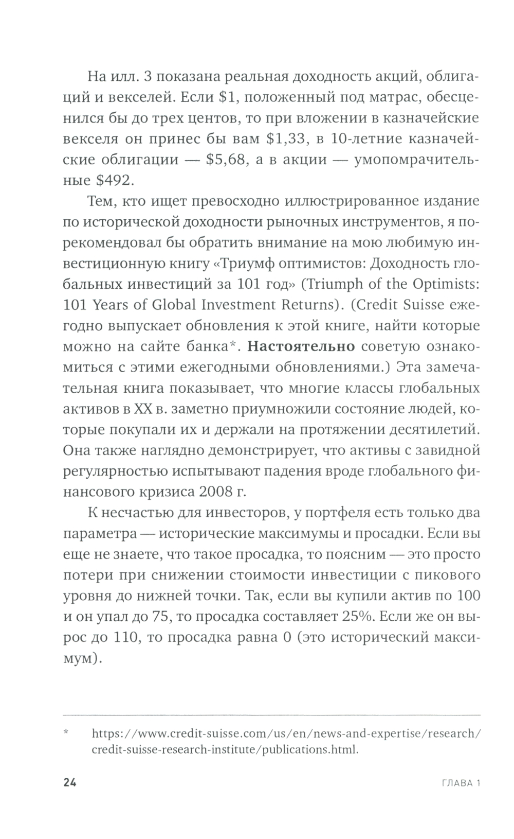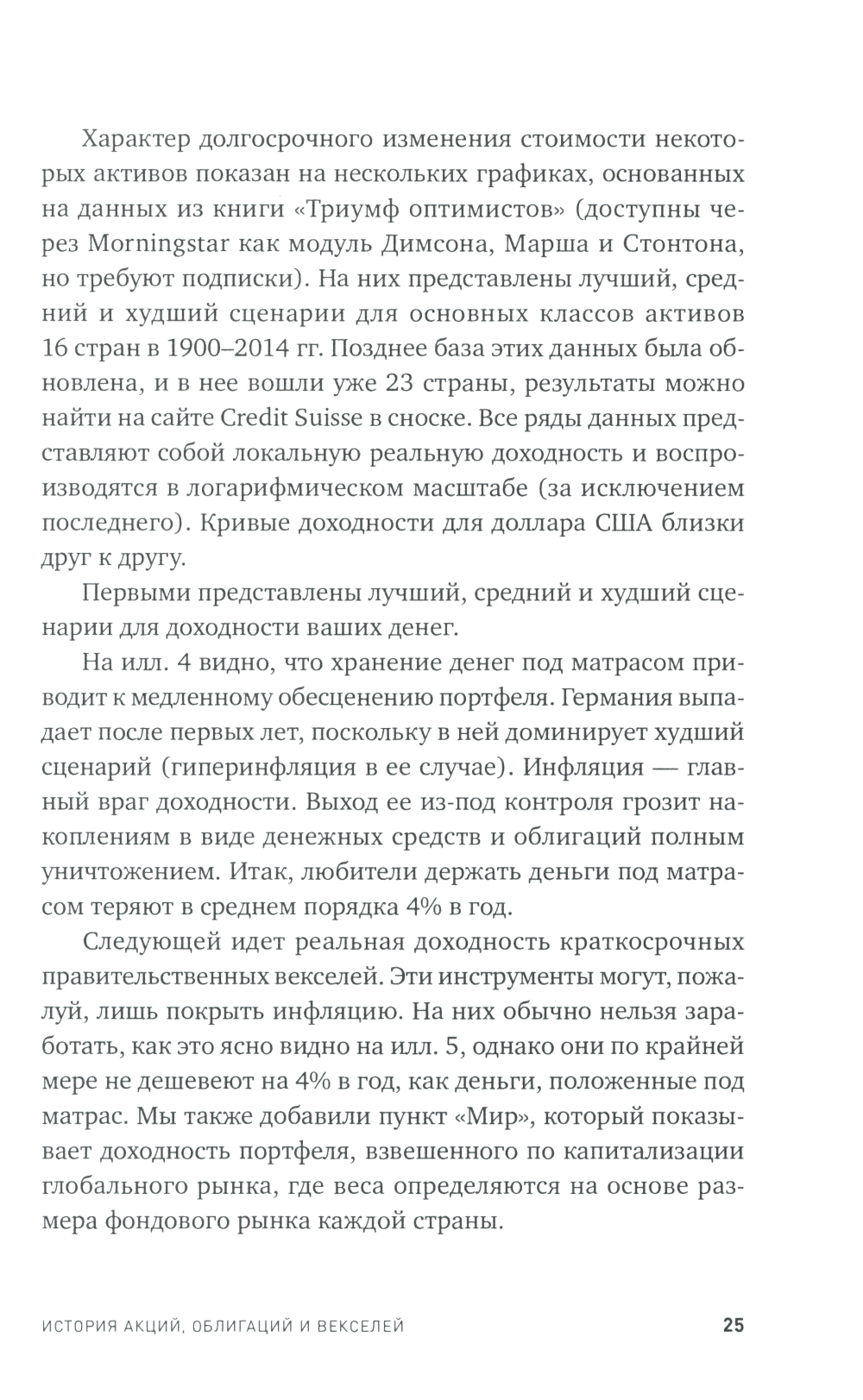 Как использовать мощь современных финансовых рынков, чтобы позволить инвестору построить портфель с глобальной диверсификацией? Именно этому посвящена книга Меба Фабера, известного инвестора и управляющего фондом. Книга начинается с обзора исторической доходности популярных активов вроде акций, облигаций и денежных средств. Автор рассматривает влияние инфляции на деньги, а затем показывает, как диверсификация путем комбинирования активов на примере простого сочетания акций и облигаций позволяет смягчать экстремальные просадки рискованных классов активов. Фабер не останавливается на портфеле акций и облигаций, а идет дальше и анализирует возможности более глобального распределения с учетом таких активов, как недвижимость. В книге отслеживается 13 видов активов и их доходности с 1973 г., при этом особое внимание уделяется таким широко известным инвестиционным портфелям, как всесезонный портфель Рэя Далио, портфели эндаумент-фондов, портфель Уоррена Баффетта.| Издательство | Альпина Паблишер |