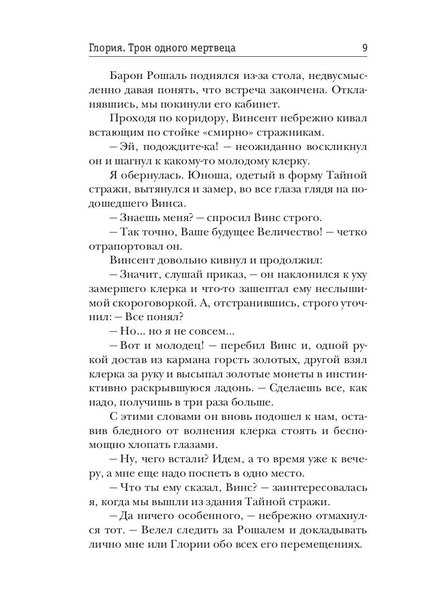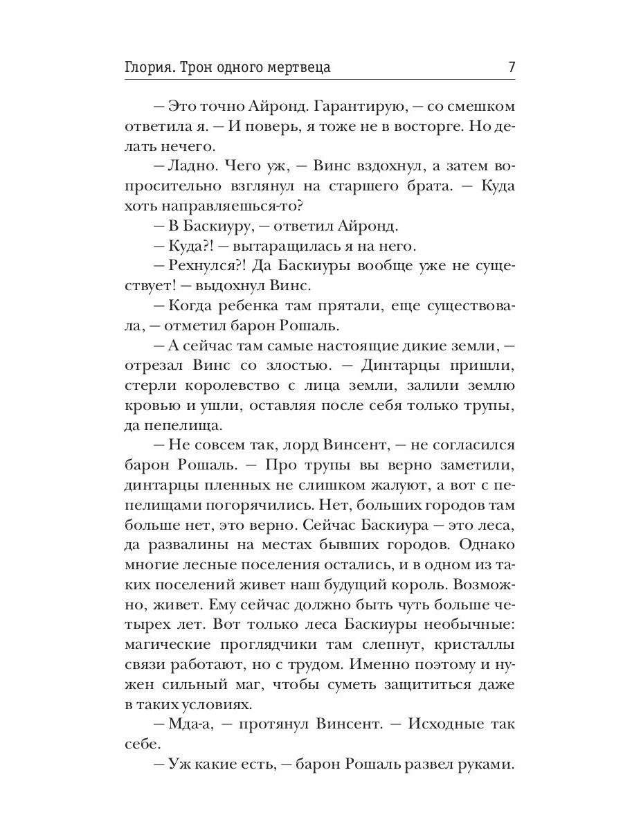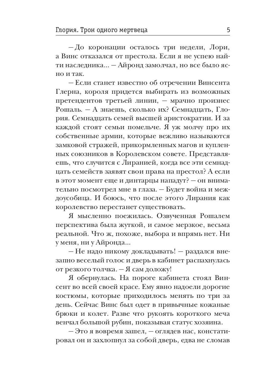 Меня зовут Глория. Я - темный маг и с недавних пор нахожусь розыске по приказу первого лица королевства. Король мертв, Айронд пропал в землях темных магов, а Винсента объявили предателем и самозванцем. Как распутать этот клубок, если я сама - беглянка? Как понять, кто друг, а кто враг? Что на самом деле хотят от меня Черные Клинки? И кто займет королевский трон? Все тайны раскроются в заключительном романе цикла "Глория. Трон одного мертвеца".| Издательство | Т8 RUGRAM |