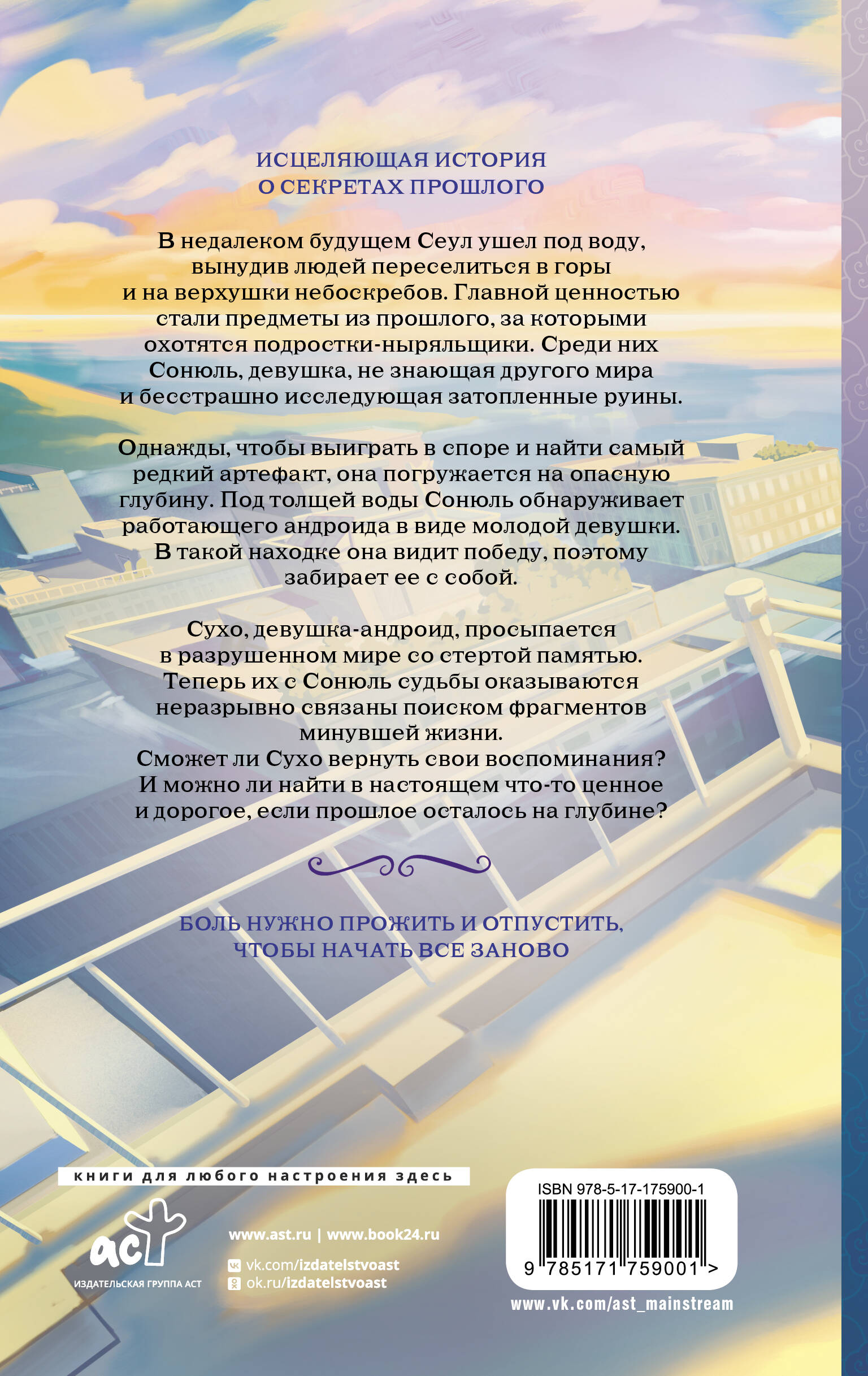 В недалеком будущем Сеул ушел под воду, вынудив людей переселиться в горы и на верхушки небоскребов. Главной ценностью стали предметы из прошлого, за которыми охотятся подростки-ныряльщики. Среди них Сонюль, девушка, не знающая другого мира и бесстрашно исследующая затопленные руины. Однажды, чтобы выиграть в споре и найти самый редкий артефакт, она погружается на опасную глубину. Под толщей воды Сонюль обнаруживает работающего андроида в виде молодой девушки. В такой находке она видит победу, поэтому забирает ее с собой. Сухо, девушка-андроид, просыпается в разрушенном мире со стертой памятью. Теперь их с Сонюль судьбы оказываются неразрывно связаны поиском фрагментов минувшей жизни. Сможет ли Сухо вернуть свои воспоминания? И можно ли найти в настоящем что-то ценное и дорогое, если прошлое осталось на глубине?| Издательство | Издательство "АСТ" |