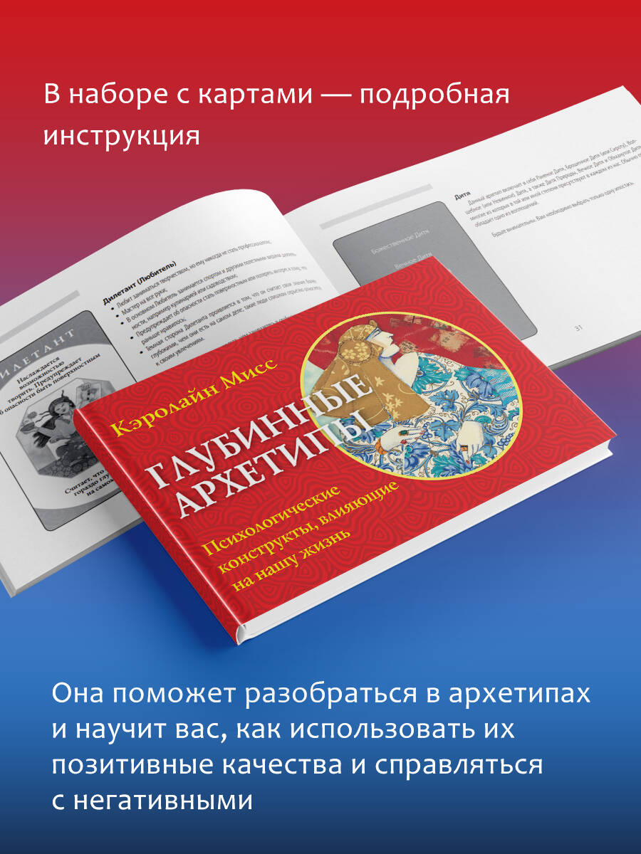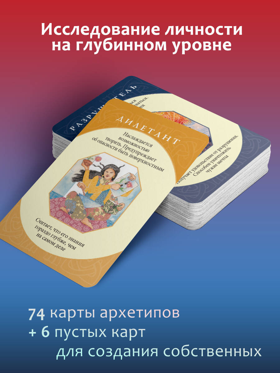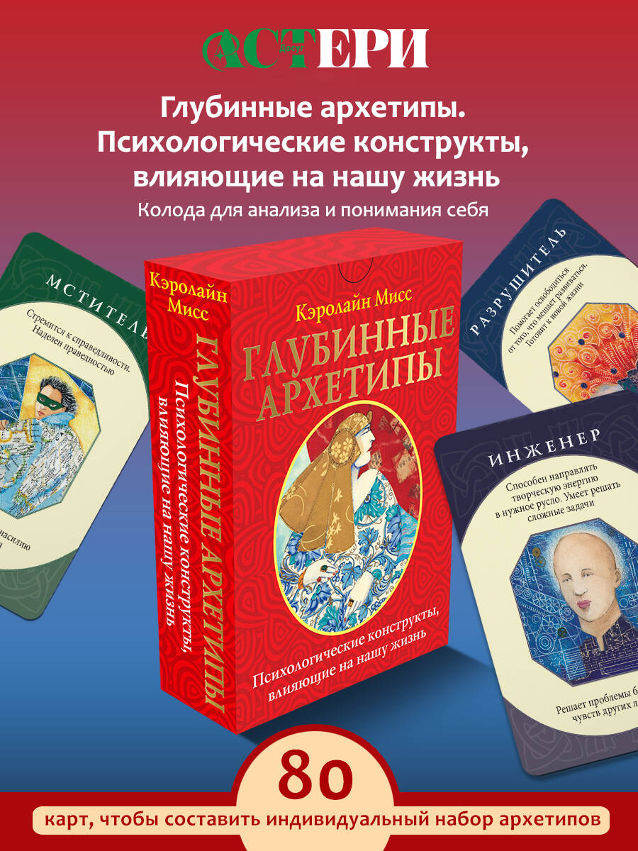 В ваших руках - уникальный набор из 74 карт-архетипов, которые раскрывают темные и светлые стороны души человека. Архетипы - это древние универсальные модели поведения, лежащие в основе коллективного бессознательного, о котором писал Карл Юнг. У каждого человека индивидуальный набор архетипов. Они - наши верные помощники, которые способны выручить даже в самых сложных и нестандартных ситуациях. Вместе с колодой вы получите подробное руководство, которое подскажет, как пользоваться картами и выявить основные архетипы. Такой глубинный анализ позволит лучше понять себя, а вместе с тем даст подсказку, как стать по-настоящему счастливым и успешным. Карты просты в использовании и подойдут абсолютно любому, кто хочет изучить свой внутренний мир. Автор Кэролайн Мисс - медиум, занимается энергетической медициной и познанием человеческого сознания. Она специализируется на оказании помощи людям в понимании эмоциональных, психологических и физических причин, из-за которых в организме появляются те или иные заболевания. Многие ее книги стали бестселлерами по версии New York Times. Колода упакована в подарочную коробку. Комплект состоит из книги-руководства и 80 карт (74 карты-архетипа + 6 пустых). Колода также издается в малой коробке с инструкцией под названием "Архетипы: союзники и разрушители. Источник вашей силы".| Издательство | Издательство "АСТ" |