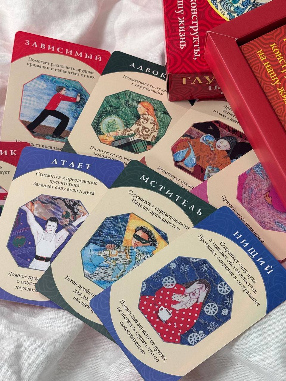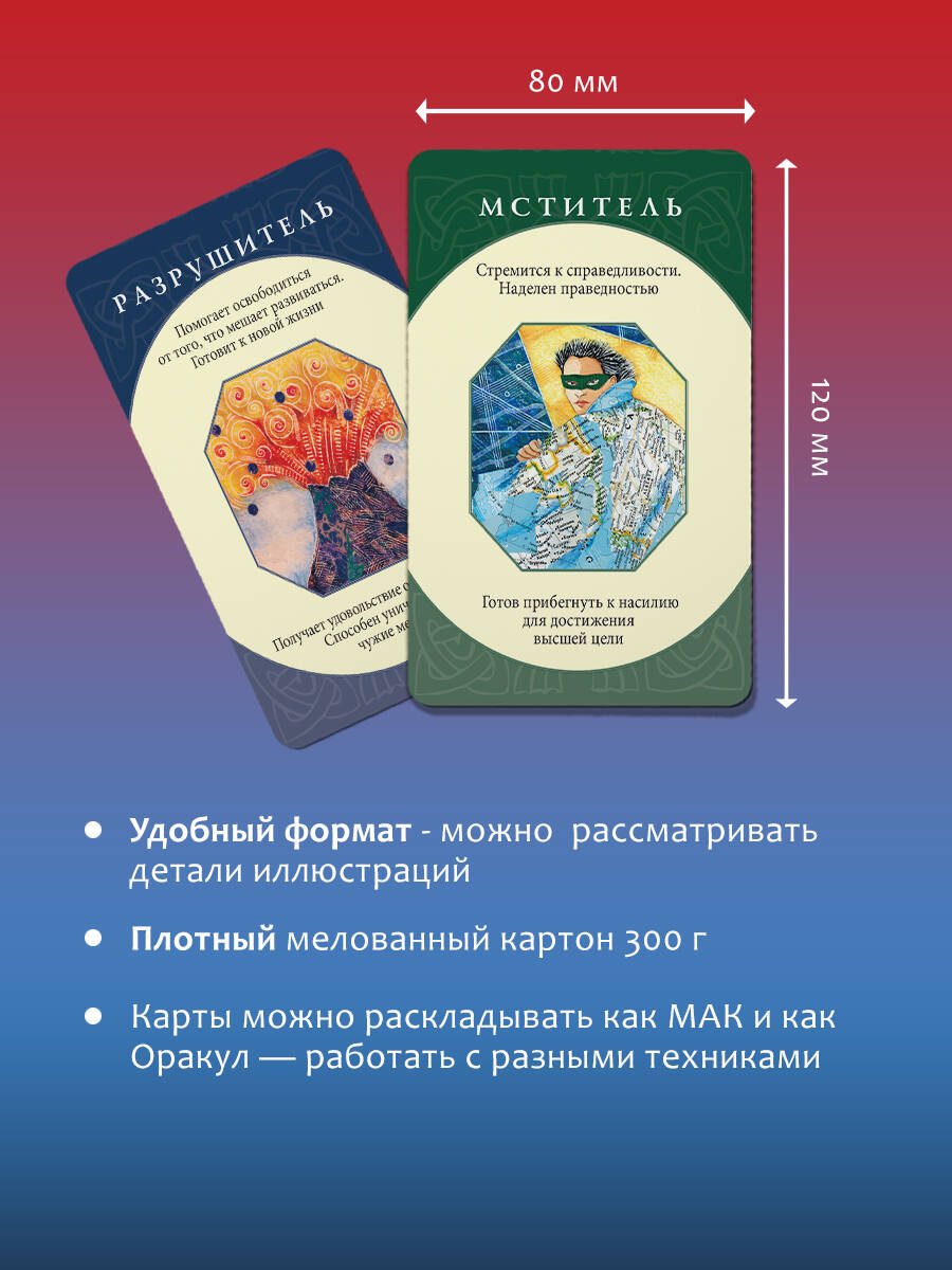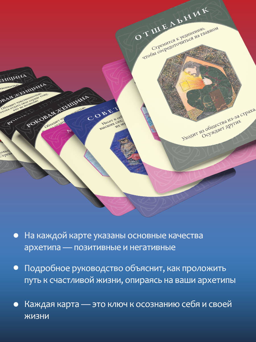 В ваших руках - уникальный набор из 74 карт-архетипов, которые раскрывают темные и светлые стороны души человека. Архетипы - это древние универсальные модели поведения, лежащие в основе коллективного бессознательного, о котором писал Карл Юнг. У каждого человека индивидуальный набор архетипов. Они - наши верные помощники, которые способны выручить даже в самых сложных и нестандартных ситуациях. Вместе с колодой вы получите подробное руководство, которое подскажет, как пользоваться картами и выявить основные архетипы. Такой глубинный анализ позволит лучше понять себя, а вместе с тем даст подсказку, как стать по-настоящему счастливым и успешным. Карты просты в использовании и подойдут абсолютно любому, кто хочет изучить свой внутренний мир. Автор Кэролайн Мисс - медиум, занимается энергетической медициной и познанием человеческого сознания. Она специализируется на оказании помощи людям в понимании эмоциональных, психологических и физических причин, из-за которых в организме появляются те или иные заболевания. Многие ее книги стали бестселлерами по версии New York Times. Колода упакована в подарочную коробку. Комплект состоит из книги-руководства и 80 карт (74 карты-архетипа + 6 пустых). Колода также издается в малой коробке с инструкцией под названием "Архетипы: союзники и разрушители. Источник вашей силы".| Издательство | Издательство "АСТ" |