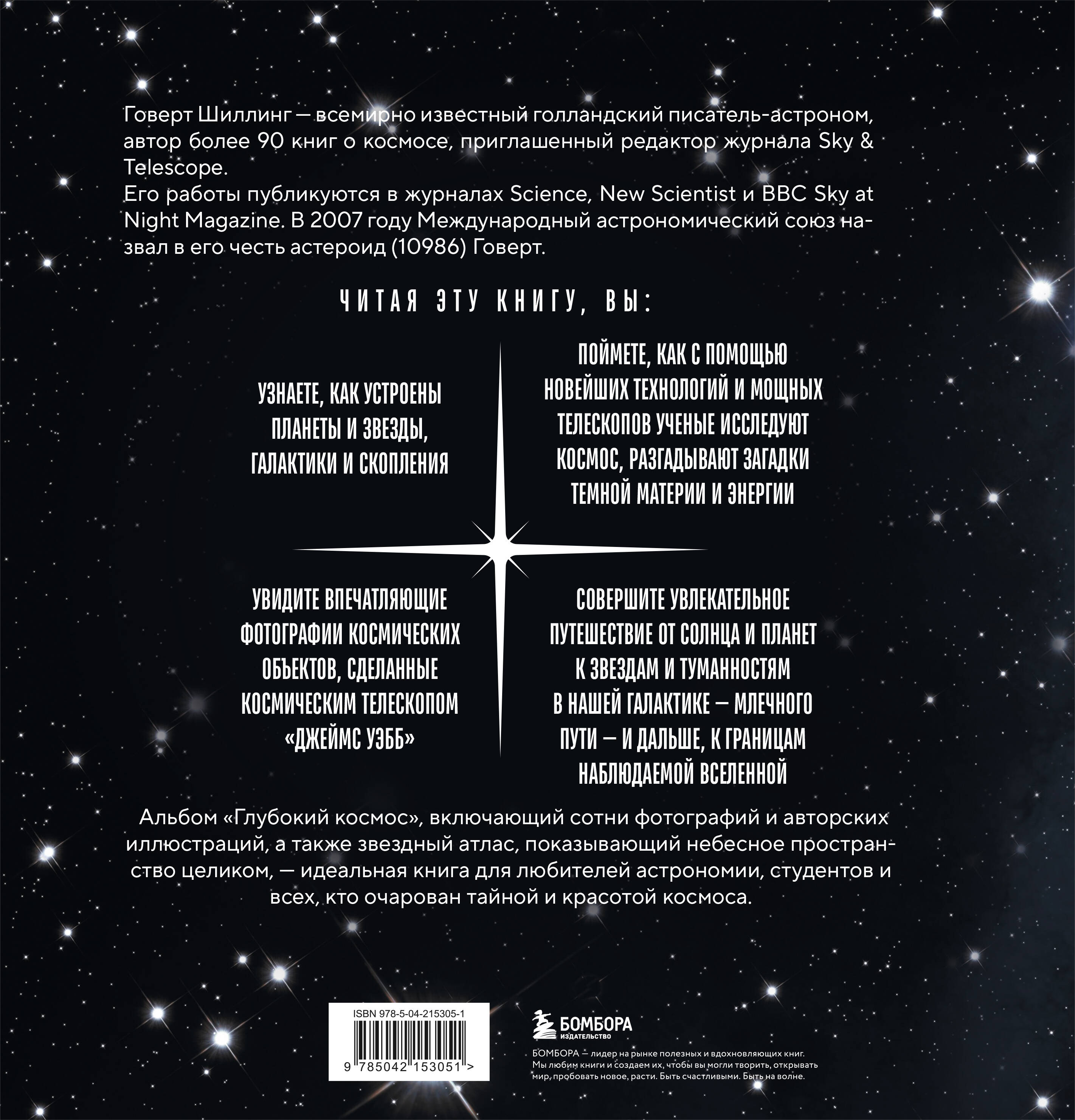 Книга «Глубокий космос» - уникальное иллюстрированное издание для всех, кто стремится понять устройство космоса через завораживающие фотографии и понятные объяснения. Это не просто книга - это увлекательное путешествие от Солнечной системы до самых отдалённых уголков наблюдаемой Вселенной, раскрывающее загадки рождения и гибели звёзд, устройство галактик, истории сверхмассивных чёрных дыр, тёмной материи и энергии. Благодаря сотням ярких снимков, включая новые кадры с космического телескопа Джеймса Уэбба, и звёздному атласу для самостоятельных наблюдений книга станет ценным и вдохновляющим подарком для думающей аудитории. Для всех, кто интересуется астрономией и космосом. Издание отличается ясной структурой и доступностью: автор простым языком объясняет сложные астрономические явления, сочетая исторические факты, современные открытия и практические советы. В каждой главе - от устройства Солнечной системы и истории астрономии до современных телескопов и самых загадочных космических феноменов - внимание уделено не только фактам, но и захватывающим открытиям, которые раскрывают перед нами глубины Вселенной. Эта книга - отличный подарок тем, кто ценит качественную научно-популярную литературу с визуальным сопровождением, стремится расширить свои знания о космосе и астрономии. Она подходит как для студентов и любителей науки, так и для тех, кто ищет полезный и впечатляющий подарок.| Издательство | ООО "Издательство "Эксмо" |
