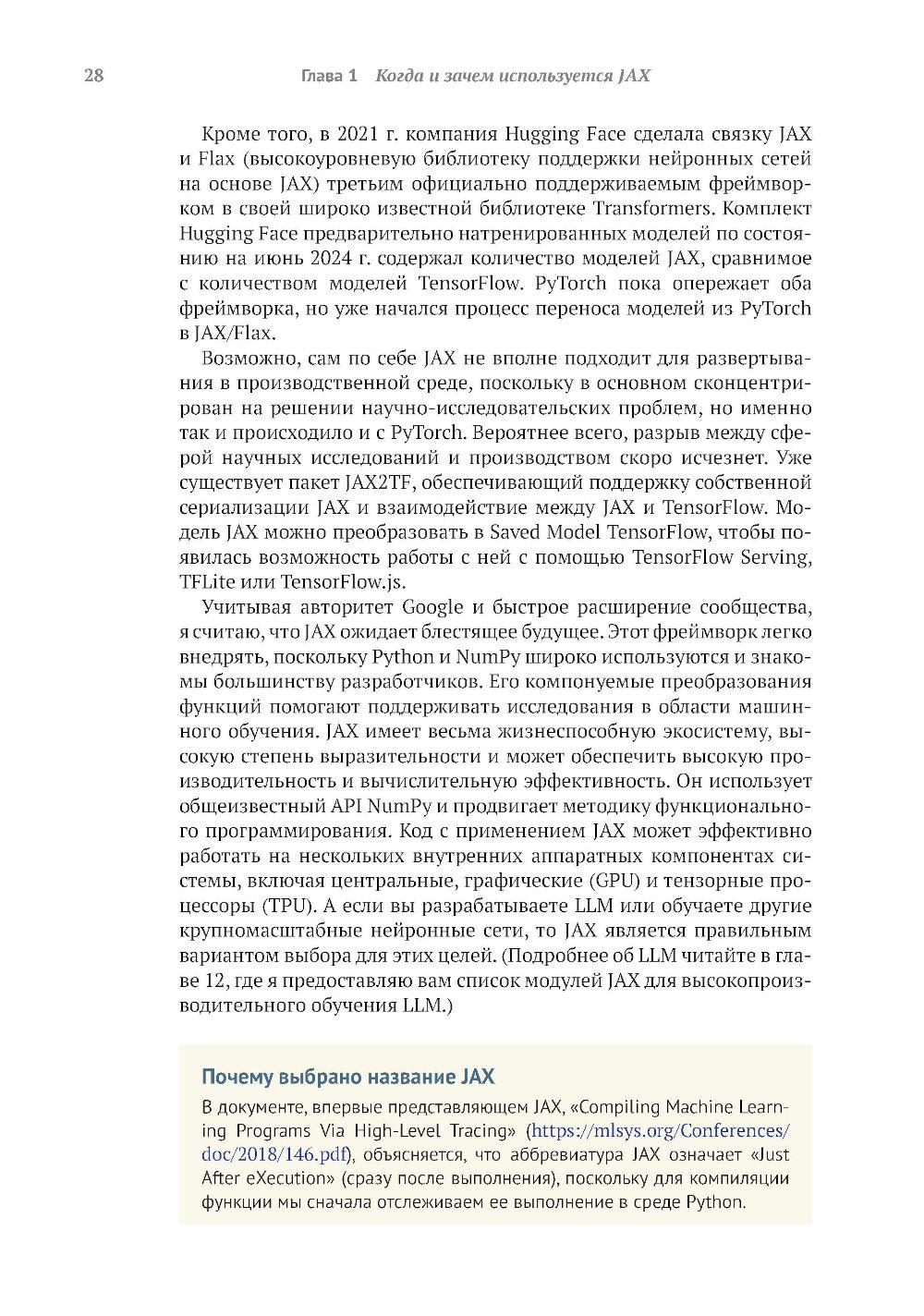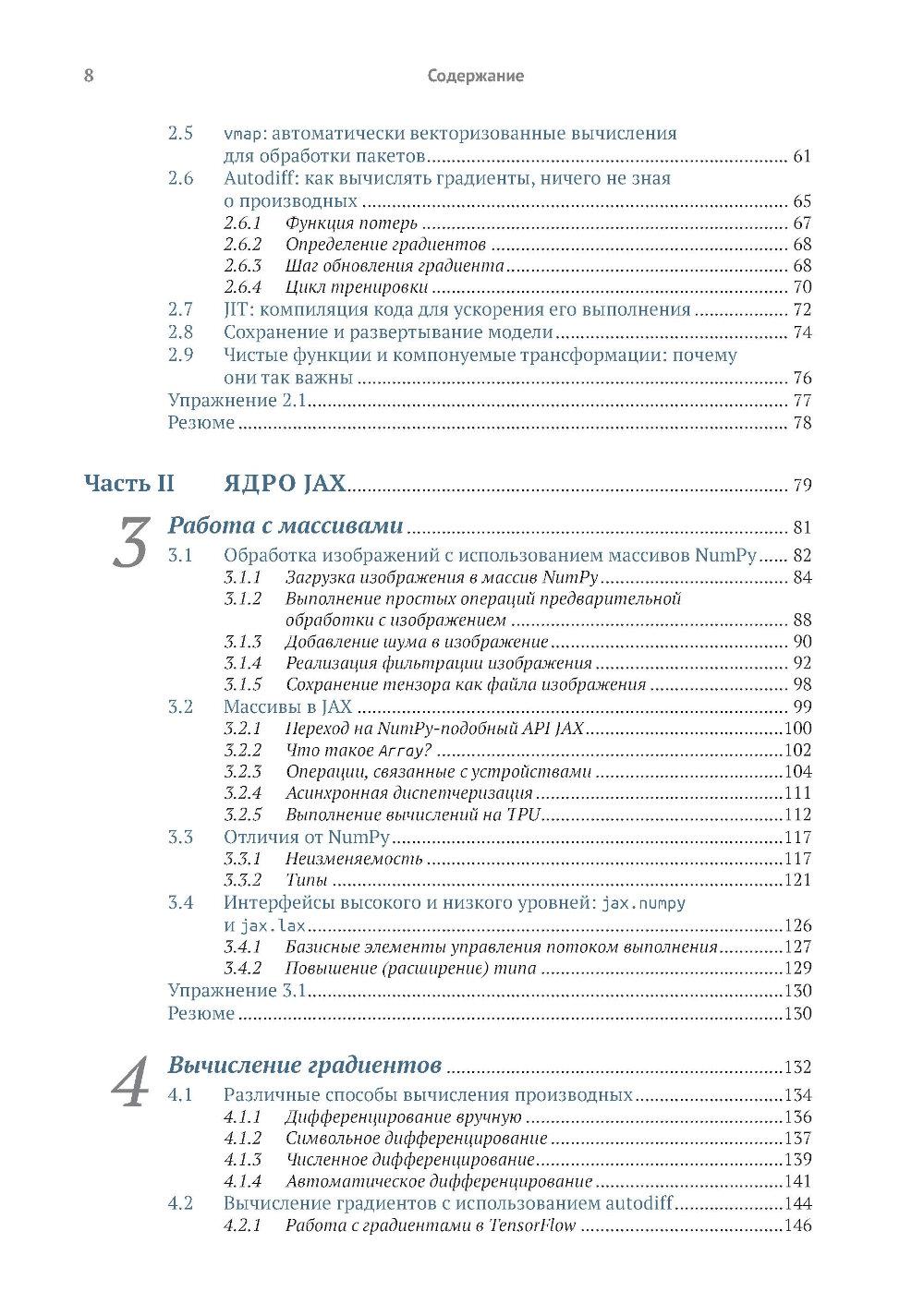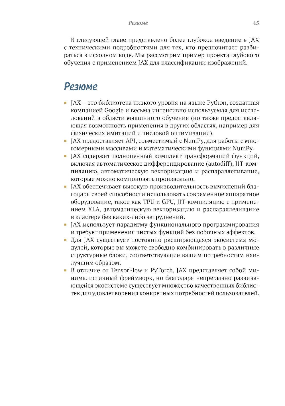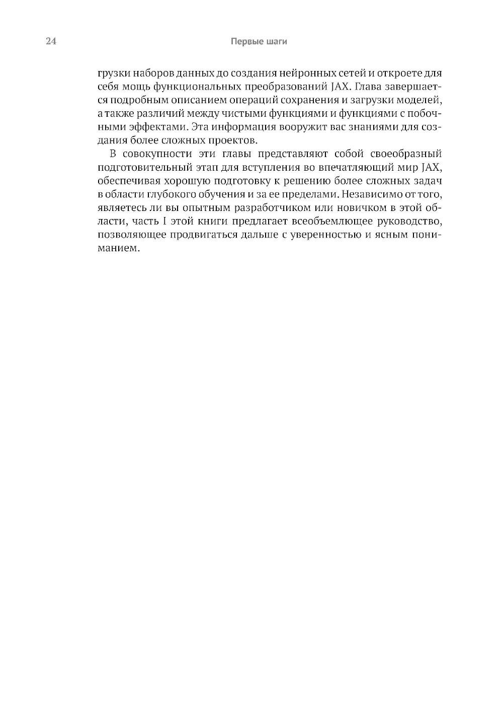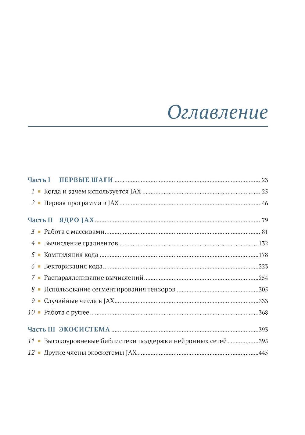 Библиотека JAX от Google предоставляет пользователям моделей глубокого обучения средства точной настройки и управления процессами низкого уровня, такими как вычисление градиента, быстрое и эффективное обучение модели и вывод результатов на больших наборах данных. Книга обучает созданию эффективных нейронных сетей с применением JAX. Вы узнаете, как специальные инструменты JAX помогают справиться с проблемами нехватки производительности, характерными для глубокого обучения на больших данных. Примеры реалистичных проектов и листинги исходного кода с подробными комментариями показывают, как парадигма функционального программирования JAX улучшает сочетаемость различных программных компонентов и возможности распараллеливания. Основные темы: - использование JAX для числовых расчетов; - создание дифференцируемых моделей с использованием примитивов JAX; - выполнение распределенных и параллельных вычислений с помощью JAX; - создание нейронных сетей с помощью библиотек высокого уровня, таких как Flax. Издание предназначено программистов средней квалификации на языке Python, знакомых с принципами глубокого обучения.| Издательство | ДМК Пресс |