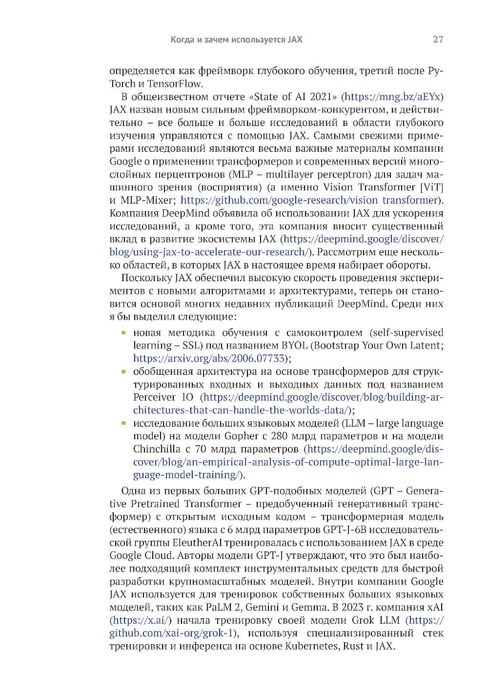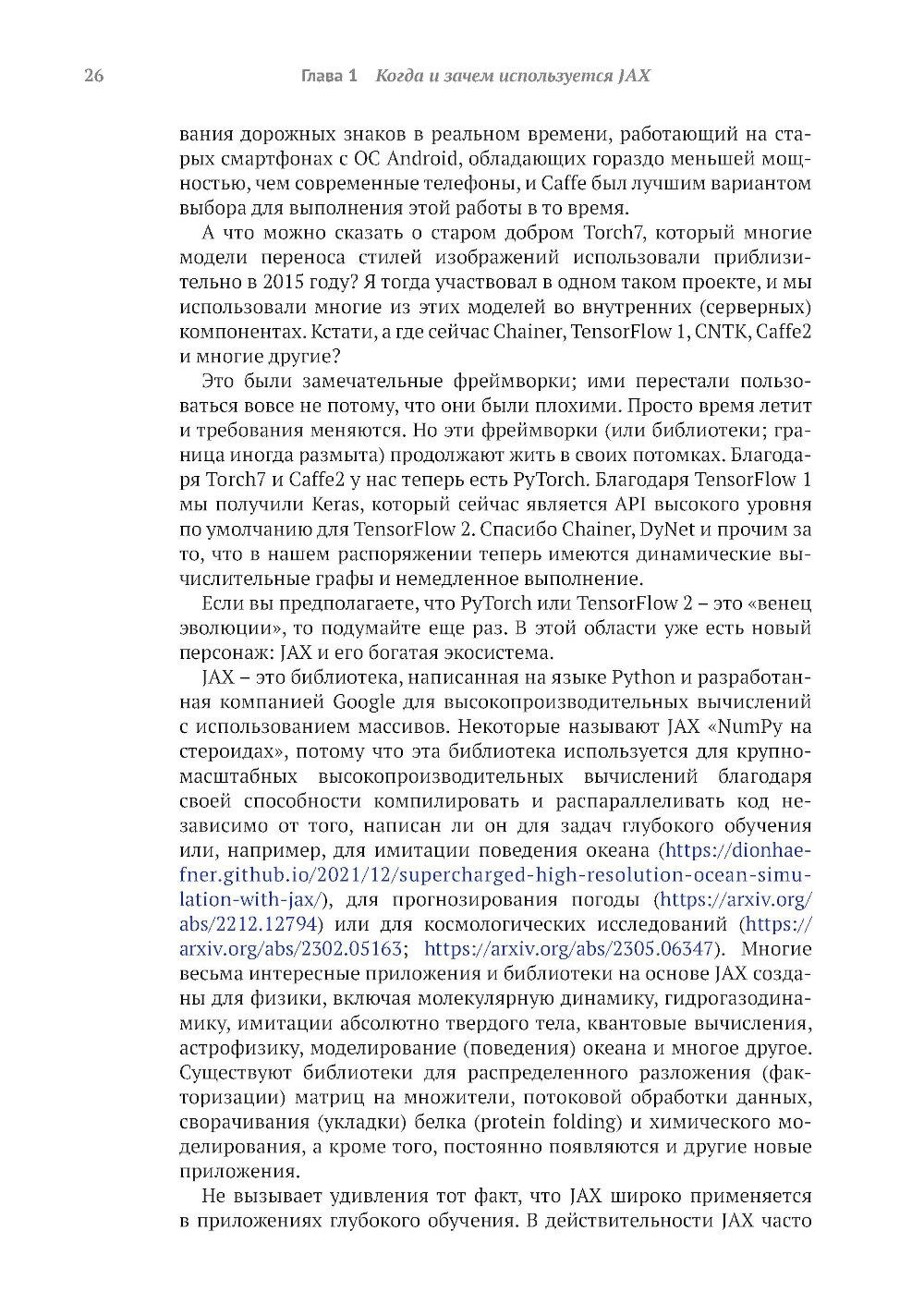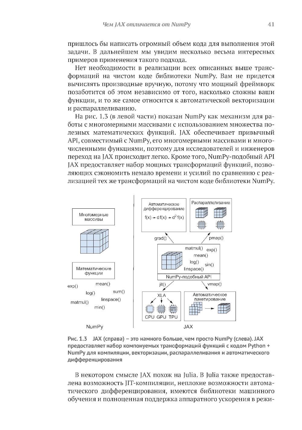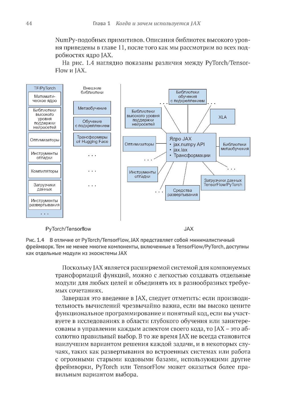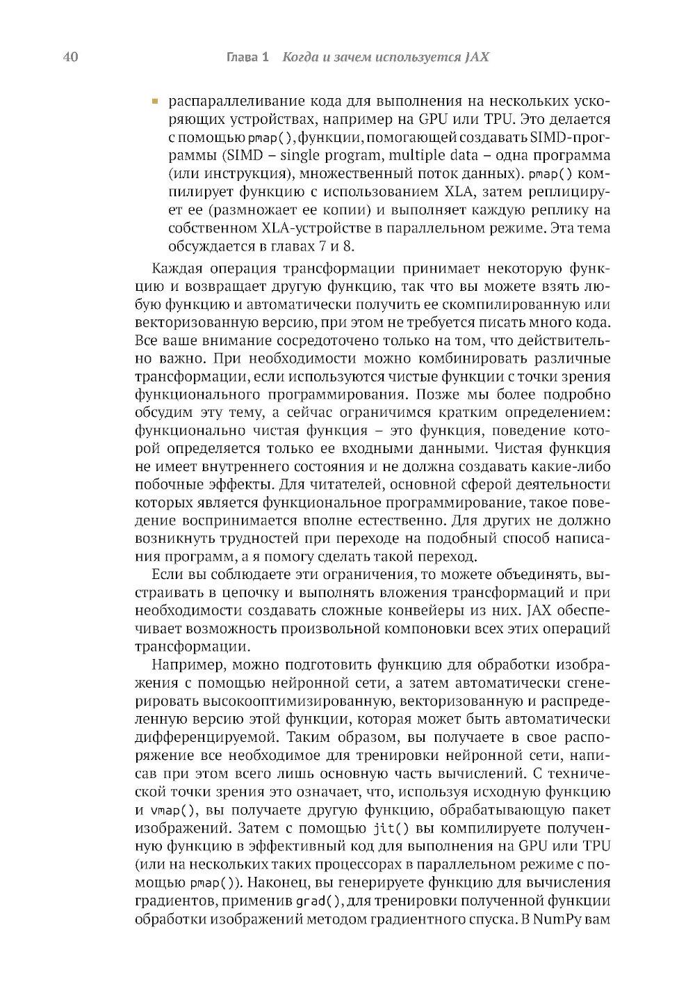 Библиотека JAX от Google предоставляет пользователям моделей глубокого обучения средства точной настройки и управления процессами низкого уровня, такими как вычисление градиента, быстрое и эффективное обучение модели и вывод результатов на больших наборах данных. Книга обучает созданию эффективных нейронных сетей с применением JAX. Вы узнаете, как специальные инструменты JAX помогают справиться с проблемами нехватки производительности, характерными для глубокого обучения на больших данных. Примеры реалистичных проектов и листинги исходного кода с подробными комментариями показывают, как парадигма функционального программирования JAX улучшает сочетаемость различных программных компонентов и возможности распараллеливания. Основные темы: - использование JAX для числовых расчетов; - создание дифференцируемых моделей с использованием примитивов JAX; - выполнение распределенных и параллельных вычислений с помощью JAX; - создание нейронных сетей с помощью библиотек высокого уровня, таких как Flax. Издание предназначено программистов средней квалификации на языке Python, знакомых с принципами глубокого обучения.| Издательство | ДМК Пресс |
