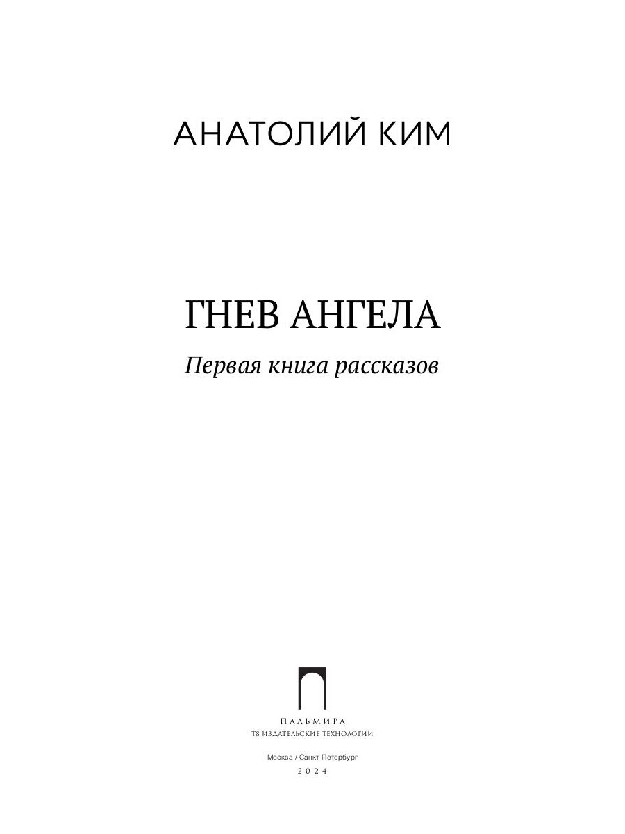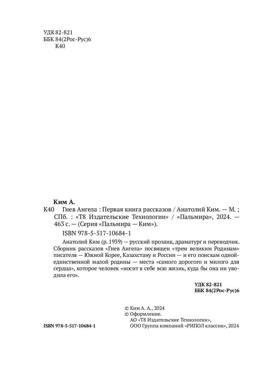 Анатолий Ким (р. 1939) - русский прозаик, драматург и переводчик. Сборник рассказов «Гнев Ангела» посвящен «трем великим Родинам» писателя - Южной Корее, Казахстану и России - и его поискам одной-единственной малой родины - места «самого дорогого и милого для сердца», которое человек «носит в себе всю жизнь, куда бы она ни уводила его».