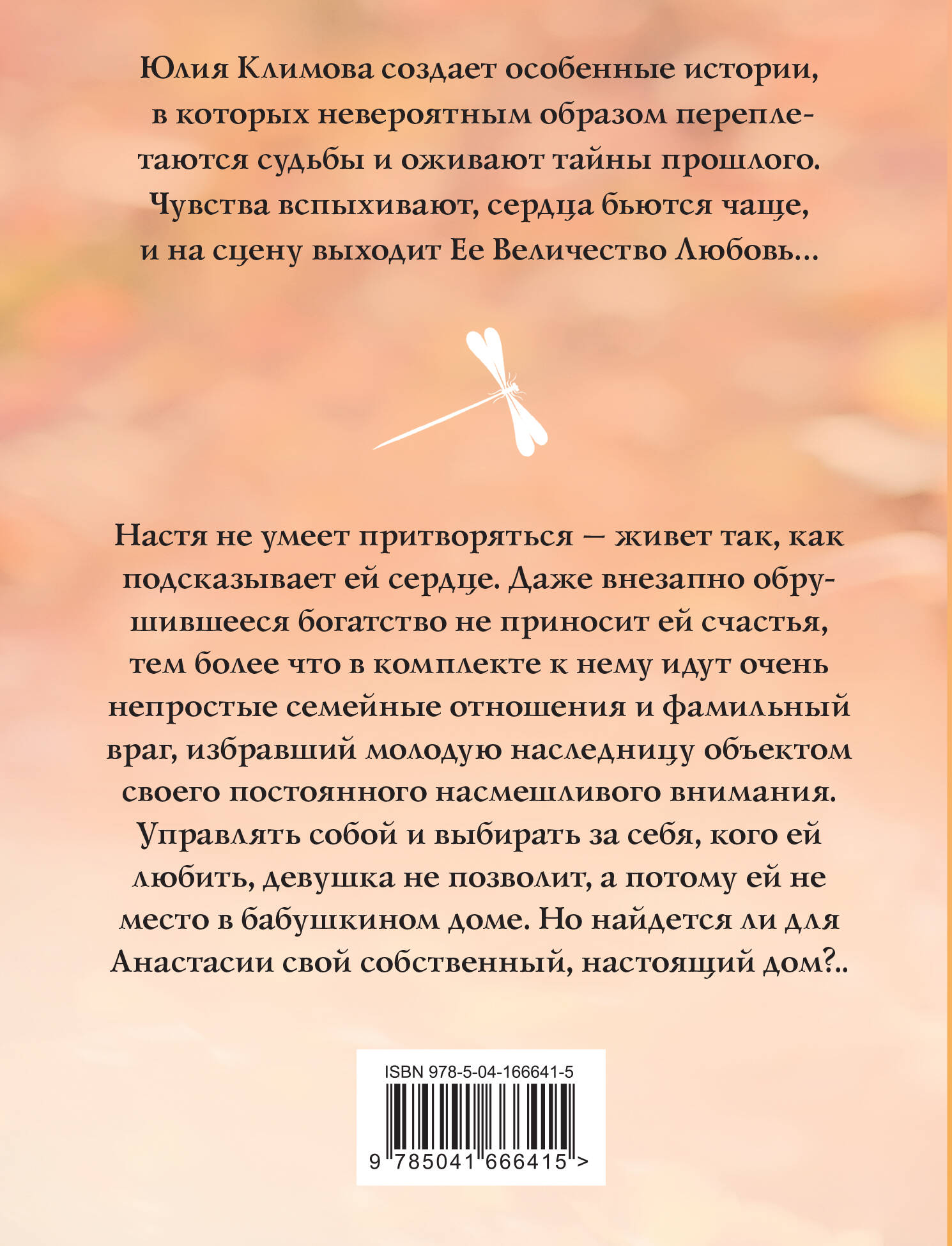 Истории Юлии Климовой - самые уютные и добрые романы о любви. Настя не умеет притворяться - живет так, как подсказывает ей сердце. Даже внезапно обрушившееся богатство не приносит ей счастья, тем более что в комплекте к нему идут очень непростые семейные отношения и фамильный враг, избравший молодую наследницу объектом своего постоянного насмешливого внимания. Управлять собой и выбирать за себя, кого ей любить, девушка не позволит, а потому ей не место в бабушкином доме. Но найдется ли для Анастасии свой собственный, настоящий дом?..| Издательство | Эксмо |