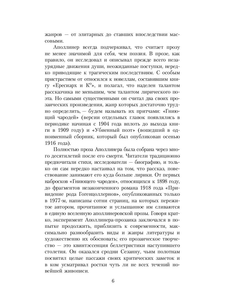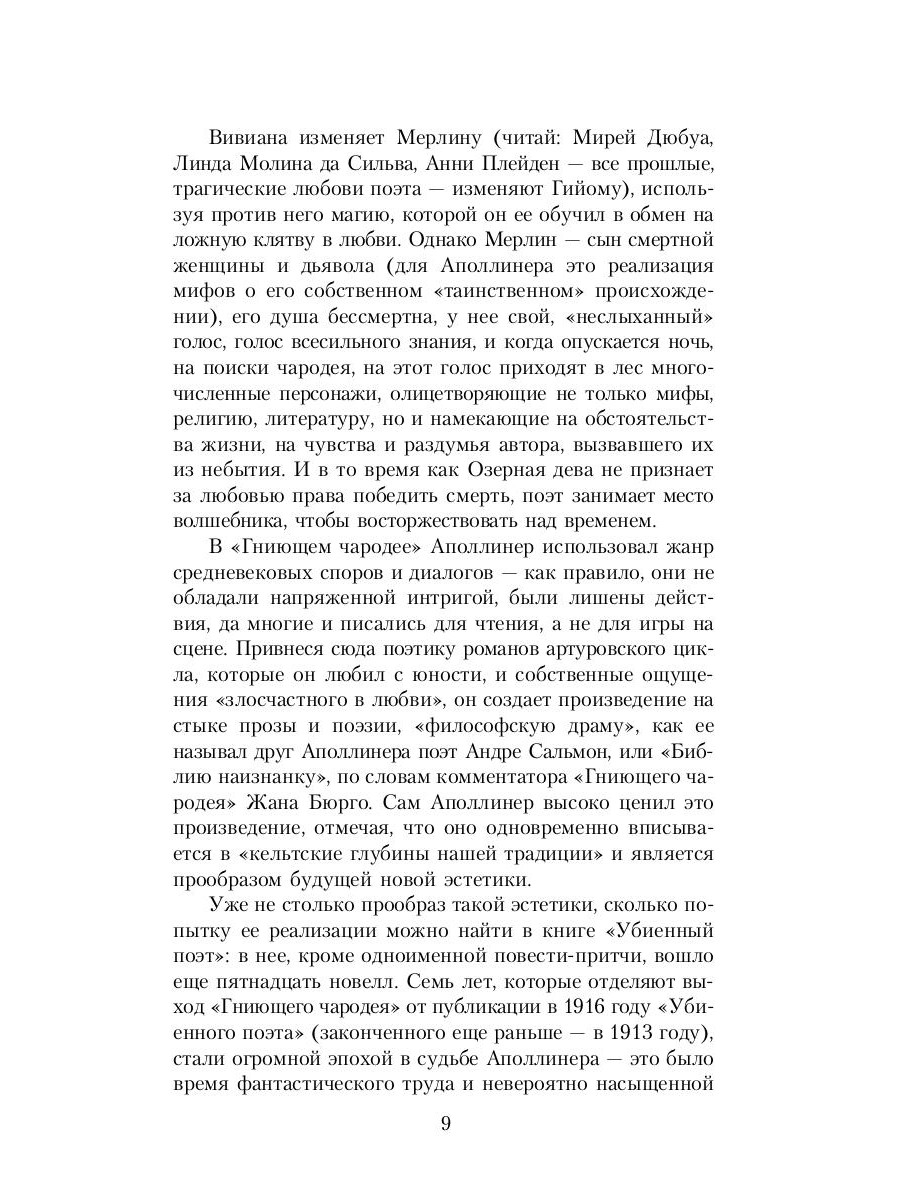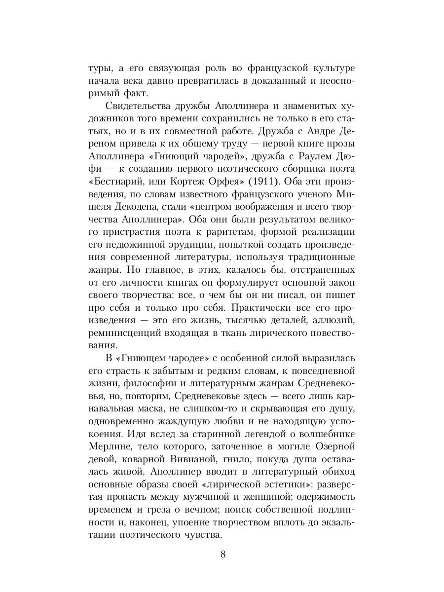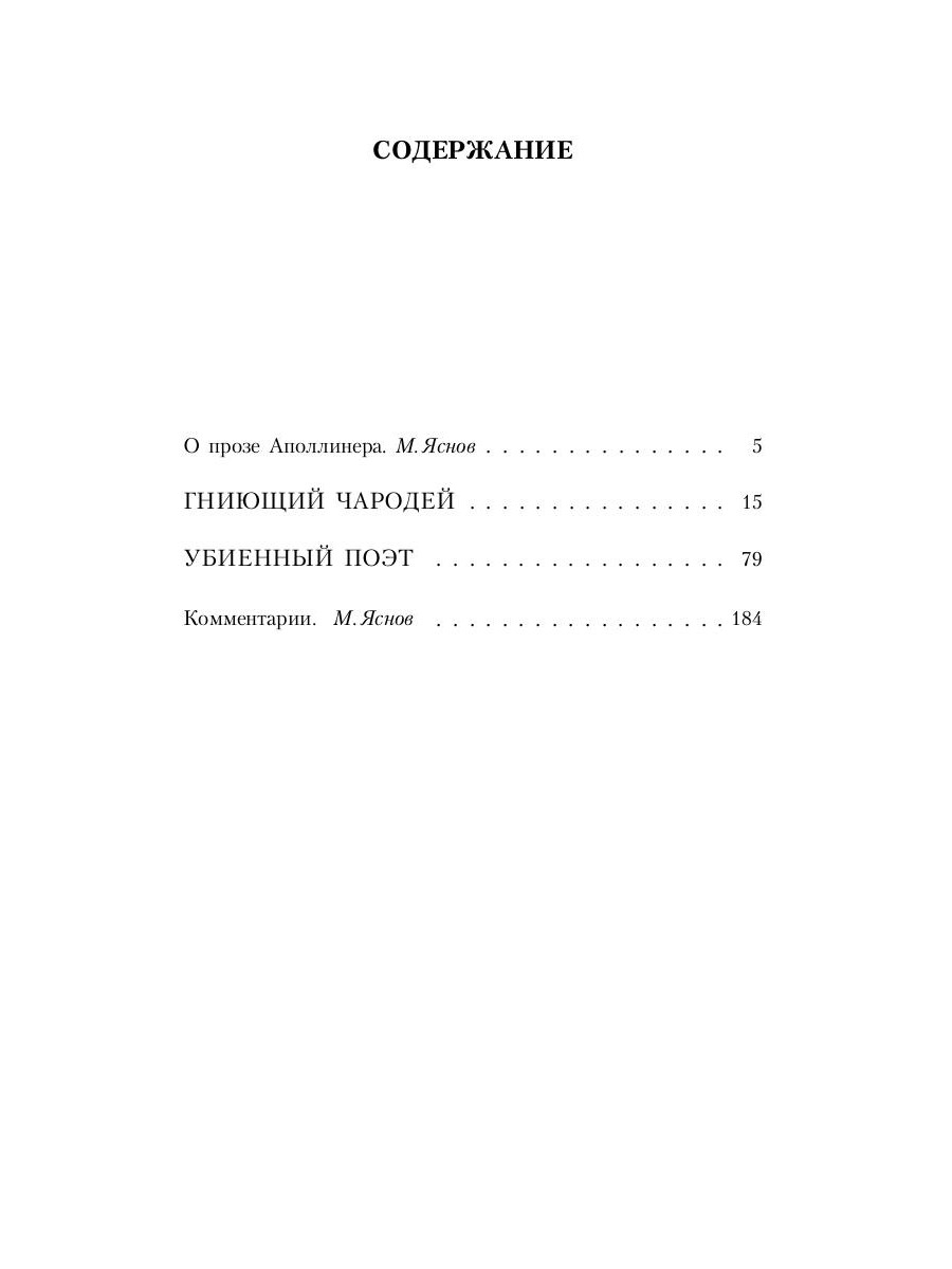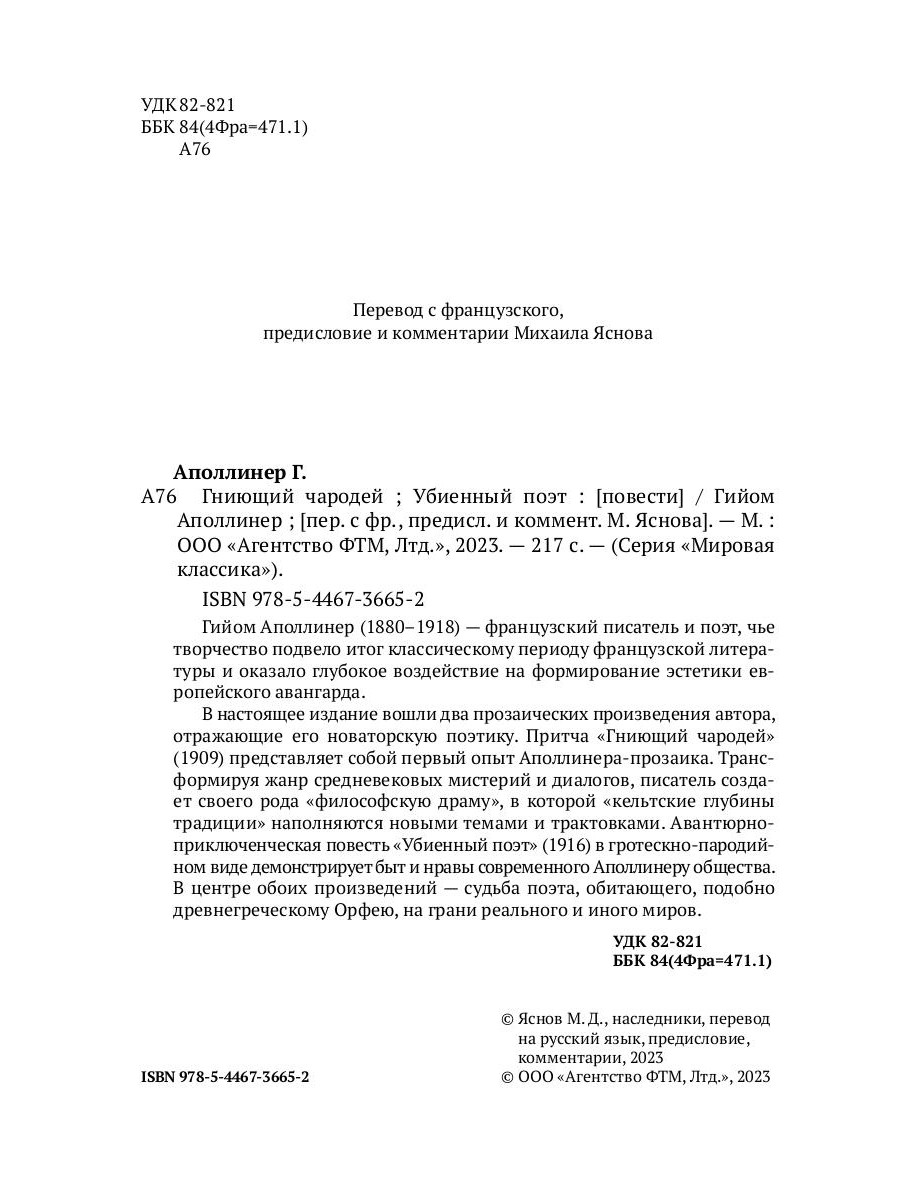 Гийом Аполлинер (1880-1918) - французский писатель и поэт, чье творчество подвело итог классическому периоду французской литературы и оказало глубокое воздействие на формирование эстетики европейского авангарда. В настоящее издание вошли два прозаических произведения автора, отражающие его новаторскую поэтику. Притча "Гниющий чародей" (1909) представляет собой первый опыт Аполлинера-прозаика. Трансформируя жанр средневековых мистерий и диалогов, писатель создает своего рода "философскую драму", в которой "кельтские глубины традиции" наполняются новыми темами и трактовками. Авантюрно-приключенческая повесть "Убиенный поэт" (1916) в гротескно-пародийном виде демонстрирует быт и нравы современного Аполлинеру общества. В центре обоих произведений - судьба поэта, обитающего, подобно древнегреческому Орфею, на грани реального и иного миров.
