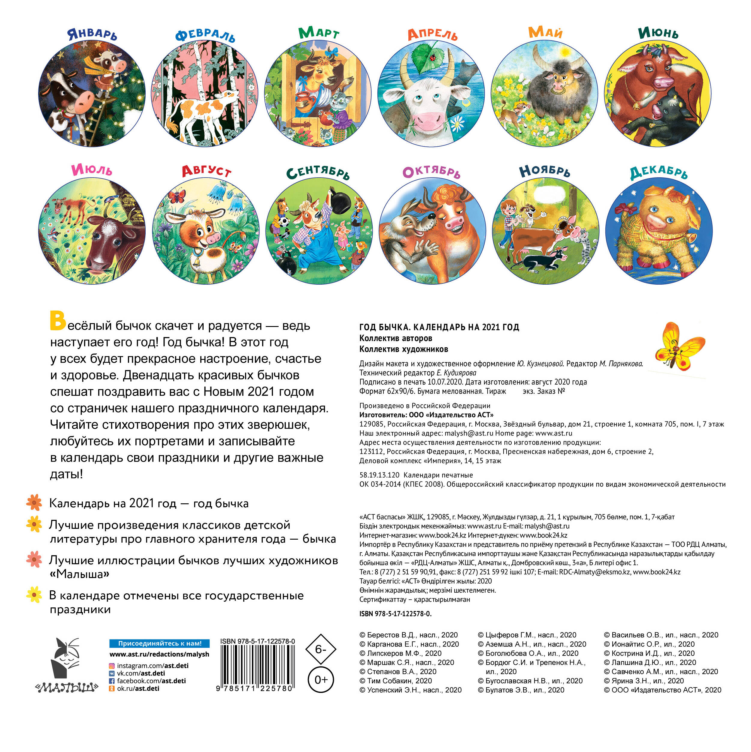 "Весёлый бычок скачет и радуется - ведь наступает его год! Год бычка! В этот год у всех будет прекрасное настроение, счастье и здоровье. Двенадцать красивых бычков спешат поздравить вас с Новым 2021 годом со страничек нашего праздничного календаря. Читайте стихотворения про этих зверюшек, любуйтесь их портретами и записывайте в календарь свои праздники и другие важные даты! Календарь на 2021 год - год бычка Лучшие произведения классиков детской литературы про главного хранителя года - Бычка Лучшие иллюстрации Бычков лучших художников ""Малыша"" В календаре отмечены все государственные праздники"| Издательство | АСТ |
