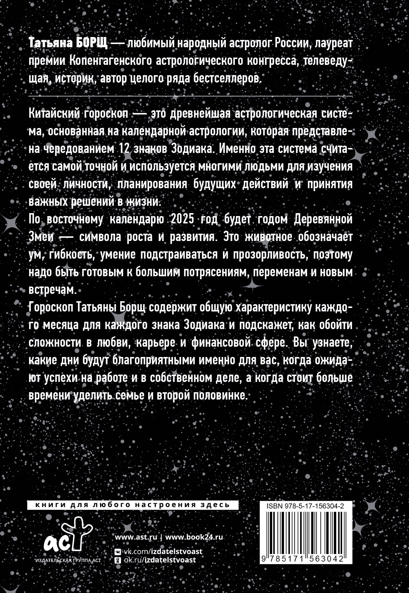Татьяна Борщ - любимый народный астролог России, лауреат премии Копенгагенского астрологического конгресса, телеведущая, историк, автор целого ряда бестселлеров. Китайский гороскоп - это древнейшая астрологическая система, основанная на календарной астрологии, которая представлена чередованием 12 знаков Зодиака. Именно эта система считается самой точной и используется многими людьми для изучения своей личности, планирования будущих действий и принятия важных решений в жизни. По восточному календарю 2025 год будет годом Деревянной Змеи - символа роста и развития. Это животное обозначает ум, гибкость, умение подстраиваться и прозорливость, поэтому надо быть готовым к большим потрясениям, переменам и новым встречам. Гороскоп Татьяны Борщ содержит общую характеристику каждого месяца для каждого знака Зодиака и подскажет, как обойти сложности в любви, карьере и финансовой сфере. Вы узнаете, какие дни будут благоприятными именно для вас, когда ожидают успехи на работе и в собственном деле, а когда стоит больше времени уделить семье и второй половинке.| Издательство | Издательство "АСТ" |