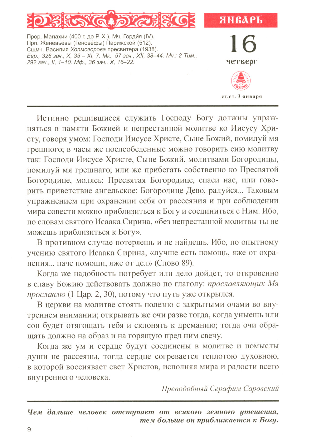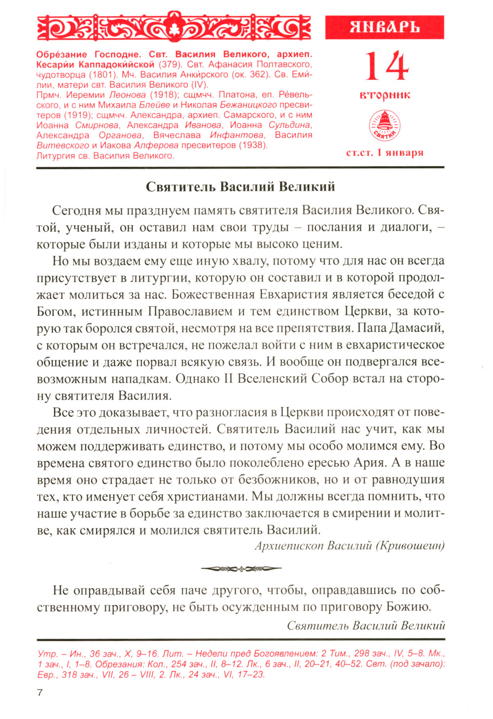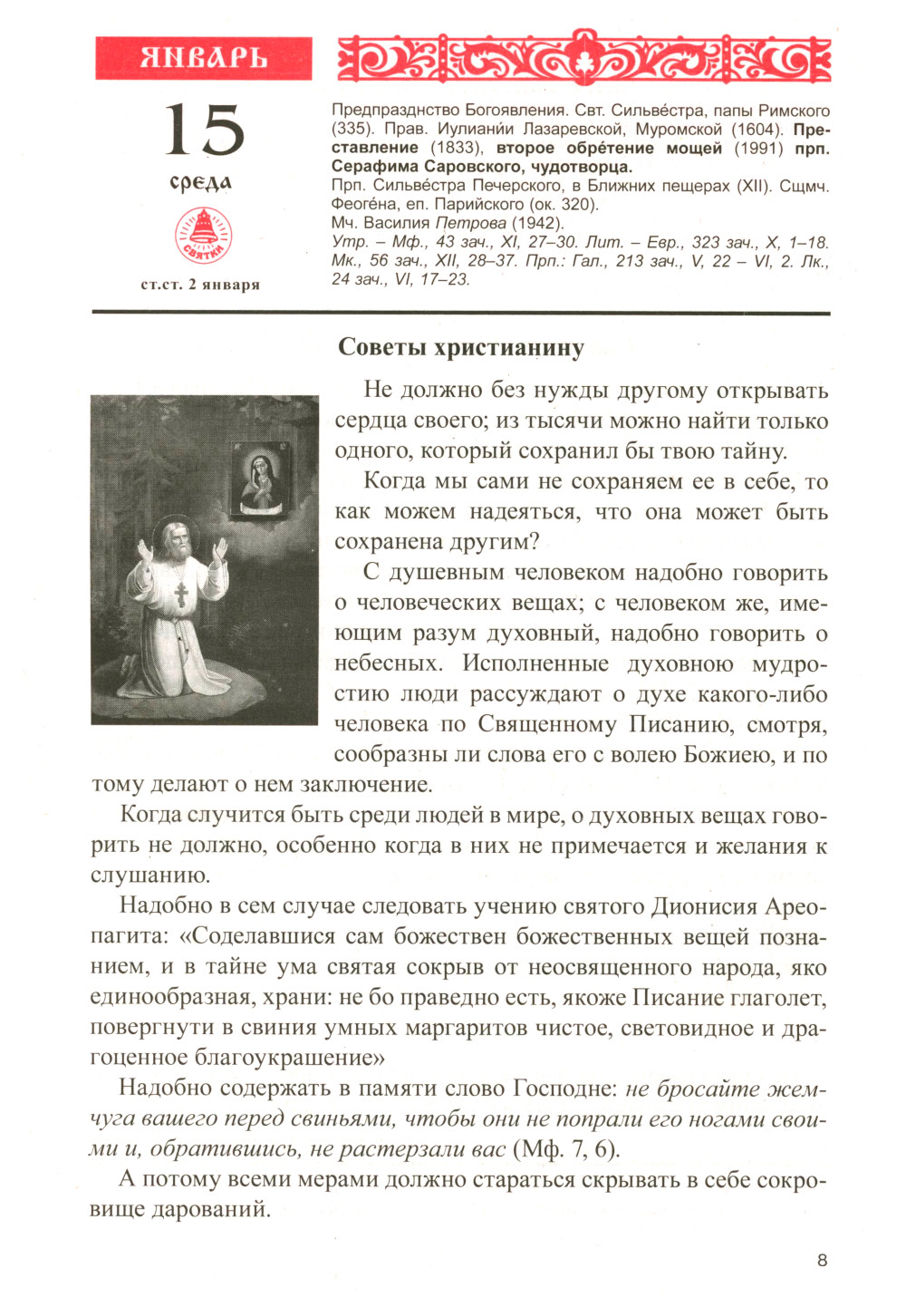 Православный церковный календарь содержит душеполезные чтения на каждый день года, выбранные из творений святых отцов, известных церковных проповедников и подвижников. По смыслу и объему текста статьи приспособлены для ежедневного прочтения и, как правило, относятся к событиям, празднуемым Церковью в этот день. При внимательном прочтении календарь поможет верующим глубже проникнуться духом церковного вероучения и смыслом ежедневной церковной жизни. Прилагаемая календарная сетка и указатель ежедневных чтений из Священного Писания соответствуют официальному церковному календарю.| Издательство | Синтагма |