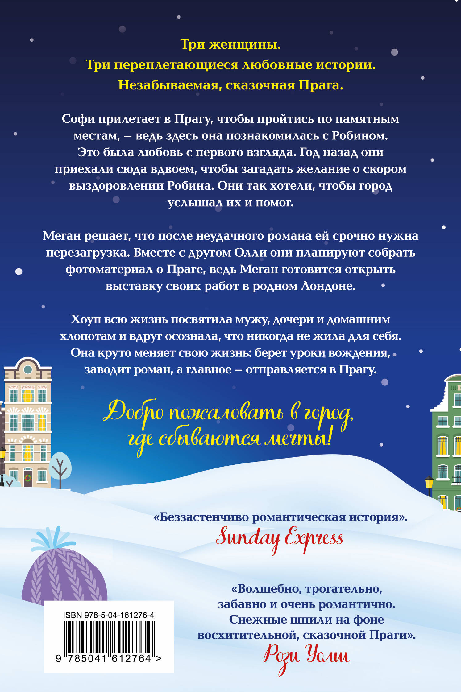 Три женщины.Три переплетающихся любовных истории. Один незабываемый, неподвластный времени город. Зимняя Прага, которая изменит жизнь раз и навсегда. Софи прилетает в Прагу, чтобы пройтись по памятным местам - ведь здесь она познакомилась с Робином. Это была любовь с первого взгляда. Год назад они приехали сюда вдвоем, чтобы загадать желание о скором выздоровлении Робина. Они так хотели, чтобы город услышал их и помог. Меган решает, что после неудачного романа ей срочно нужна перезагрузка. Вместе с другом Олли они планируют собрать фотоматериал о Праге, ведь Меган готовится открыть выставку своих работ в родном Лондоне. Хоуп всю жизнь посвятила мужу, дочери и домашним хлопотам и вдруг осознала, что никогда не жила для себя. Она круто меняет свою жизнь: берет уроки вождения, заводит роман, а главное - отправляется в Прагу. Три женщины. Три переплетающиеся любовные истории. Незабываемая, сказочная Прага. Добро пожаловать в город, где сбываются мечты! «Беззастенчиво романтическая история». - Sunday Express «Волшебно, трогательно, забавно и очень романтично. Снежные шпили на фоне восхитительной, сказочной Праги». - Рози Уолш «Если вы ищете первоклассную романтическую историю, остановитесь. Вы ее нашли». - Closer| Издательство | ООО "Издательство "Эксмо" |