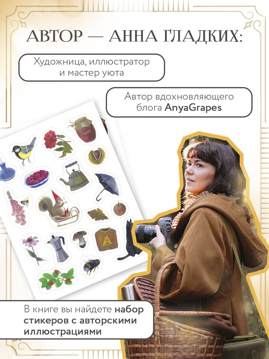 Аня Гладких - автор уютного блога anyagrapes, вдохновляющего сотни тысяч людей, художница и мастерица уюта. ВПУСТИТЕ В СВОЮ ЖИЗНЬ ОСЯЗАЕМОЕ ВОЛШЕБСТВО. Если в вихре ежедневных забот потерялось вдохновение, а мыслями завладела тревога - эта книга станет вашим маленьким помощником. С ней вы сможете ненадолго забыть о нескончаемом списке дел и суете больших городов и вернуть фокус к действительно важному. С этой книгой вы: • Перестанете грустить о лете и очаруетесь даже хмурым ноябрем. • Замедлитесь и погрузитесь в наблюдение за красотой природы. • Украсите дом к новому сезону без больших затрат. • Вдохновитесь на собственные праздничные традиции. *внутри книги вы найдете эксклюзивный набор стикеров с авторскими иллюстрациями| Издательство | ООО "Издательство "Эксмо" |