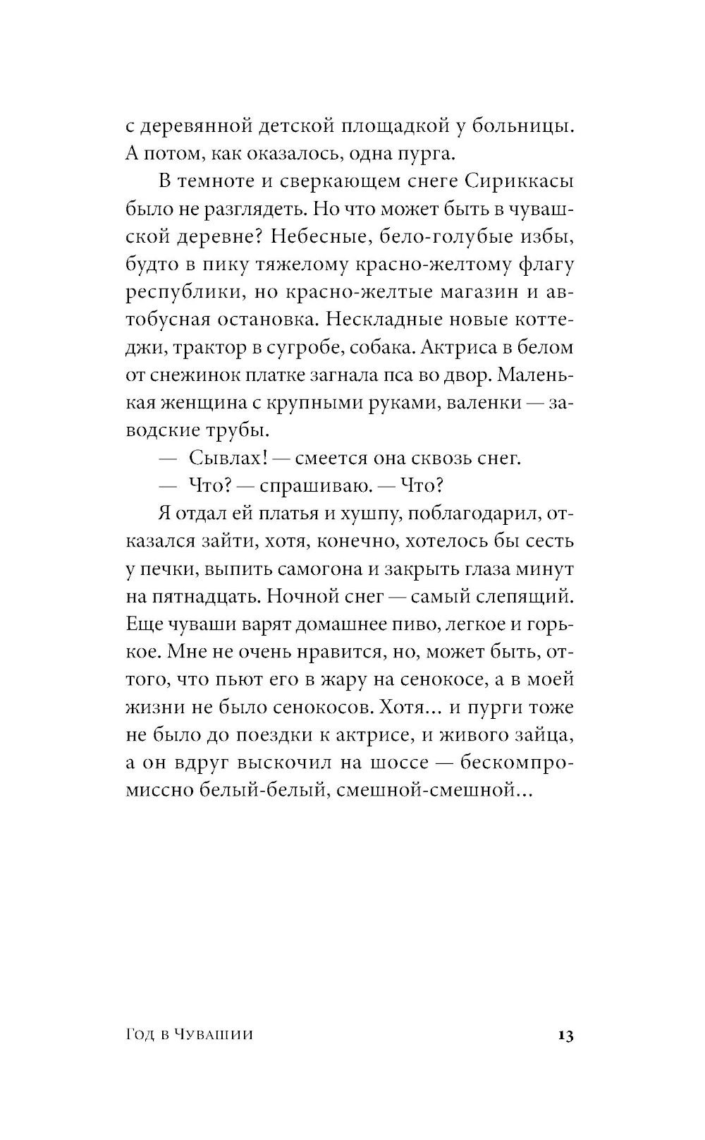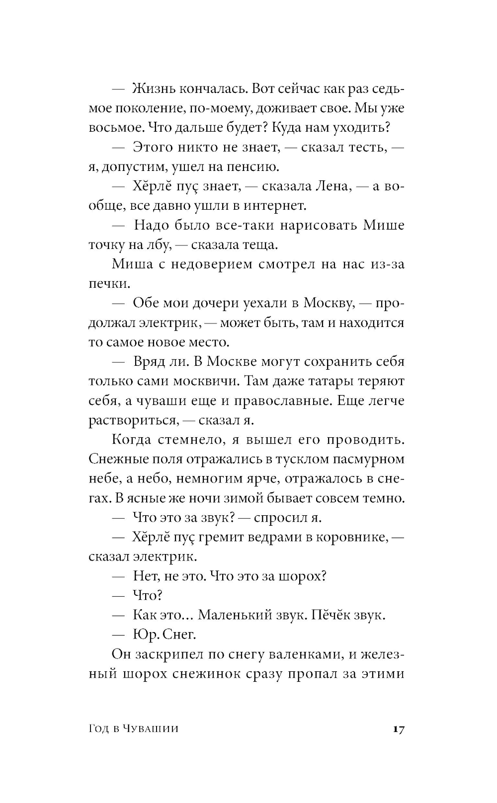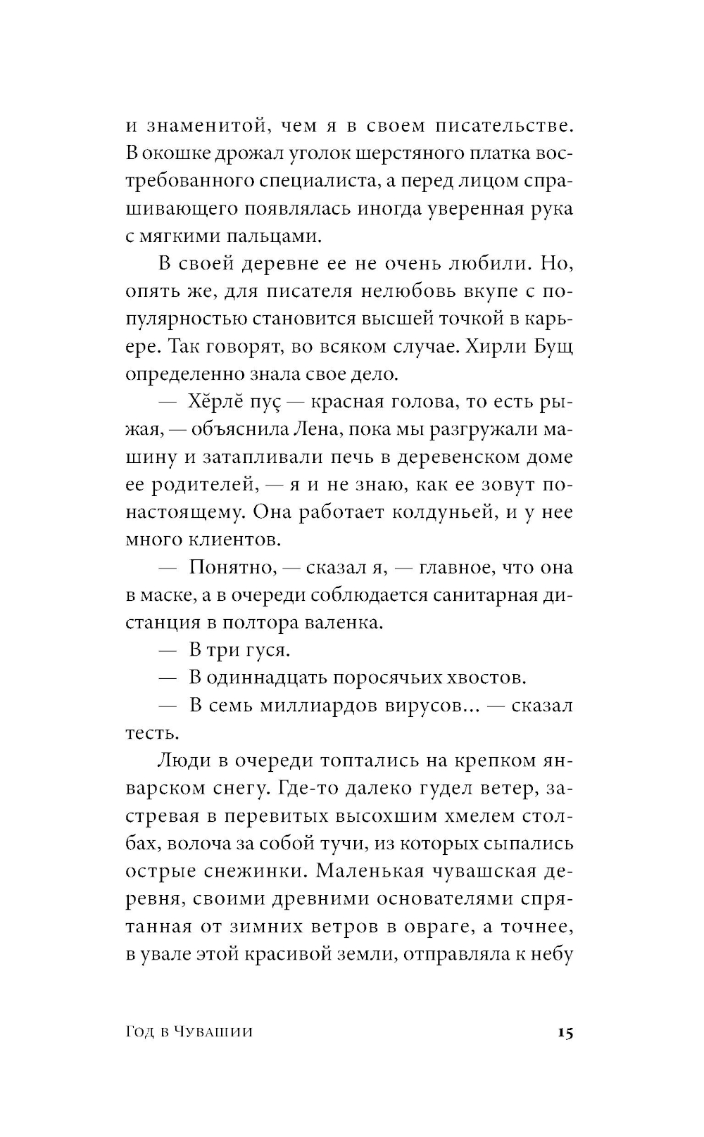 С наступлением пандемии главный герой переезжает из Москвы в Чебоксары к родственникам жены, где открывает для себя неразгаданный чувашский мир, скрытый от чужих под вуалью глобализации. Проводником становится его маленький сын, понимающий и одновременно не понимающий родные для себя русский и чувашский языки. Герой пытается объяснить истоки семейных отношений через рациональность и ментальность, но терпит неудачу, которая делает его счастливым. За неспешной историей, полной забавных диалогов и парадоксальных встреч, стоит сложность непережитого национального модерна с прозрачным флером прозы Бротигана.| Издательство | Альпина нон-фикшн |