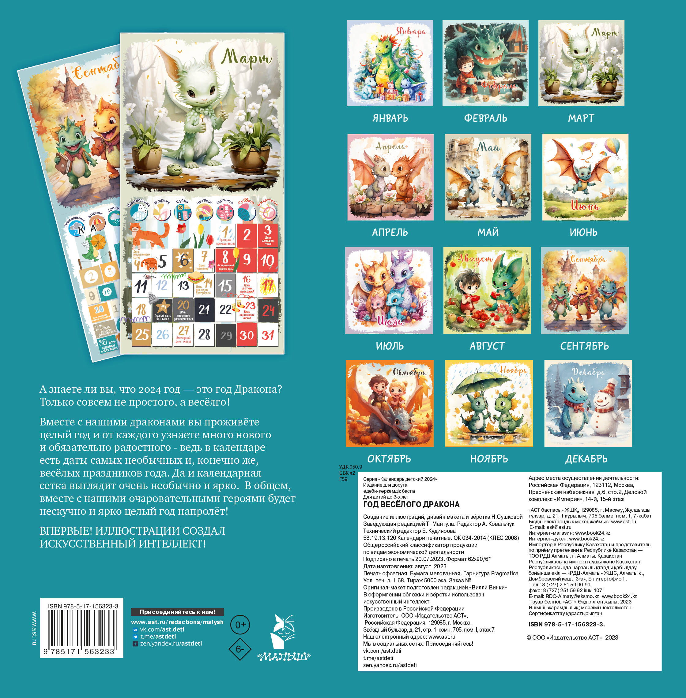 А знаете ли вы, что 2024 год - это год Дракона? Только совсем не простого, а весёлого! Вместе с нашими драконами вы проживёте целый год и от каждого узнаете много нового и обязательно радостного - ведь в календаре есть даты самых необычных и, конечно же, весёлых праздников года. Да и календарная сетка выглядит очень необычно и ярко. В общем, вместе с нашими очаровательными героями будет нескучно и ярко целый год напролёт! ВПЕРВЫЕ! ИЛЛЮСТРАЦИИ СОЗДАЛ ИСКУССТВЕННЫЙ ИНТЕЛЛЕКТ!| Издательство | ИЗДАТЕЛЬСТВО "АСТ" |