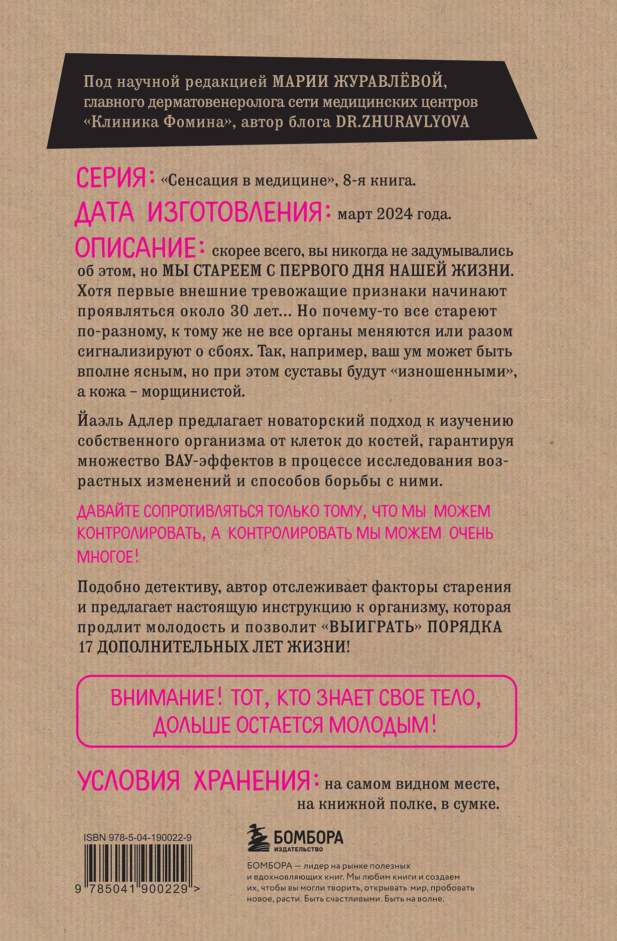 Все хотят дожить до старости, но никто не хочет стареть… Так как максимально долго оставаться молодым и здоровым? Ответ на этот вопрос знает эксперт по борьбе с возрастными изменениями и автор бестселлеров Йаэль Адлер. В этой книге известный врач не только собрала все знания о меняющемся с возрастом теле, но и поделилась практическими лайфхаками для повседневной жизни. «Годен до» - книга, гарантирующая сохранение свежести! «Мы не можем остановить биологические процессы, однако в наших силах на них повлиять. Сопротивляться нужно только тому, что мы можем контролировать, а контролировать мы можем очень многое!» - уверяет доктор медицинских наук Йаэль Адлер. Факты из книги, которые вас удивят: - в науке процесс старения иногда называют «дряхление»; - в мозге ежедневно умирает примерно 100 000 клеток; - существует теория, что у обладателей большого количества родинок длинные теломеры; - каждая клетка переживает примерно 70 000 повреждений ДНК в день просто потому, что мы живем; - агрессивные стареющие клетки в науке называются клетки-зомби; - влага в коже мужчин сохраняется дольше, поэтому с морщинами они не сталкиваются дольше; - с возрастом притупляется чувствительность к кислым и горьким компонентам пищи, поэтому пожилые леди и джентльмены так любят есть сладкие и соленые блюда; - употребление пищевых добавок в течение длительного периода времени, вероятнее всего, сократит жизнь, а не продлит ее.| Издательство | ООО "Издательство "Эксмо" |