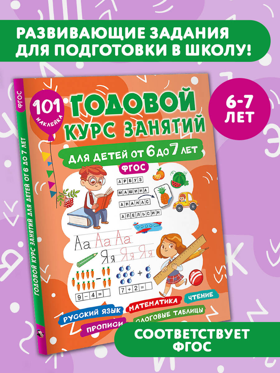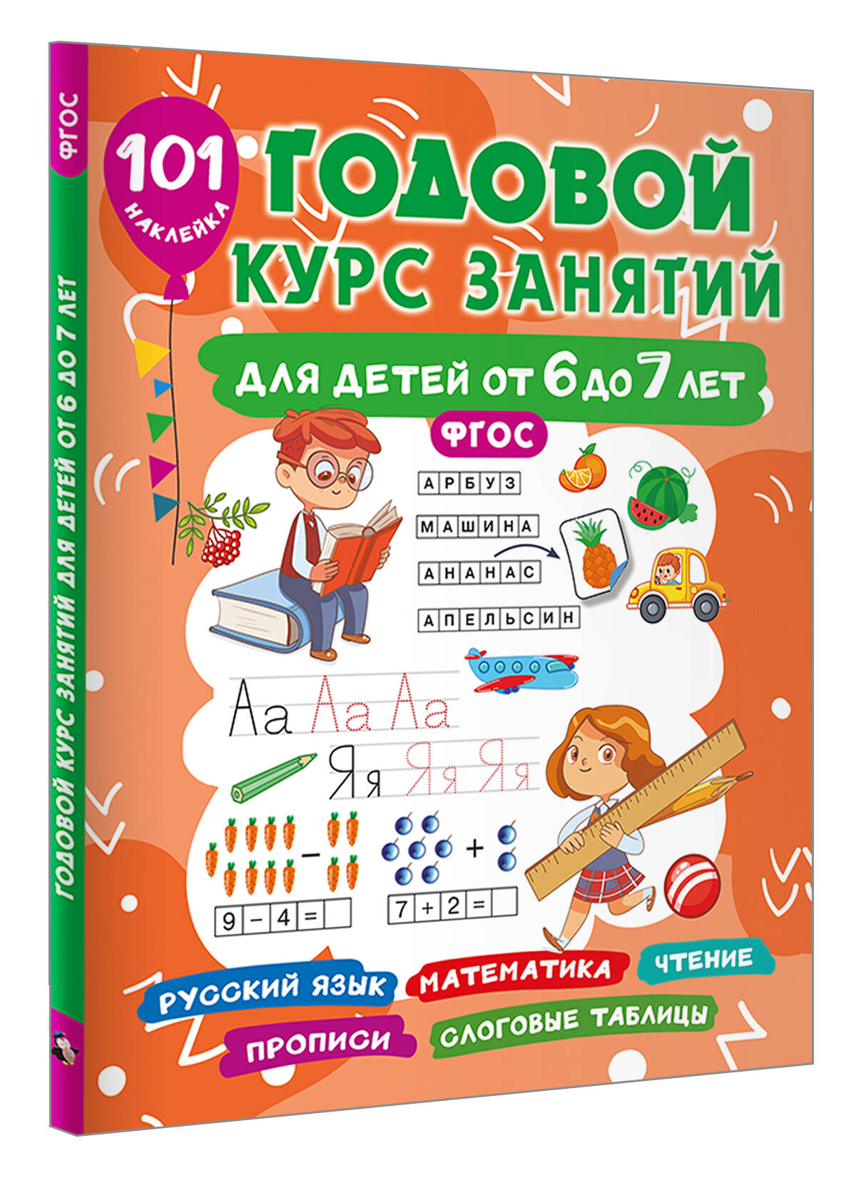 Скоро в школу? Волнуетесь, готов ли ребёнок? Достаточно ли у него знаний? В нашей книге вы найдёте ответы на эти вопросы. «Годовой курс занятий для детей от 6 до 7 лет. 101 наклейка» - отличный выбор заботливых родителей. Наш курс соответствует требованиям нового Федерального государственного образовательного стандарта дошкольного образования, что гарантирует эффективное обучение и полноценное развитие вашего ребёнка. Малыш потренируется писать, читать и пересказывать, пополнит словарный запас, освоит слоговые таблицы, поиграет в игры с буквами и звуками, познакомится с цифрами и математическими знаками, научится решать простые примеры и задачи. Все эти умения и навыки - необходимое условие для успешного обучения в школе. Занимательные задания на 128 страницах с яркими иллюстрациями и полезными наклейками обязательно заинтересуют вашего ребёнка. Мы учли все интеллектуальные и психологические особенности детей 6-7 лет и сделали обучающий материал максимально лёгким для восприятия и понимания. Закажите наш годовой курс занятий прямо сейчас и подарите своему ребёнку возможность стать успешным в школе и в жизни!| Издательство | Издательство "АСТ" |