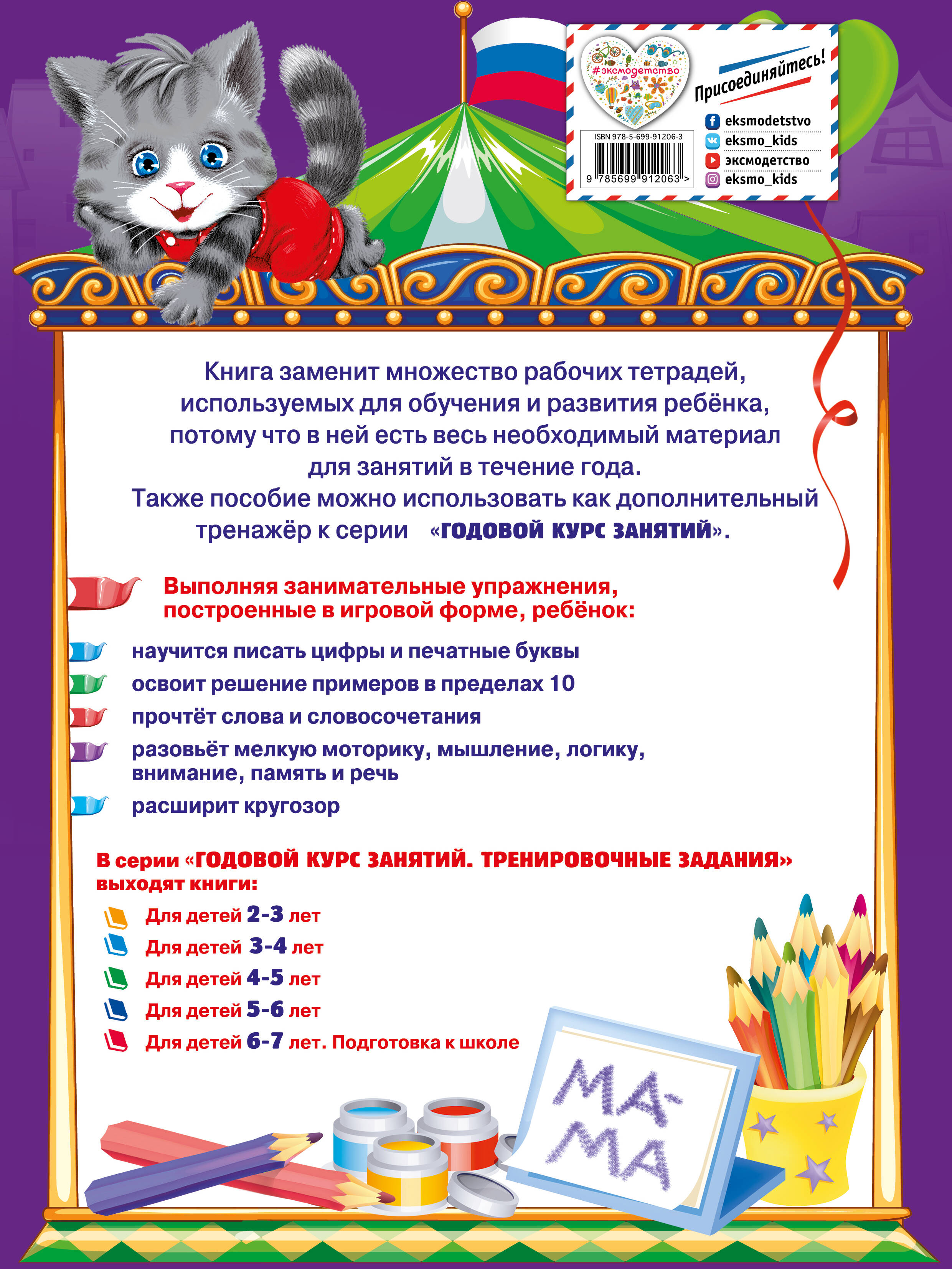 Годовой курс тренировочных занятий заменит множество рабочих тетрадей, необходимых для интеллектуального развития ребенка в течение года. Выполняя игровые занимательные упражнения вместе со взрослыми, ребенок получит весь необходимый для своего возраста объем знаний, умений и навыков, научится считать и решать простые примеры в пределах 10, писать цифры и печатные буквы, читать слоги и слова, разовьет память, внимание, речь, мышление, воображение. Кроме того, книга поможет родителям привить малышу интерес к обучению.| Издательство | ООО "Издательство "Эксмо" |