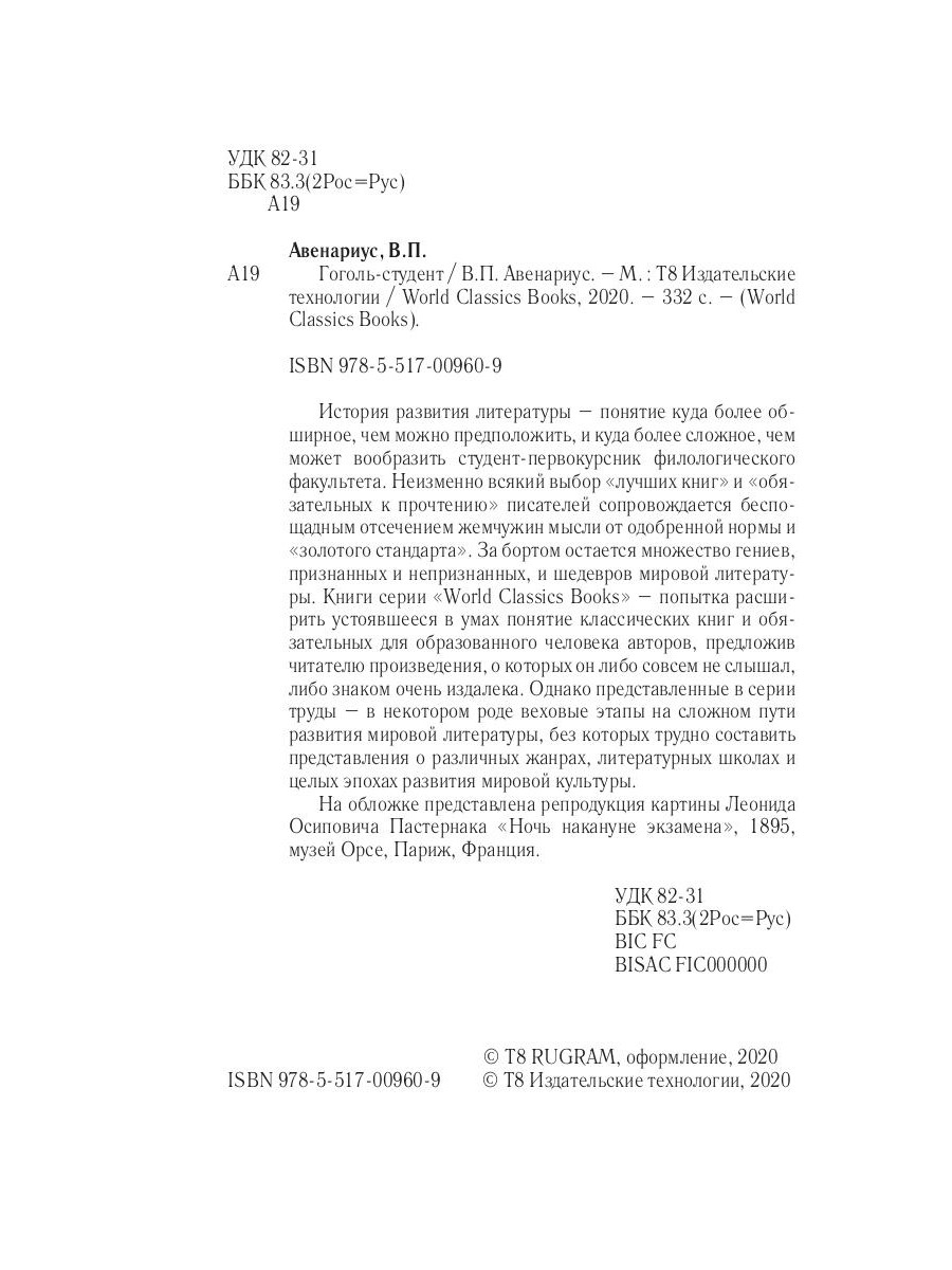 История развития литературы - понятие куда более обширное, чем можно предположить, и куда более сложное, чем может вообразить студент-первокурсник филологического факультета. Неизменно всякий выбор «лучших книг» и «обязательных к прочтению» писателей сопровождается беспощадным отсечением жемчужин мысли от одобренной нормы и «золотого стандарта». За бортом остается множество гениев, признанных и непризнанных, и шедевров мировой литературы. Книги серии «World Classics Books» - попытка расширить устоявшееся в умах понятие классических книг и обязательных для образованного человека авторов, предложив читателю произведения, о которых он либо совсем не слышал, либо знаком очень издалека. Однако представленные в серии труды - в некотором роде веховые этапы на сложном пути развития мировой литературы, без которых трудно составить представления о различных жанрах, литературных школах и целых эпохах развития мировой культуры. На обложке представлена репродукция картины Леонида Осиповича Пастернака «Ночь накануне экзамена», 1895, музей Орсе, Париж, Франция.| Издательство | Т8 RUGRAM |