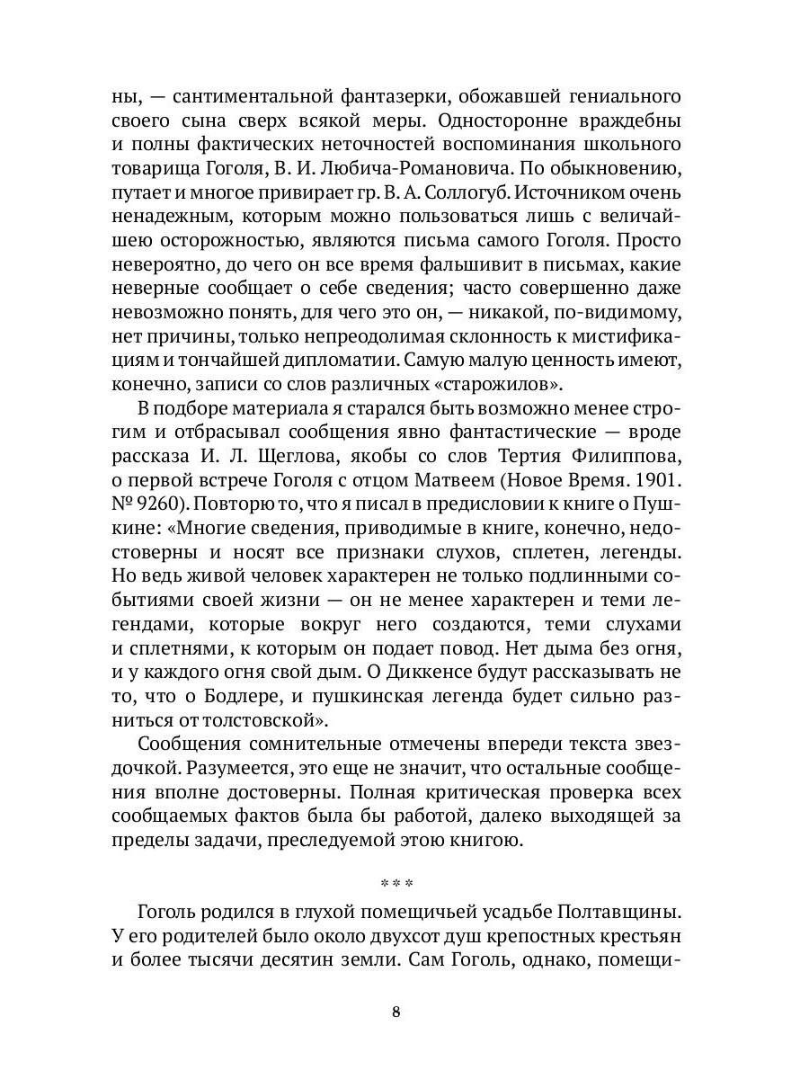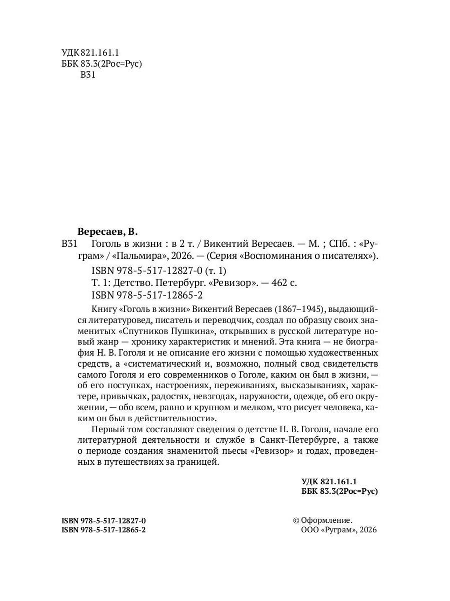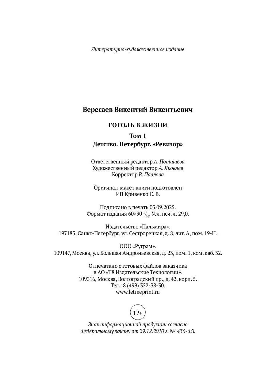 Книгу «Гоголь в жизни» Викентий Вересаев (1867-1945), выдающийся литературовед, писатель и переводчик, создал по образцу своих знаменитых «Спутников Пушкина», открывших в русской литературе новый жанр - хронику характеристик и мнений. Эта книга - не биография Н. В. Гоголя и не описание его жизни с помощью художественных средств, а «систематический и, возможно, полный свод свидетельств самого Гоголя и его современников о Гоголе, каким он был в жизни, - об его поступках, настроениях, переживаниях, высказываниях, характере, привычках, радостях, невзгодах, наружности, одежде, об его окружении, - обо всем, равно и крупном и мелком, что рисует человека, каким он был в действительности». Первый том составляют сведения о детстве Н. В. Гоголя, начале его литературной деятельности и службе в Санкт-Петербурге, а также о периоде создания знаменитой пьесы «Ревизор» и годах, проведенных в путешествиях за границей.| Издательство | Т8 RUGRAM |