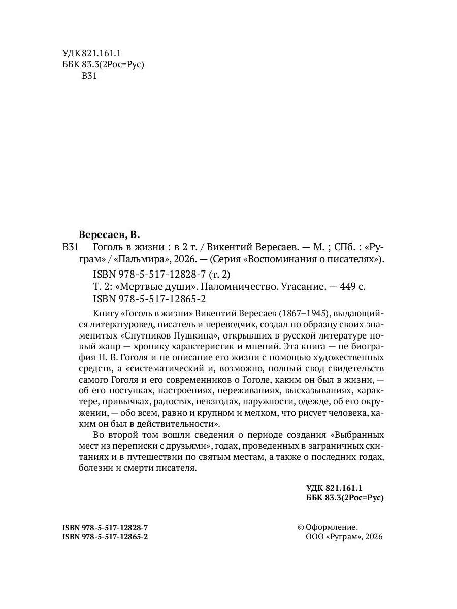 Книгу «Гоголь в жизни» Викентий Вересаев (1867-1945), выдающийся литературовед, писатель и переводчик, создал по образцу своих знаменитых «Спутников Пушкина», открывших в русской литературе новый жанр - хронику характеристик и мнений. Эта книга - не биография Н. В. Гоголя и не описание его жизни с помощью художественных средств, а «систематический и, возможно, полный свод свидетельств самого Гоголя и его современников о Гоголе, каким он был в жизни, - об его поступках, настроениях, переживаниях, высказываниях, характере, привычках, радостях, невзгодах, наружности, одежде, об его окружении, - обо всем, равно и крупном и мелком, что рисует человека, каким он был в действительности». Во второй том вошли сведения о периоде создания «Выбранных мест из переписки с друзьями», годах, проведенных в заграничных скитаниях и в путешествии по святым местам, а также о последних годах, болезни и смерти писателя.| Издательство | Т8 RUGRAM |
