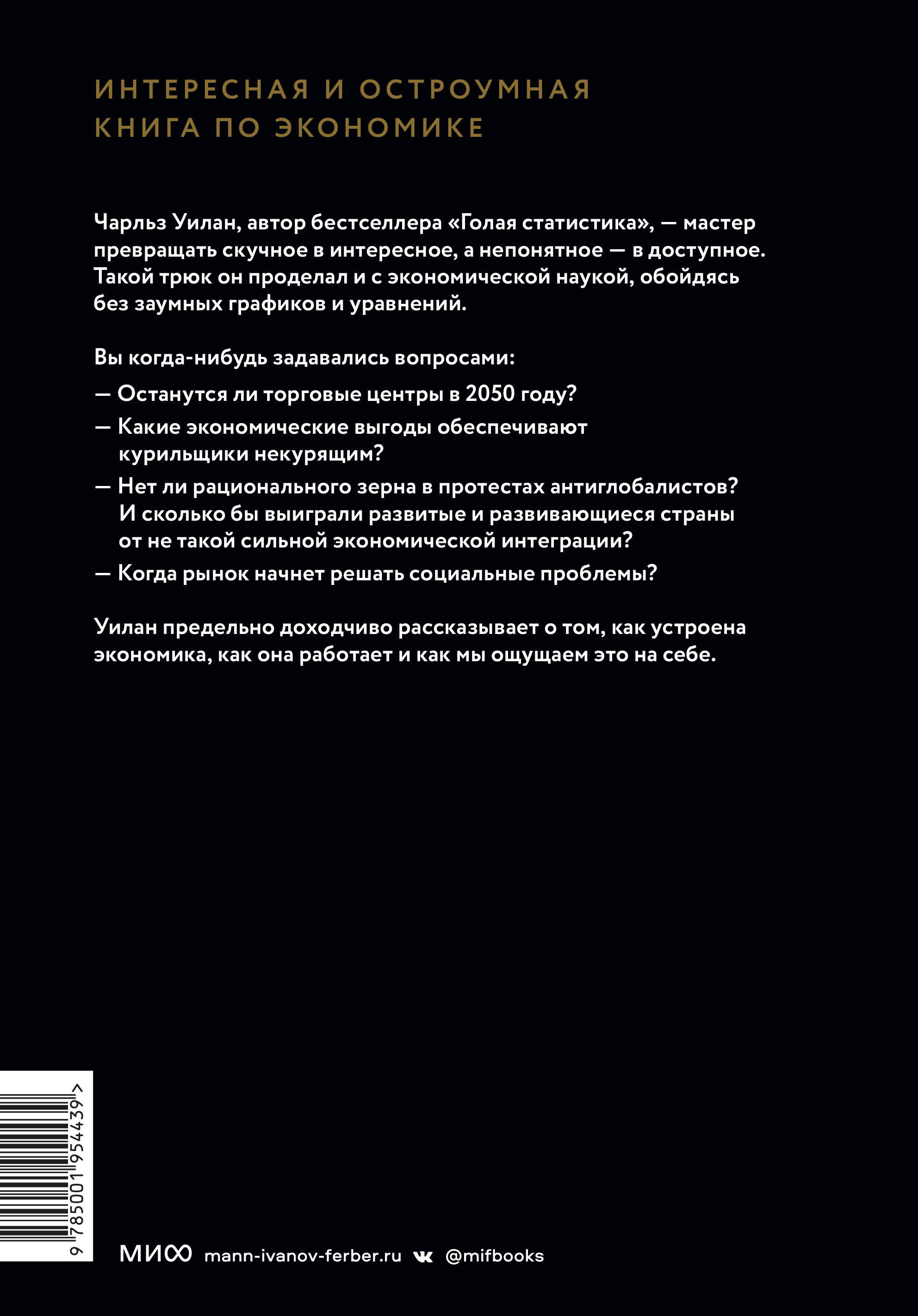 Интересная, веселая, умная и понятная книга по экономике. Чарльз Уилан, автор бестселлера "Голая статистика" - мастер в том, чтобы превращать скучное и непонятное в интересное и доступное. В этой книге он проделал такой трюк с экономикой, обойдясь без заумных графиков и уравнений. Увы, у экономики неидеальная репутация: если вы учили ее в университете, то на занятиях и экзаменах вы скорее обсуждали модели, диаграммы и уравнения, чем то, почему базовые экономические законы предрекали неизбежность распада СССР (распределение ресурсов при отсутствии системы ценообразования в долгосрочной перспективе оказалось поистине непосильной задачей), какие экономические выгоды обеспечивают курильщики некурящим людям (они раньше умирают, и остальные могут рассчитывать на большие социальные и пенсионные выплаты), или почему более щедрые пособия по уходу за новорожденным в реальности вредны для женщин (из-за них работодатели нередко дискриминируют молодых соискательниц вакансий). Вас когда-нибудь мучил вопрос, нет ли рационального зерна в протестах антиглобалистов и не правы ли они в том, что народы развитых или развивающихся стран, возможно, выиграли бы от менее мощной экономической интеграции? Уилан предельно полно и на удивление доходчиво расскажет и об этом. Вам интересно, почему Бена Бернанке часто называют вторым по влиятельности человеком в США? Уилан раскроет тайну эффекта, оказываемого денежно-кредитной политикой на экономическую активность. Читая в газетах о жарких дебатах по текущим экономическим проблемам, не приходилось ли вам недоумевать и поражаться жуткой какофонии мнений и аргументов, высказываемых спорщиками? Уилан проведет детальный разбор специальных терминов, разложит по полочкам политические аспекты доводов и доберется до самой сути каждой из этих проблем. 3 причины прочитать эту книгу 1. Книга входит в список 100 лучших бизнес-книг всех времен и народов. 2. Вы сможете познакомиться с основами экономики, наслаждаясь интересным чтением. 3. Книга написана автором лучшей нон-фикшн книги ("Голая статистика") 2016 года (по версии "Афиши"). Для кого эта книга: Для всех, кто интересуется экономикой и мечтает разобраться в ней.