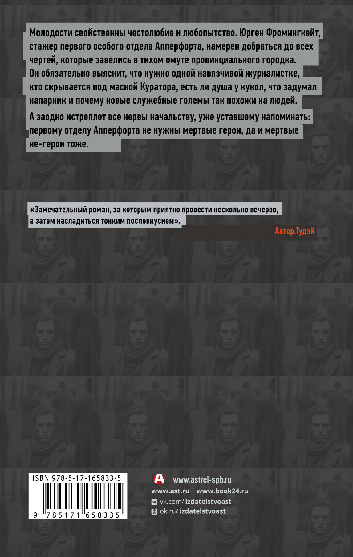 Молодости свойственны честолюбие и любопытство. Юрген Фромингкейт, стажер первого особого отдела Апперфорта, намерен добраться до всех чертей, которые завелись в тихом омуте провинциального городка. Он обязательно выяснит, что нужно одной навязчивой журналистке, кто скрывается под маской Куратора, есть ли душа у кукол, что задумал напарник и почему новые служебные големы так похожи на людей. А заодно истреплет все нервы начальству, уже уставшему напоминать: первому отделу Апперфорта не нужны мертвые герои, да и мертвые не-герои тоже.| Издательство | Издательство "АСТ" |